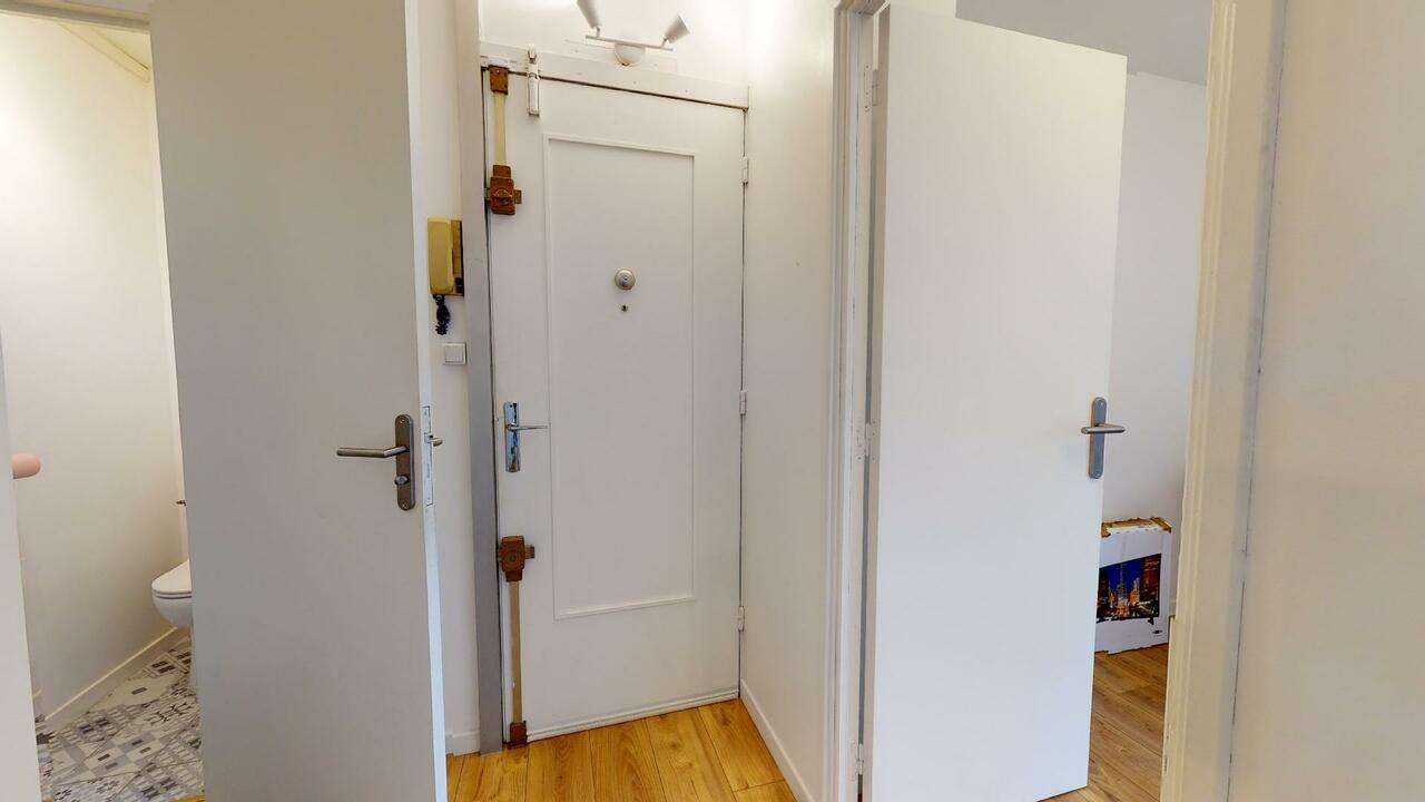 La porte d’entrée de cette colocation s’ouvre sur un sas d’entrée qui dessert notamment les WC séparés et la salle de bain avec grande douche et meuble vasque.