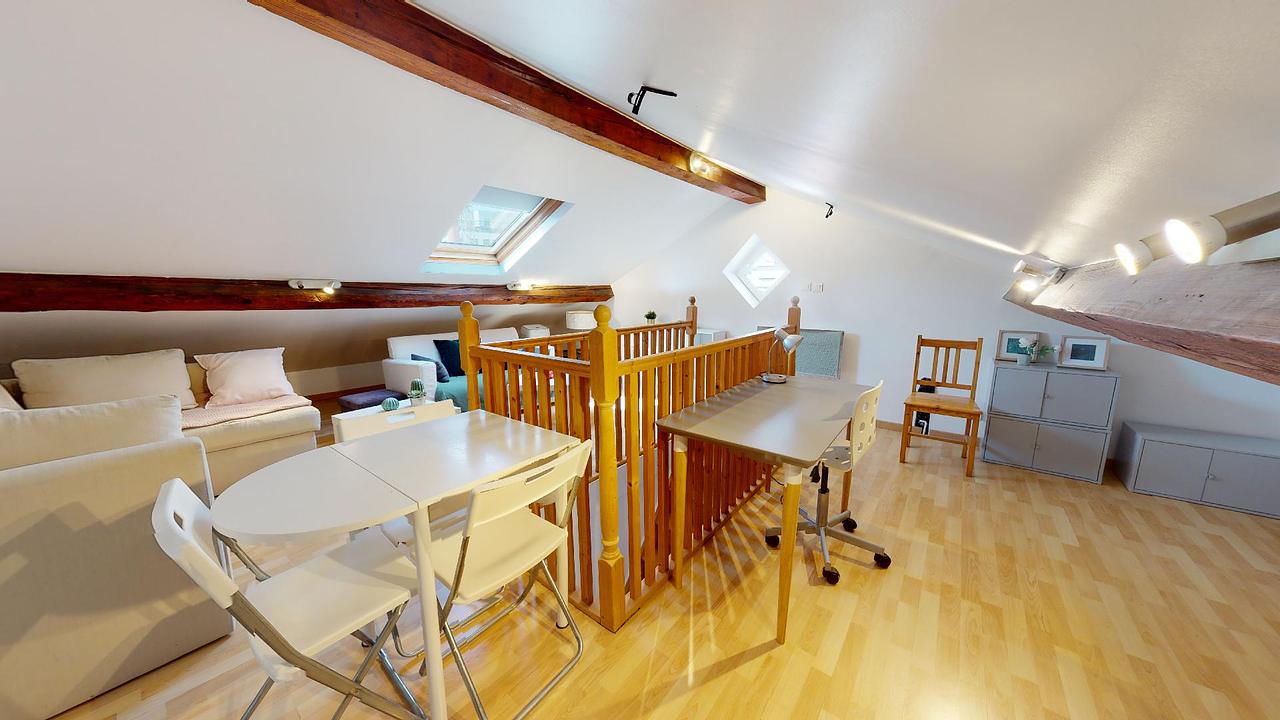 Dans cet appartement très lumineux grâce à ses velux, tout est propice à la détente avec deux canapés convertibles, deux tables basses et meubles de rangement ainsi qu’au travail avec un bureau et sa chaise.