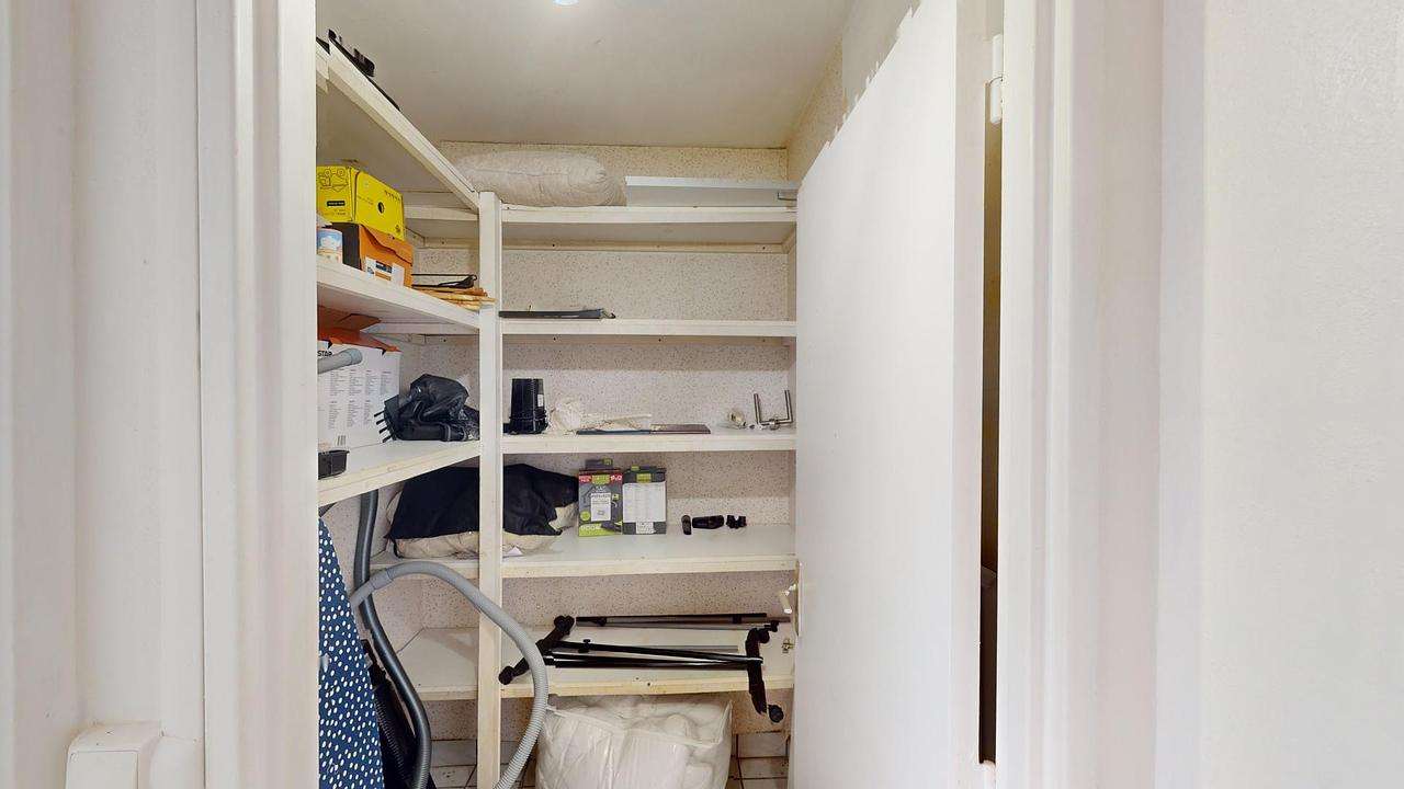 L'appartement s'ouvre sur une entrée avec rangements desservant un lumineux séjour. Celui-ci dispose d'un canapé, de tables basses, d'un meuble TV avec TV, d'une table avec 4 chaises et des rangements.