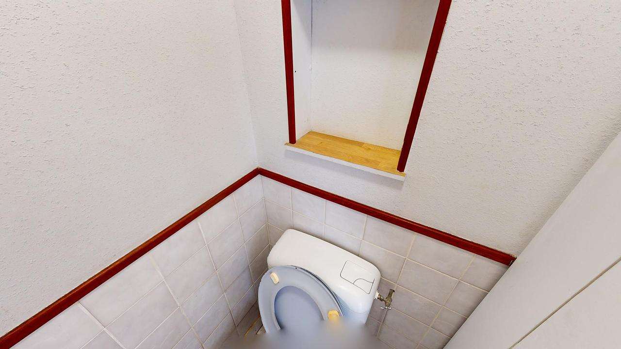 La salle de bain comprend une double-vasque, une douche, un miroir et un sèche-serviette. Les toilettes sont séparés.
