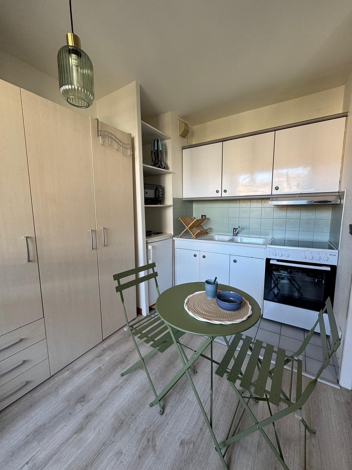 Ce charmant T1 se distingue par sa luminosité et son agencement optimisé. La pièce de vie principale constitue un espace polyvalent et chaleureux, agrémenté d'un canapé confortable, d'une grande télévision pour vos moments de détente et d'un véritable espace nuit avec rangements intégrés.
