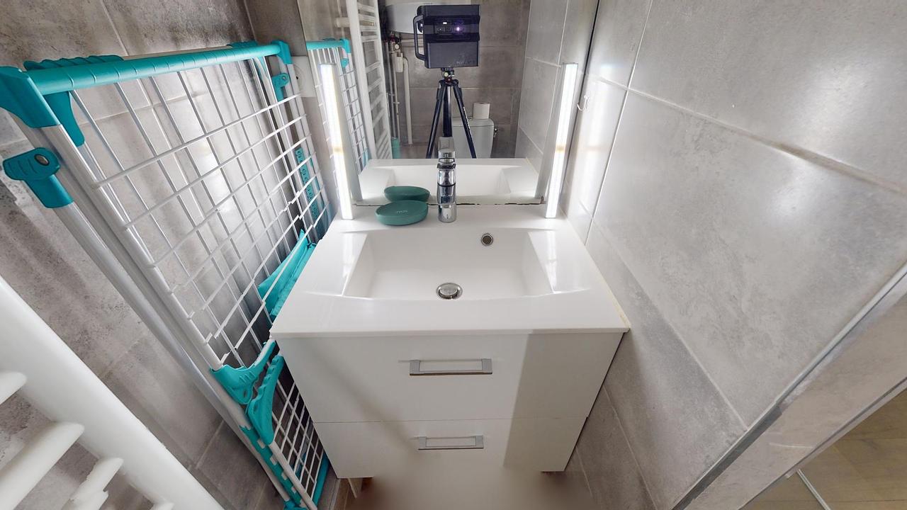 La salle d'eau comprend une douche, un meuble vasque, un miroir et des WC.