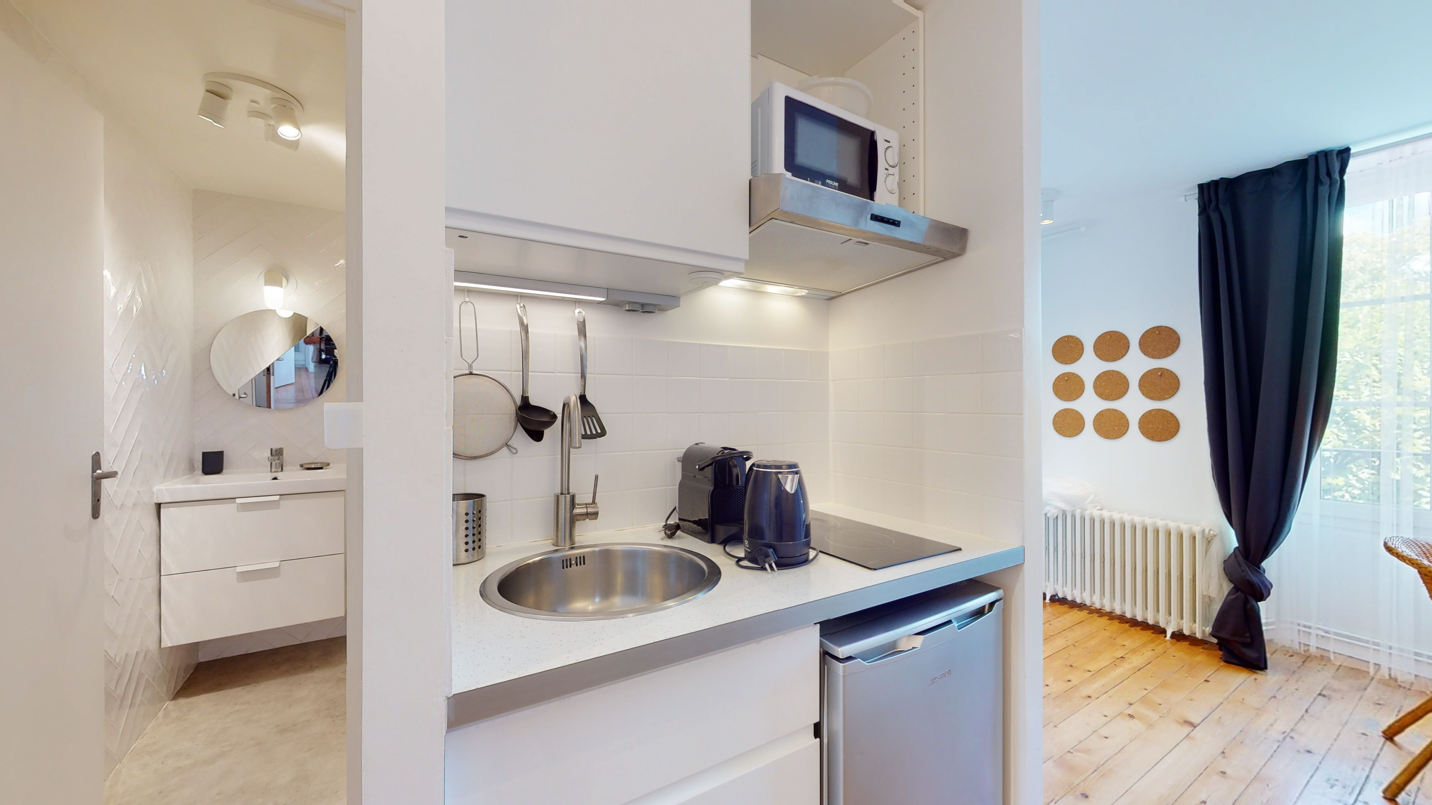 Le Studio 12, situé au 2ème étage, est un espace privé et confortable de 17m² conçu pour une personne. Il comprend une cuisine équipée avec micro-ondes, plaques de cuisson et réfrigérateur, ainsi qu'une salle de bain privée avec douche. Le studio est meublé d’un lit double avec rangements intégrés, d’une penderie spacieuse, d’un fauteuil confortable et d’une table pratique pour travailler ou prendre vos repas.