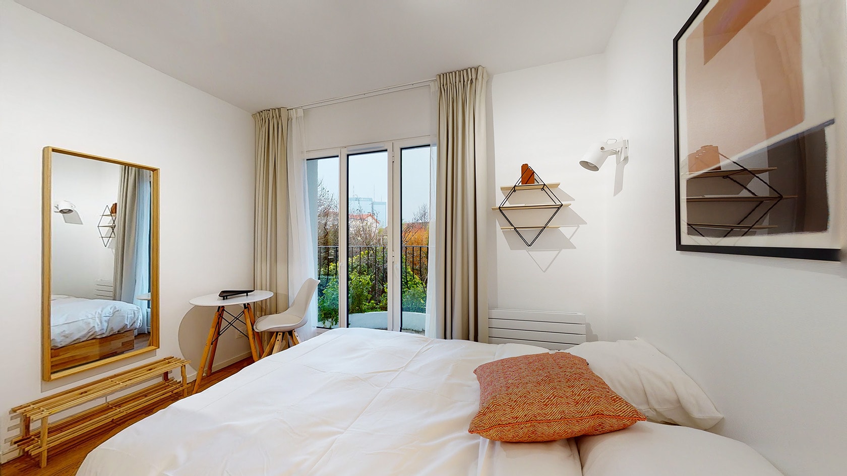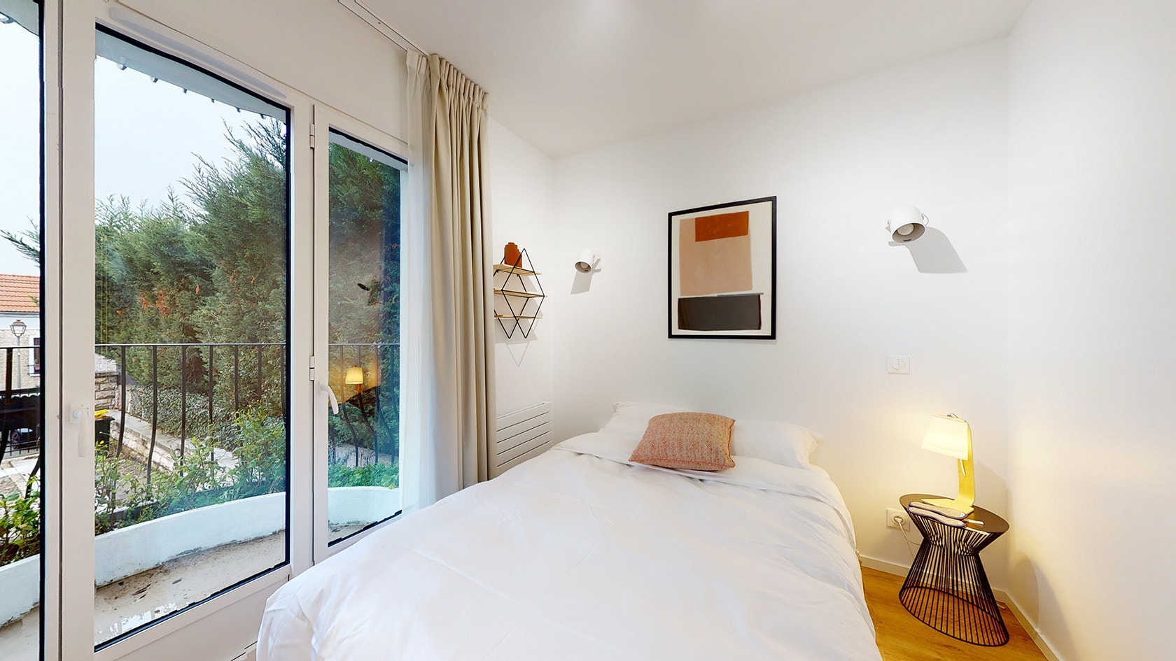 La Chambre 4 est un cocon parfait pour une personne. Située au rez-de-chaussée, elle dispose d'une salle de bain privée avec douche et lavabo. Le confort n'est pas en reste grâce à un lit double doté d'une literie de qualité, une penderie pour vos affaires, une table et une chaise pour travailler ou écrire. Et pour les amateurs d'air frais, un petit balcon arrondi vous permet de profiter de l'extérieur sans quitter votre chambre.