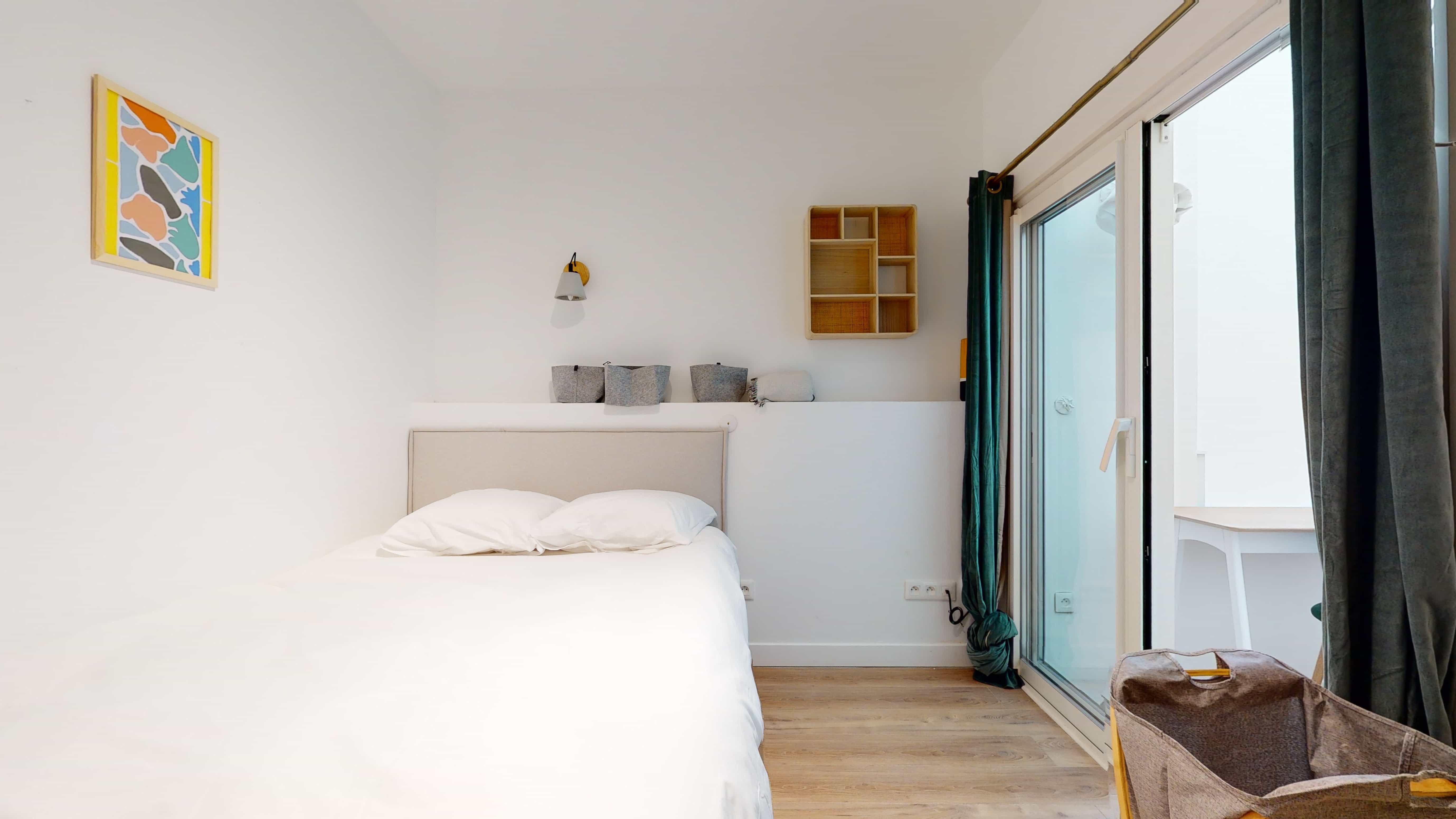 Votre future chambre, nommée "Room for one person - 12", est un cocon de 12m² situé au deuxième étage. Elle est parfaitement équipée pour votre confort avec un lit double doté de literie de qualité, une armoire pour vos affaires, un bureau et une chaise pour travailler ou étudier dans les meilleures conditions. La salle de bain privative comprend une douche, un lavabo et des toilettes. De plus, la chambre est chauffée par un radiateur pour garder une température agréable toute l'année.