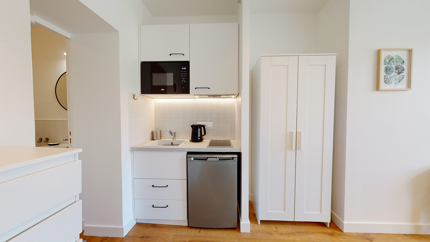 Le Studio 10, situé au premier étage, est un cocon parfait pour une personne. Il dispose d'une salle de bains privée avec douche et lavabo, ainsi que d'un coin grignotage pratique. Le studio est meublé d'un lit double confortable avec rangement intégré, d'une penderie pour vos vêtements, d'une table et de deux chaises pour vos moments de détente ou de travail. Vous y trouverez également tout le nécessaire pour préparer vos boissons et repas légers : micro-ondes, plaques de cuisson, réfrigérateur, bouilloire et machine à café.