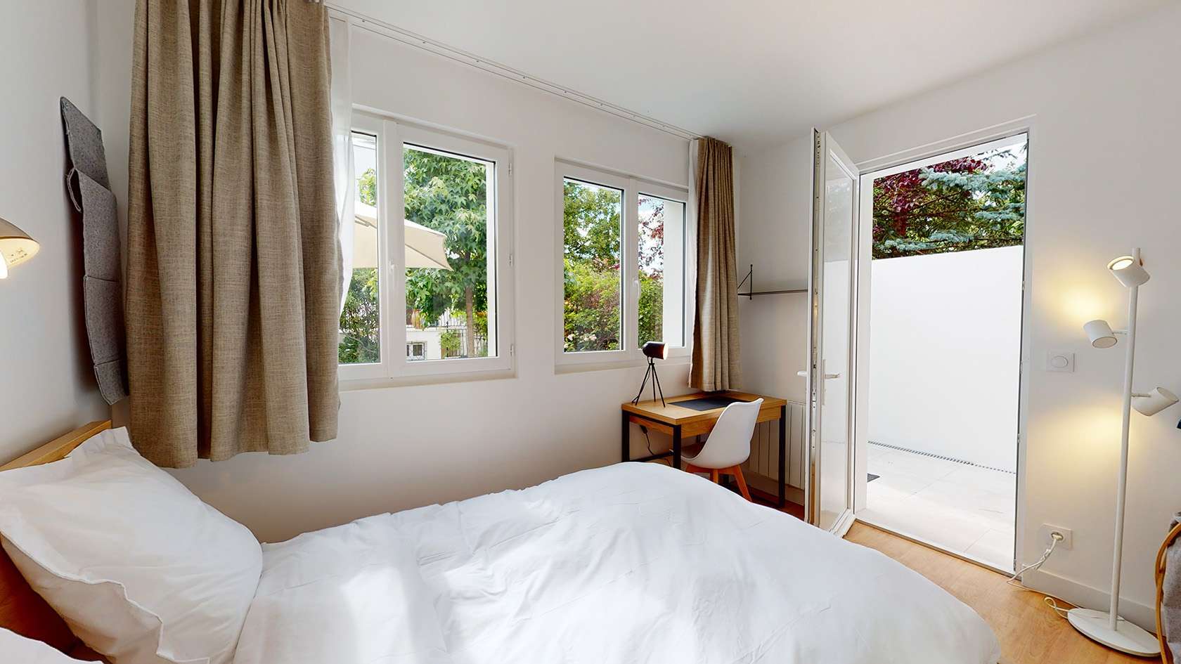 Le Studio 6 est idéal pour une personne cherchant son petit cocon. Situé au rez-de-chaussée, il offre une vue agréable sur le jardin et un accès direct à la terrasse. Ce studio est équipé d'un lit double avec rangement intégré, d'une penderie pour vos vêtements, d'une table et d'une chaise pour travailler ou manger. Vous disposerez aussi d'une salle de bains privée avec douche et lavabo. Pour vos petits encas, un coin grignotage avec bouilloire, micro-ondes, réfrigérateur et vaisselle est à votre disposition.