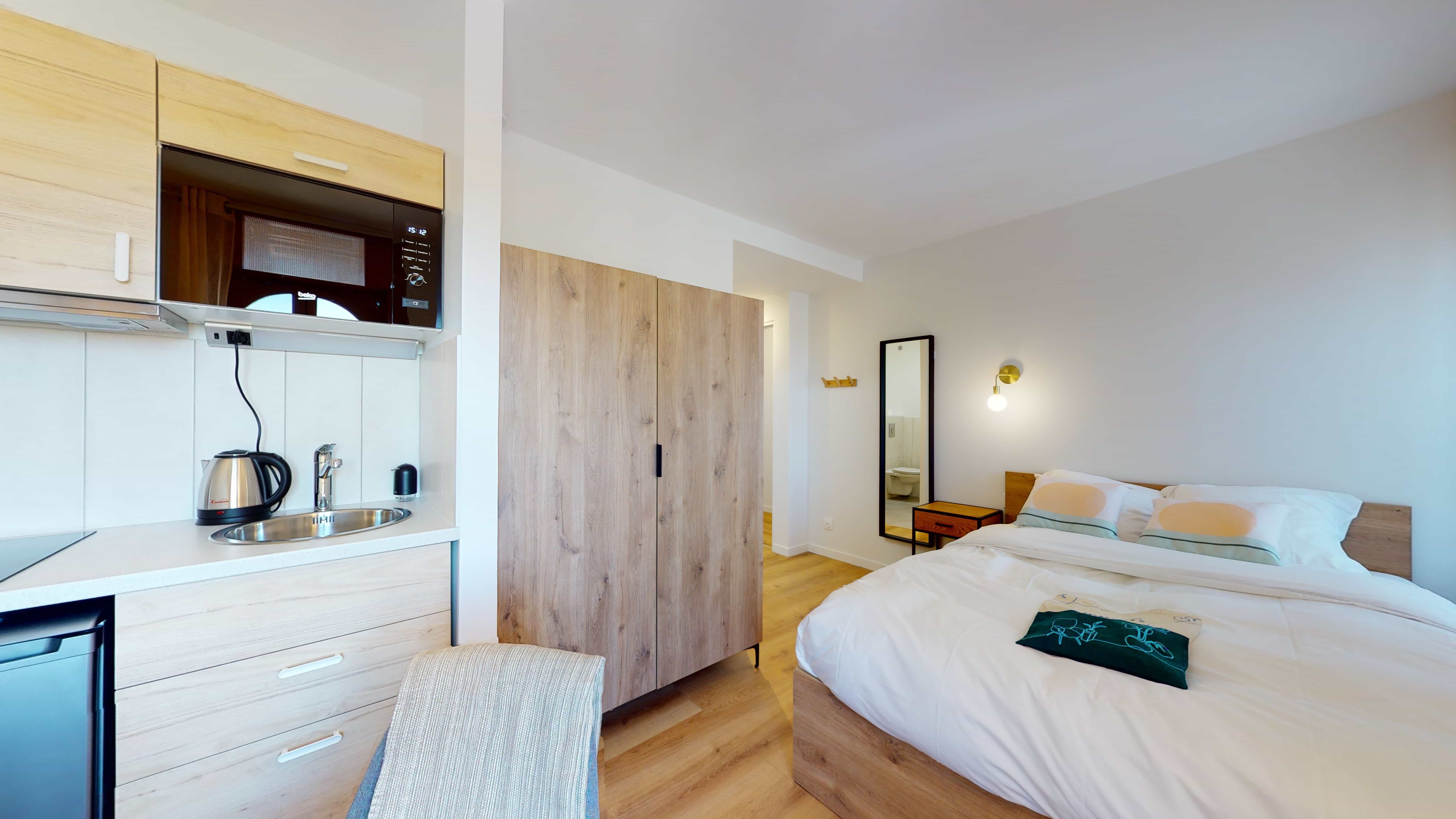Le studio pour une personne "Studio for one person - 12", situé au 2e étage, est un cocon de 17m² parfaitement aménagé pour votre confort. Il dispose d'une salle de bain privée, d'une kitchenette équipée pour préparer vos repas en toute intimité, d'un lit avec rangement double, d'un bureau pour travailler ou étudier, et d'une penderie pour vos vêtements. La qualité de la literie et le soin apporté aux détails font de ce studio un lieu agréable à vivre.