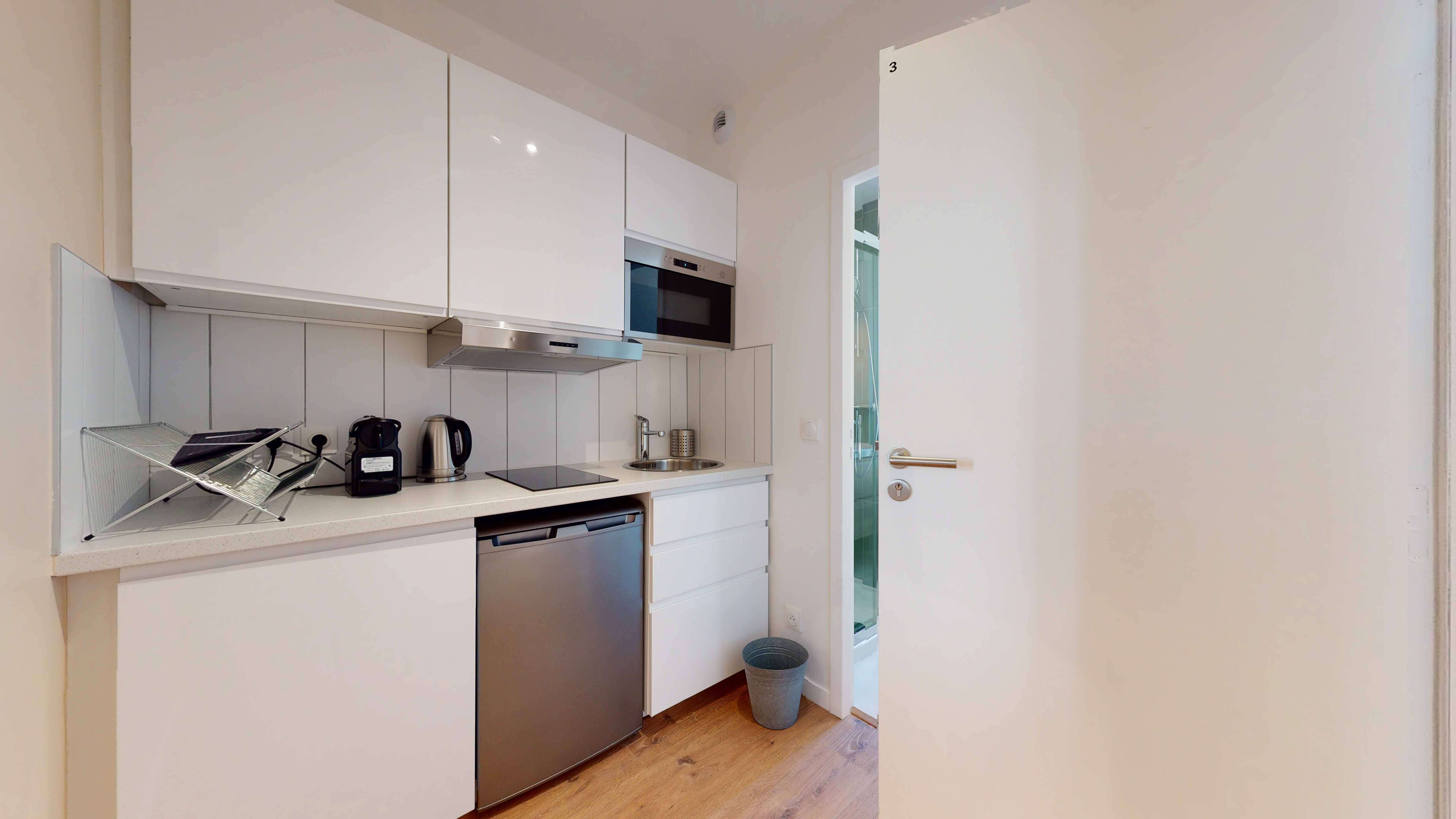 Le Studio for one person - 3, situé au rez-de-chaussée, est un espace privé de 17m² conçu pour le confort d'une personne. Il dispose d'une salle de bain personnelle et d'une kitchenette équipée d'un mini frigo, d'un micro-onde, de plaques de cuisson et d'une hotte. Vous y trouverez aussi tout le nécessaire pour cuisiner et manger. Le studio est meublé avec un lit doté d'un rangement intégré, une chaise confortable, un bureau pratique pour travailler et une penderie pour vos vêtements.