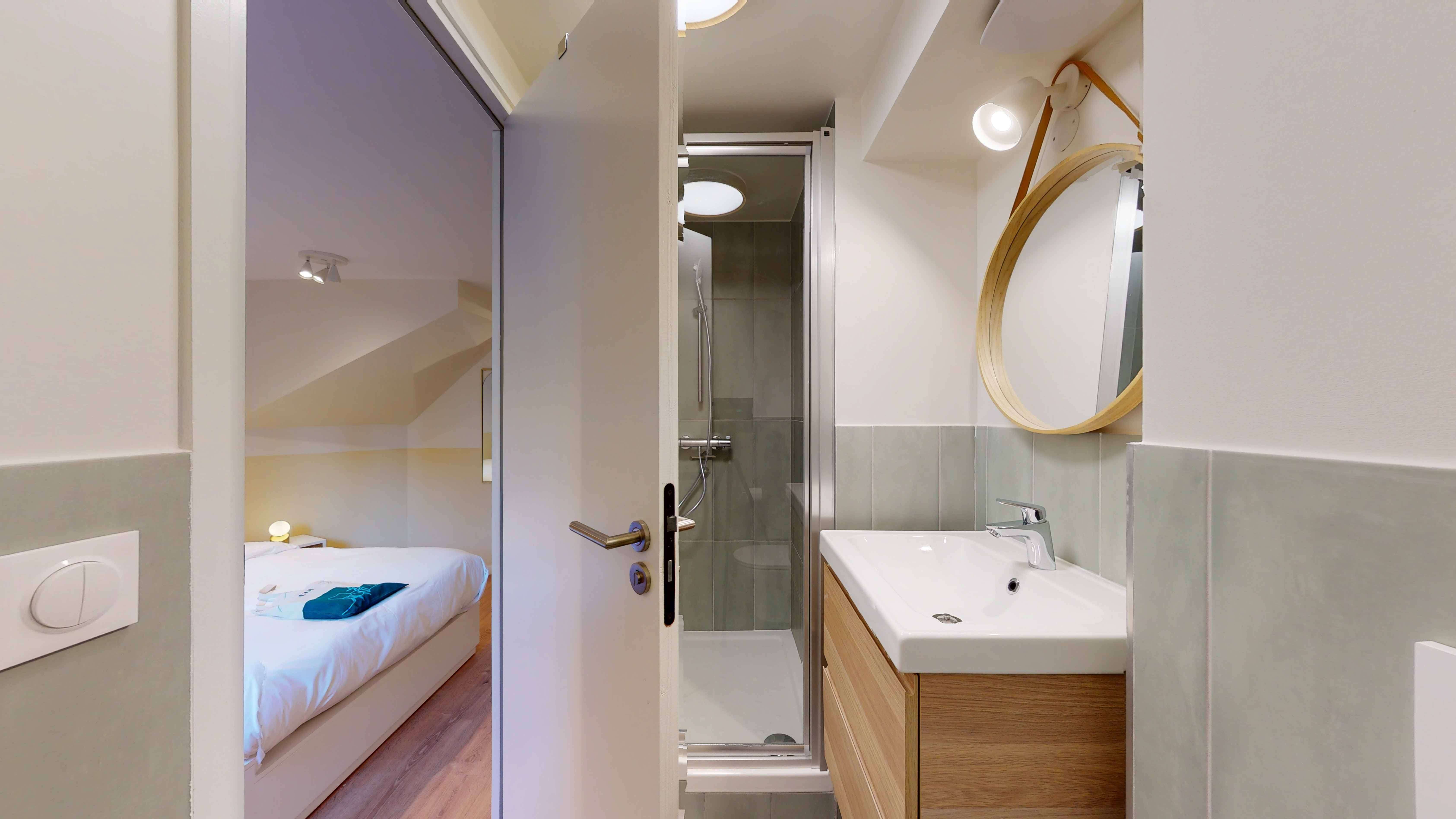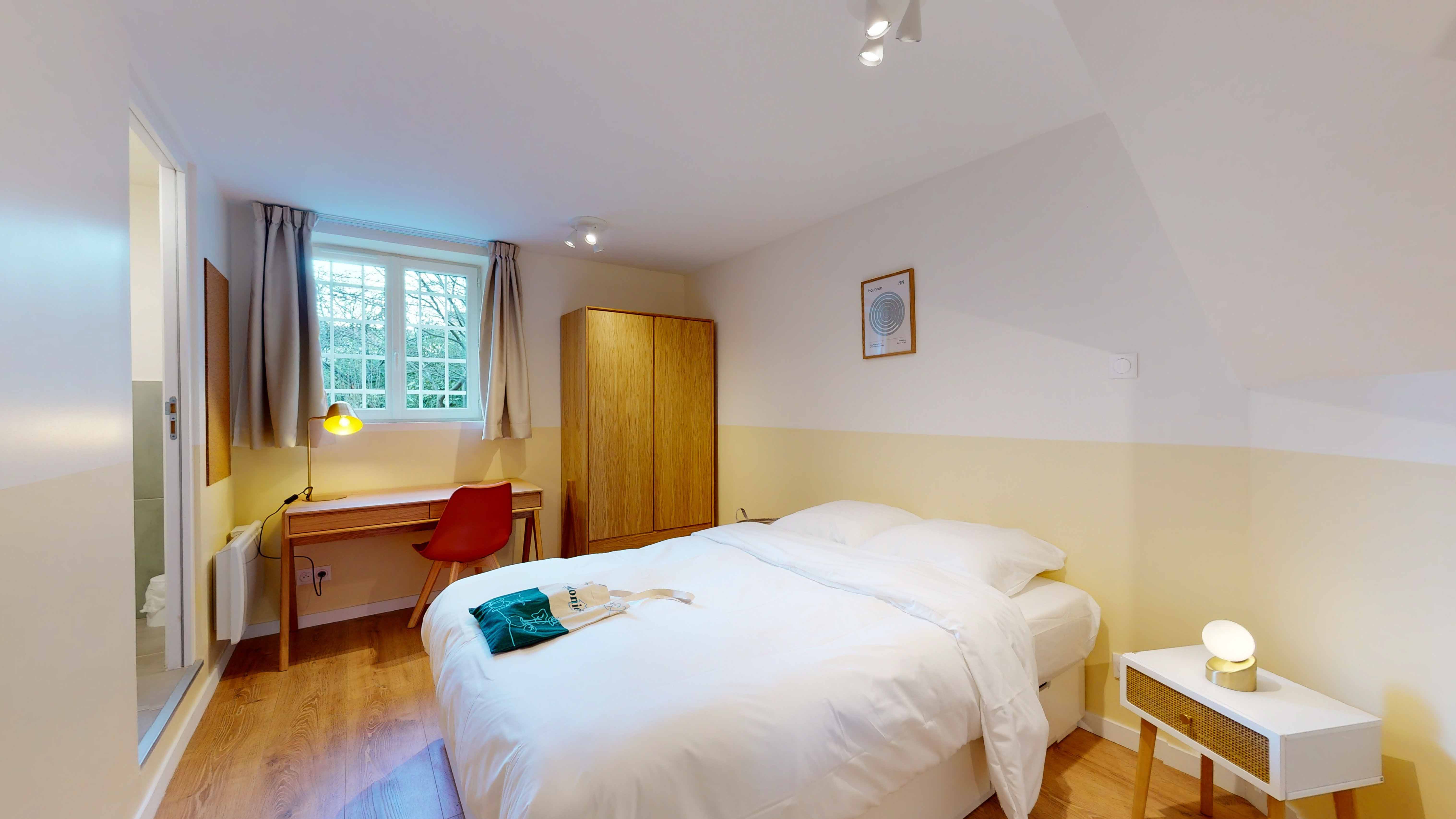 La chambre "Room for one person - 3" est un cocon parfait pour une personne. D'une superficie de 15m², elle est située au rez-de-jardin et dispose d'une salle de bain privée avec douche. La chambre est meublée d'un lit double avec rangement intégré, d'une armoire spacieuse pour vos vêtements, d'un bureau accompagné d'une chaise confortable pour travailler ou étudier, et d'une lampe de bureau pour vos lectures nocturnes. La literie de qualité supérieure et le radiateur assurent votre confort tout au long de l'année.