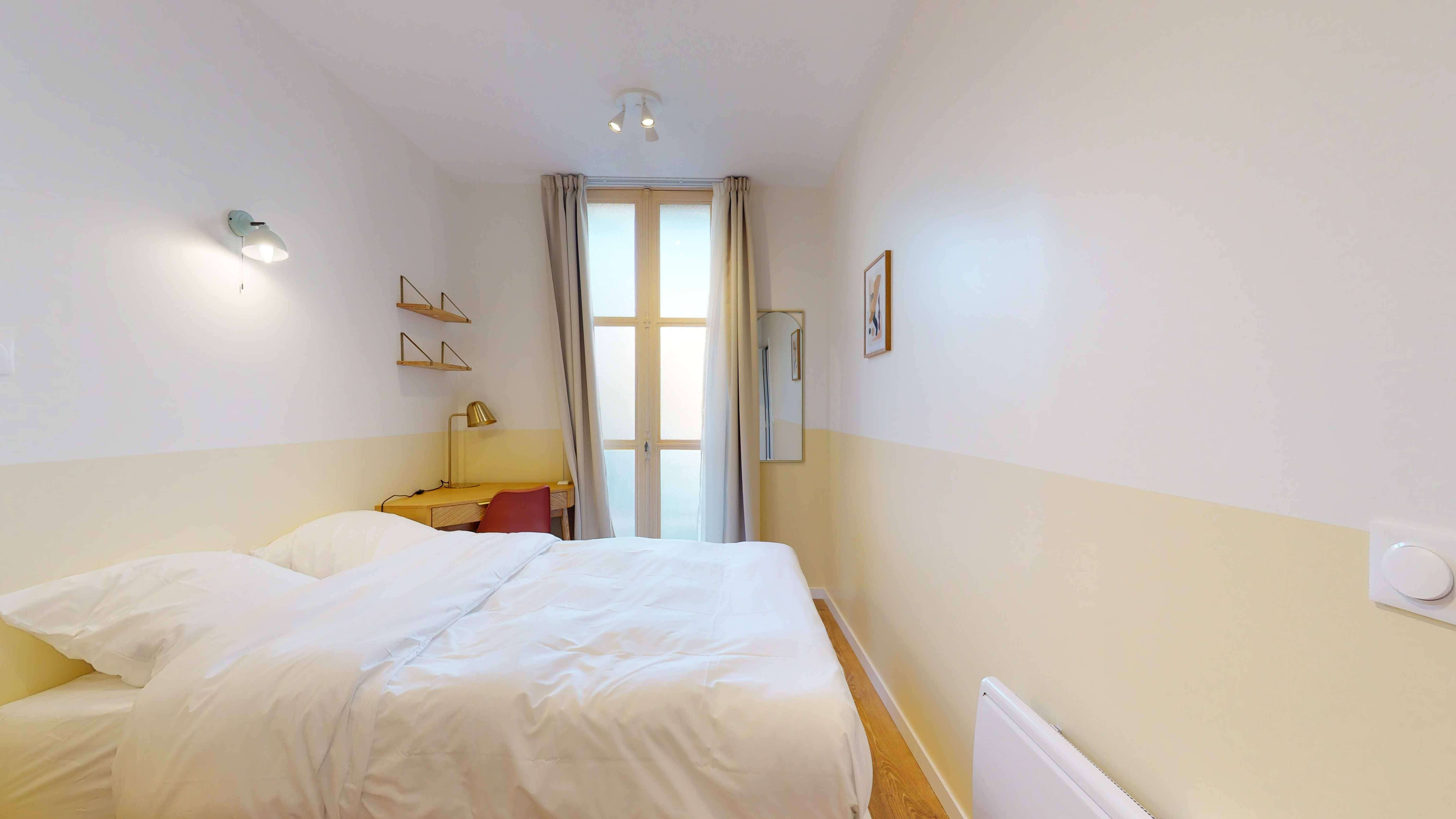 La chambre "Room for one person - 6" est un cocon douillet de 9m² situé au rez-de-chaussée. Elle est idéale pour une personne et comprend un lit double avec rangement intégré, une armoire pour vos affaires, une chaise confortable et un bureau éclairé par une lampe pour travailler ou étudier. La chambre partage une salle de bain moderne avec douche avec un autre locataire. De plus, vous bénéficierez d'un radiateur pour rester au chaud, de linge de lit de qualité et d'une lampe de chevet pour vos lectures nocturnes.