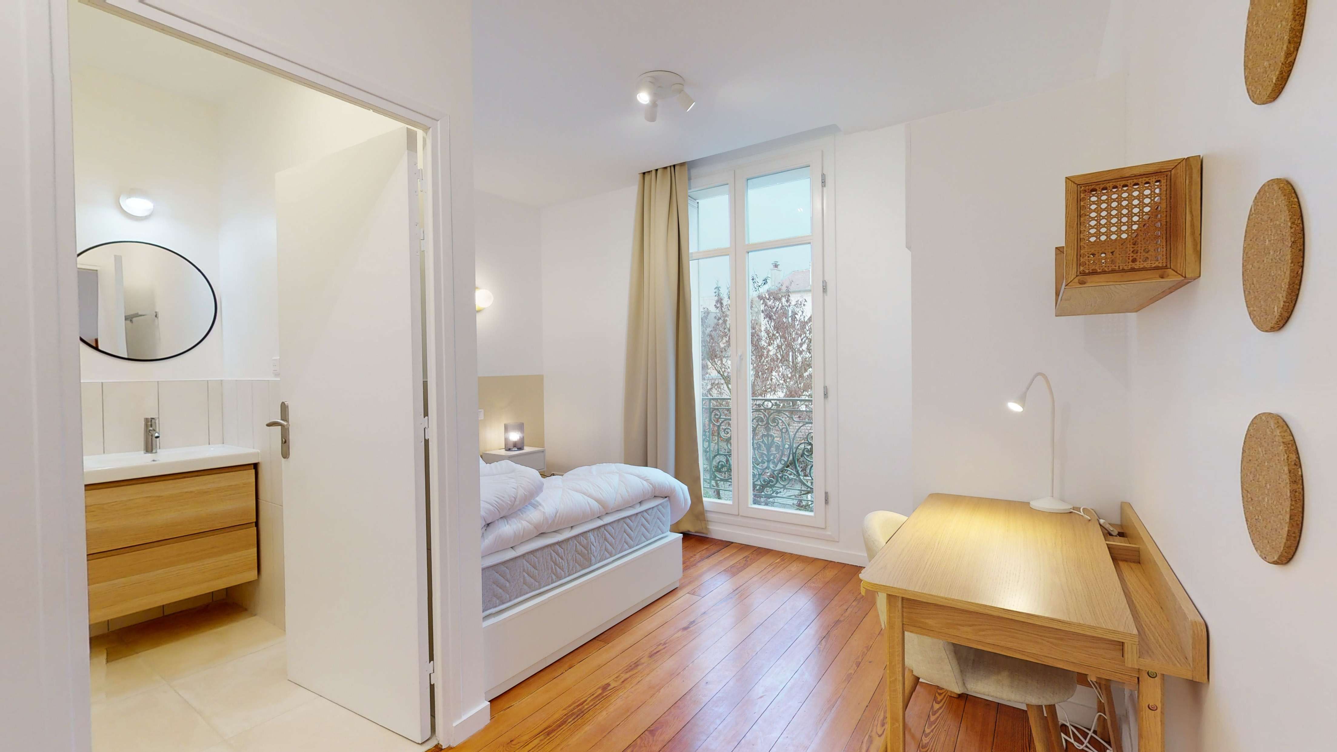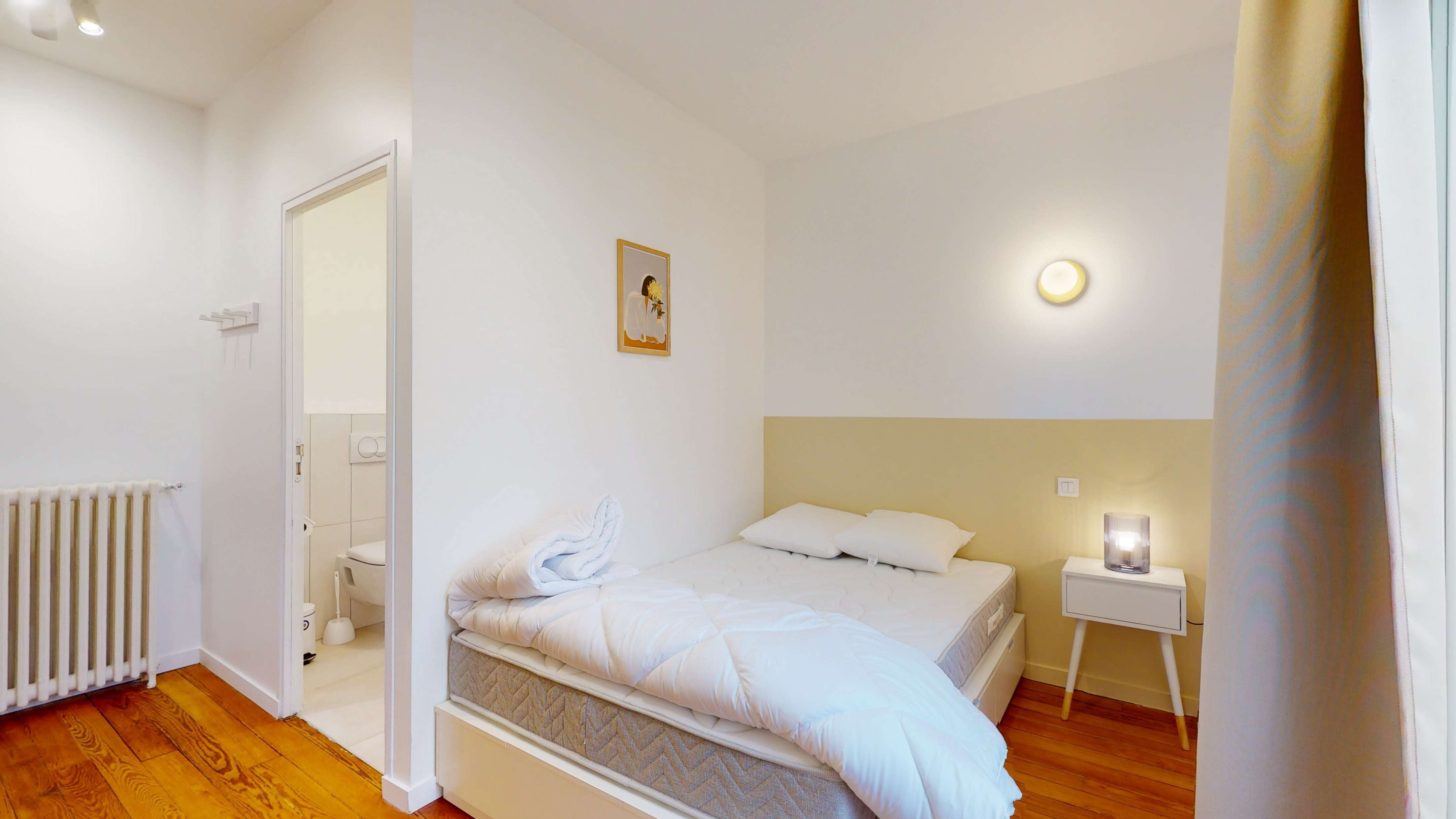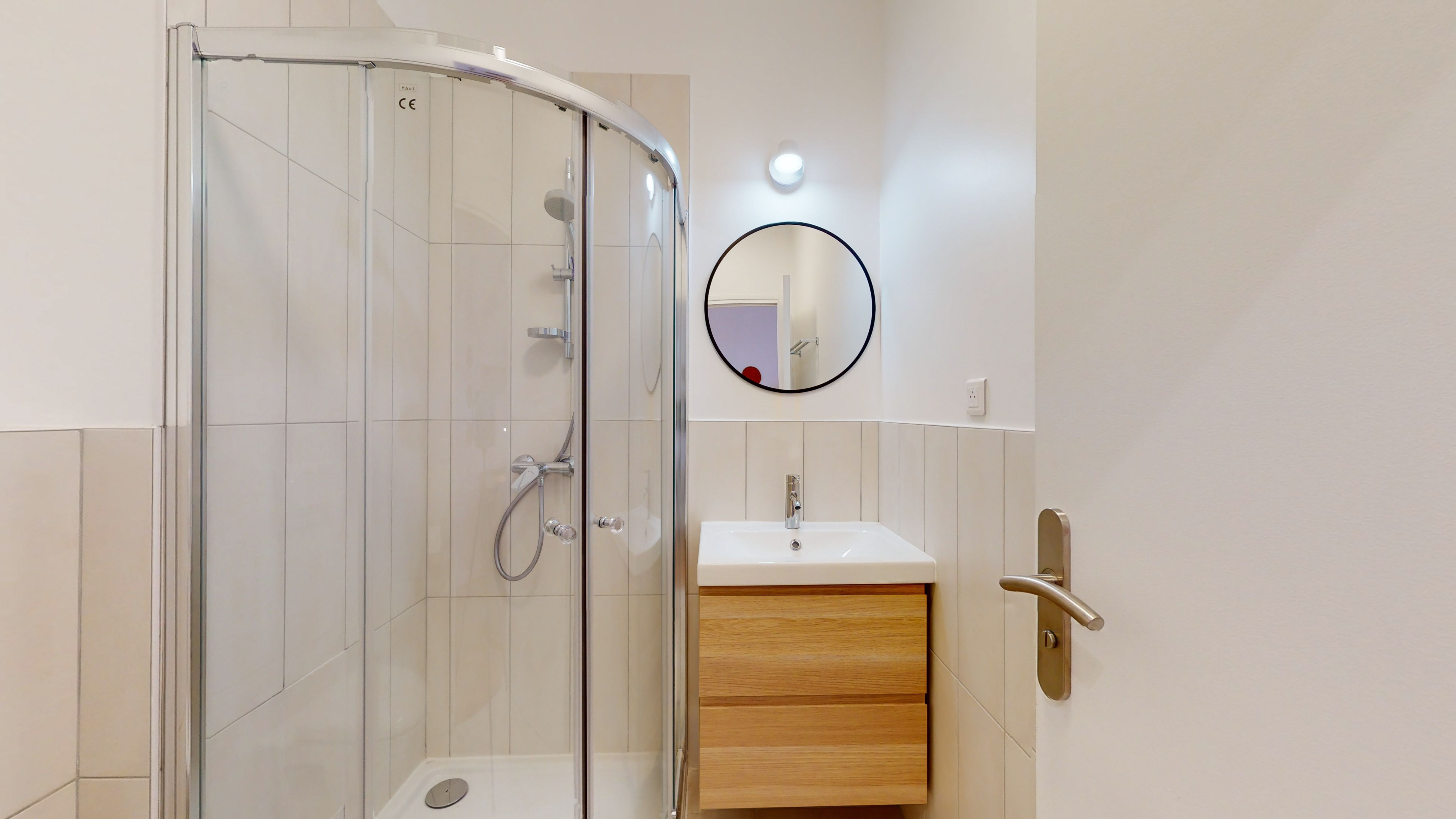 Votre future chambre, la "Room for one person - 5", est un cocon douillet de 17m2 situé au premier étage. Elle est parfaitement équipée pour votre confort avec un lit double, une armoire pour vos affaires, une chaise et un bureau pour travailler ou étudier. La salle de bain privée comprend une douche moderne pour vous rafraîchir en toute intimité.