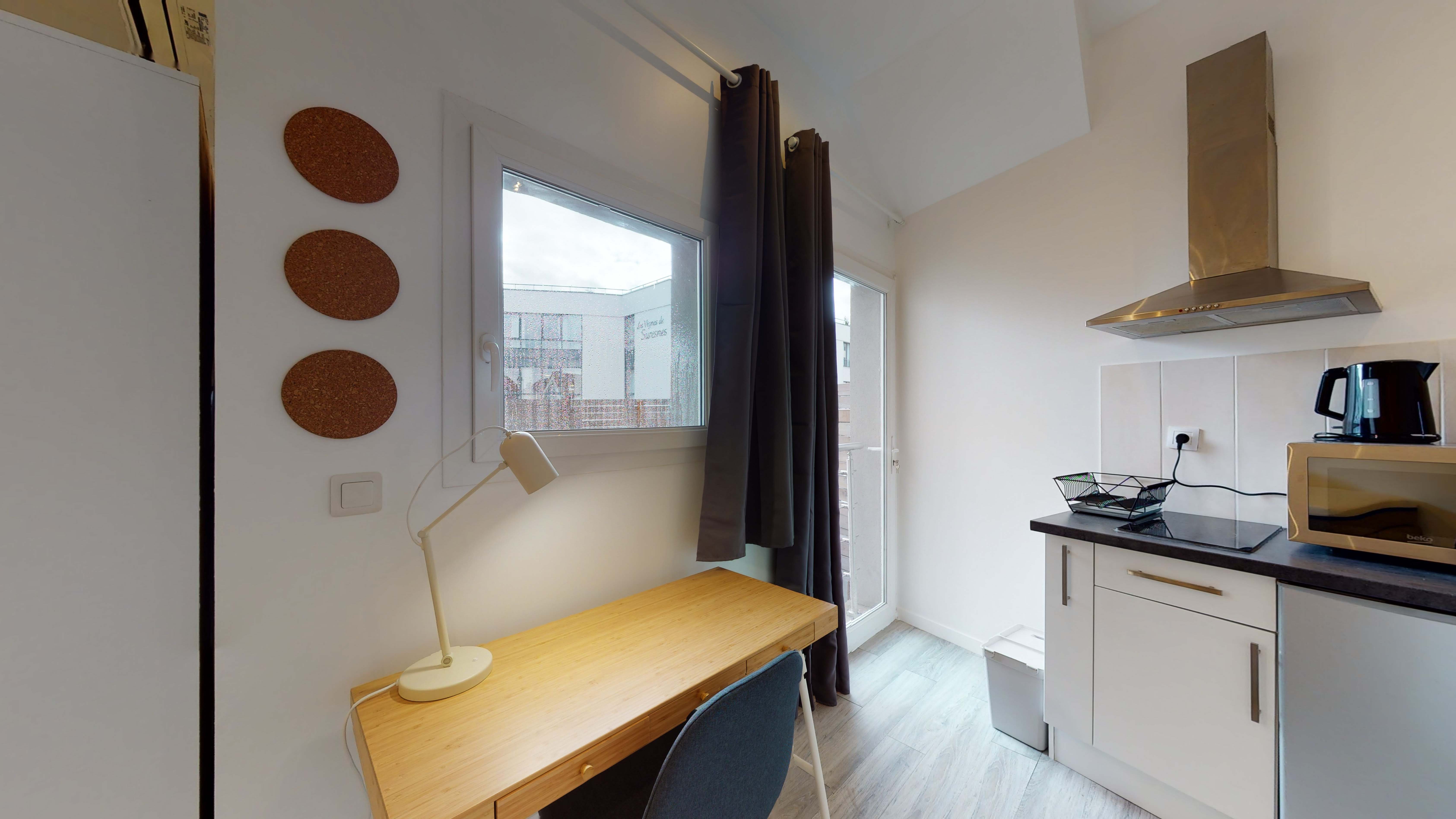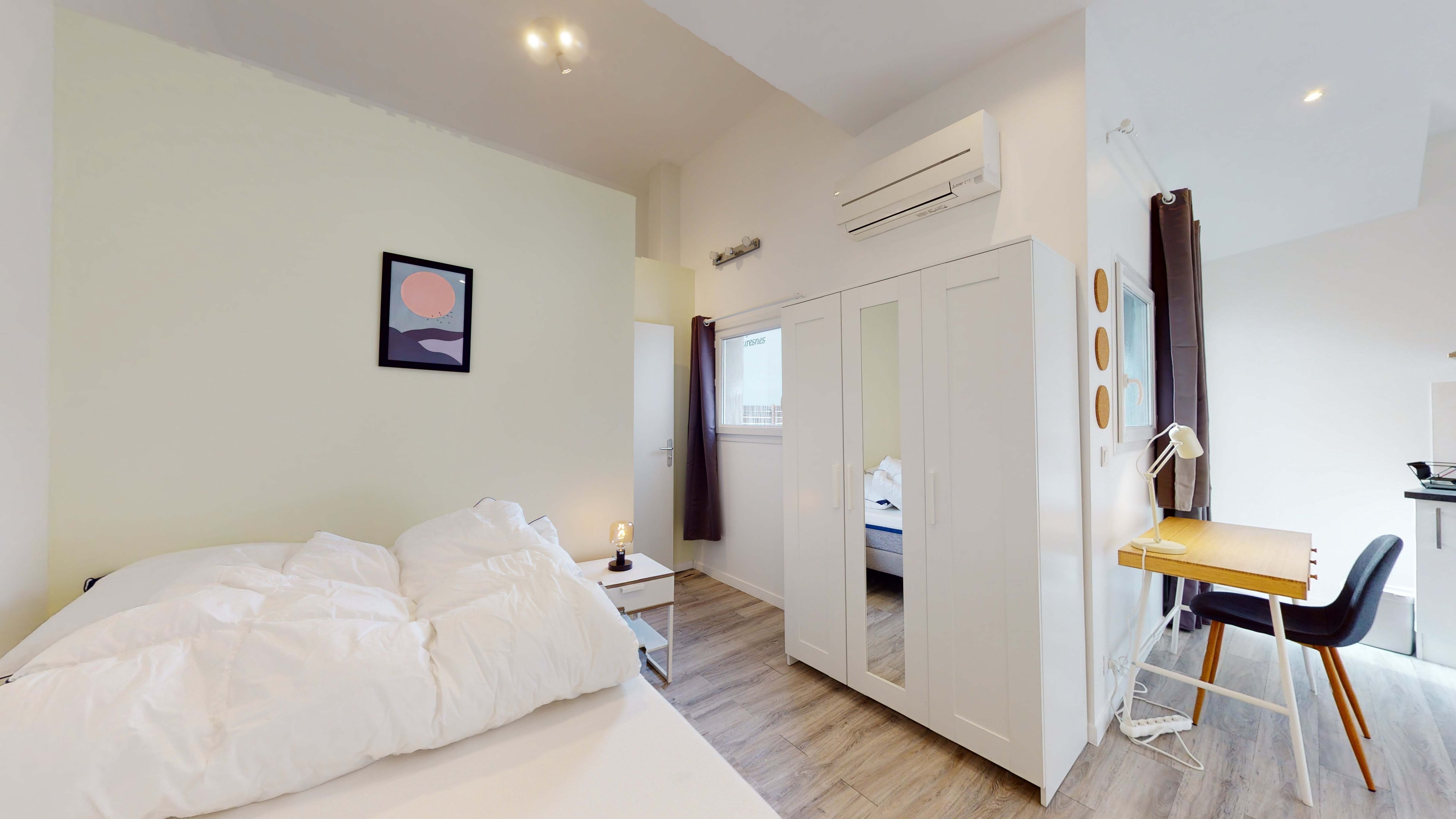 Le Studio 7 est parfait pour une personne recherchant son petit nid douillet. Il est bien aménagé avec un lit double confortable, une armoire pour vos affaires, un bureau et une chaise pour travailler ou étudier tranquillement, ainsi qu'une kitchenette pour préparer vos en-cas. La salle de bain privative est équipée d'une douche, d'un lavabo et de toilettes, offrant intimité et commodité.