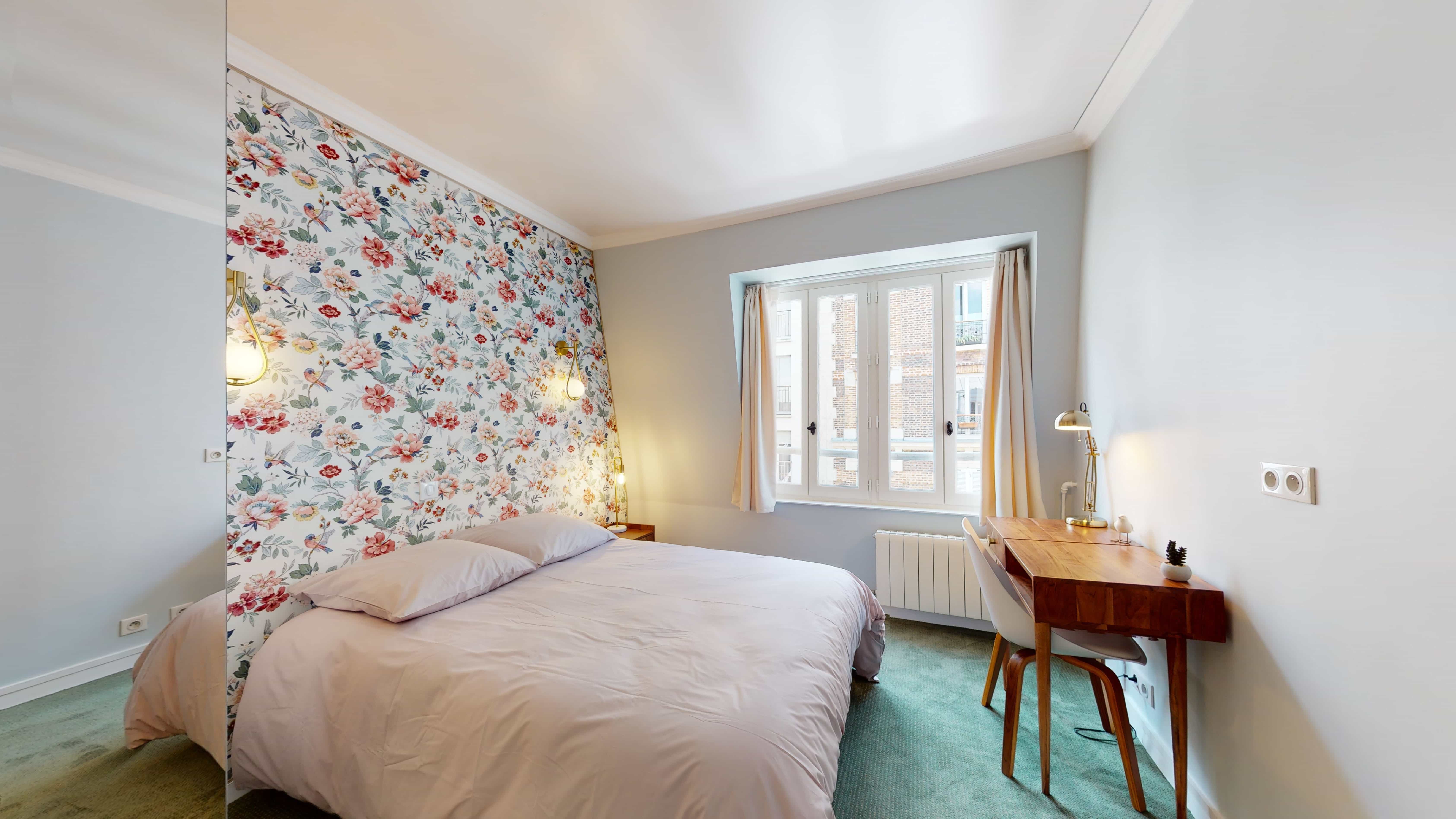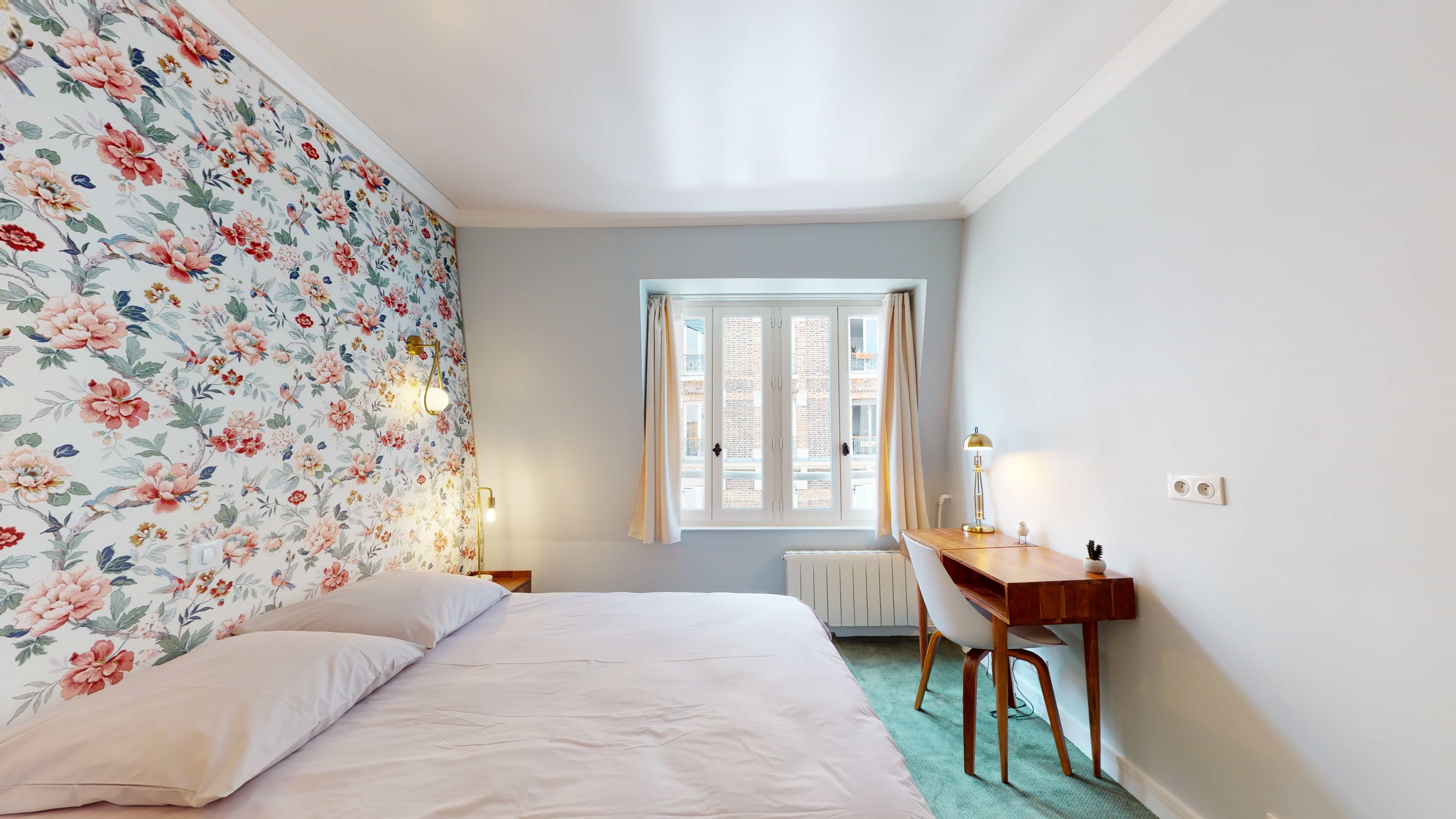 Votre future chambre, la "Room for 1 - 11", est située au 2e étage et est conçue pour une personne. Elle dispose d'une salle de bain privée avec douche et lavabo. La chambre est meublée d'un lit confortable avec rangement intégré, d'une penderie pour vos vêtements, d'un bureau avec lampe pour travailler et d'une chaise. Vous y trouverez également tout le nécessaire pour votre confort : linge de lit, radiateur pour les jours froids et une petite table de nuit.
