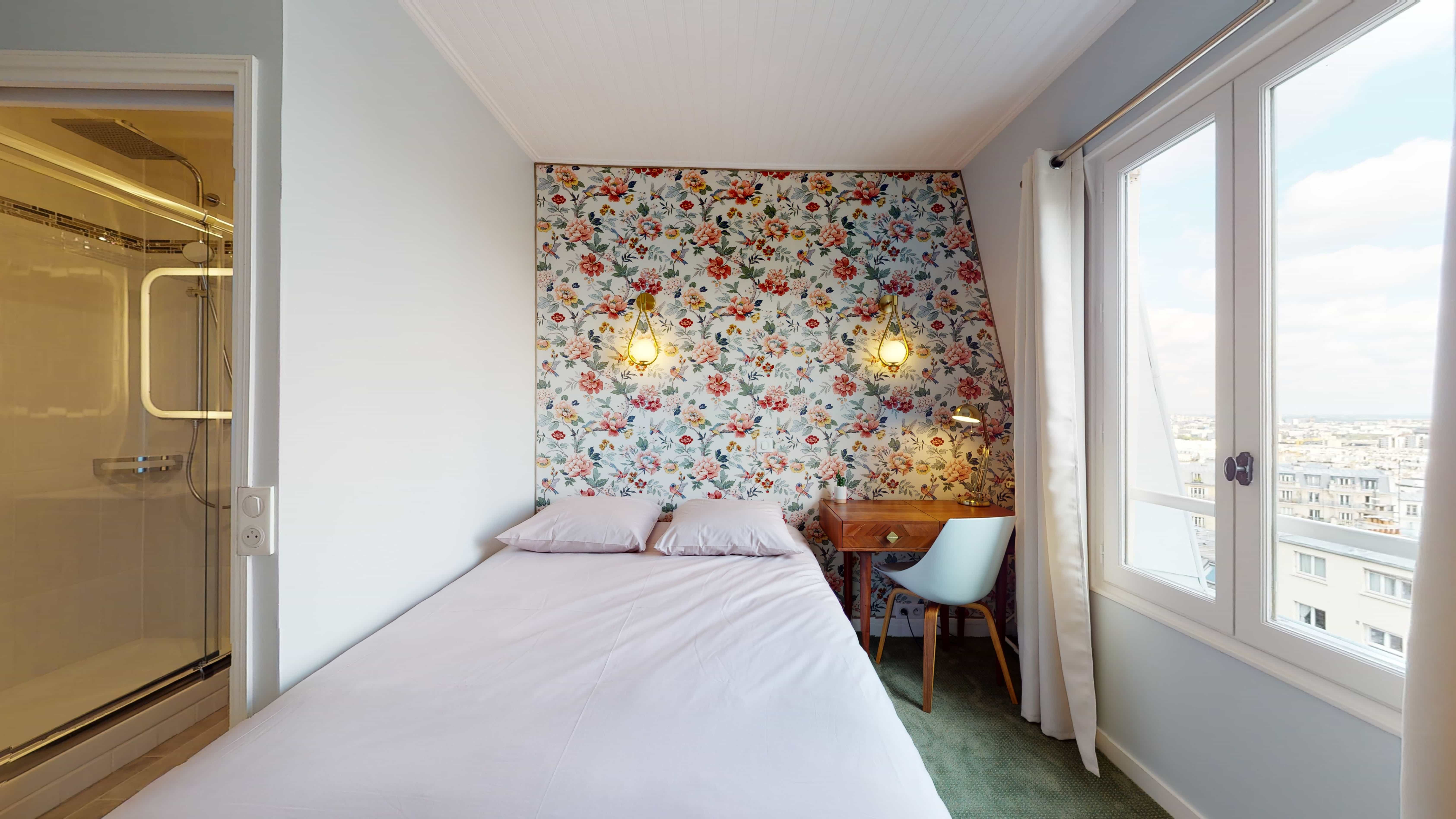Votre chambre privée, la "Room for 1 - 14", est située au 2e étage. Elle est conçue pour une personne et comprend tout ce dont vous avez besoin : un lit confortable avec des draps de qualité, un bureau avec une lampe pour travailler, une chaise, une penderie pour vos vêtements et même un bloc hôtel avec mini frigo, micro-onde et vaisselle. La salle de bain privée est équipée d'une douche et d'un lavabo.