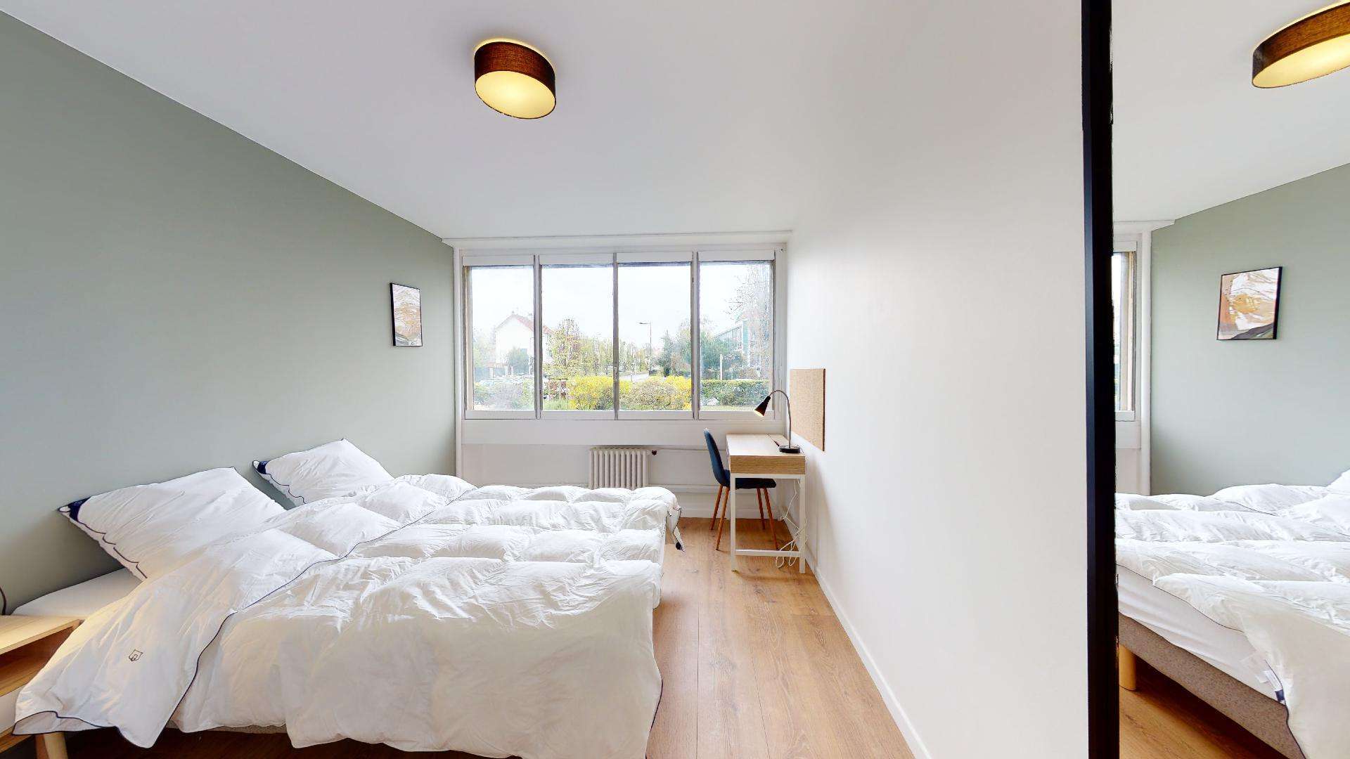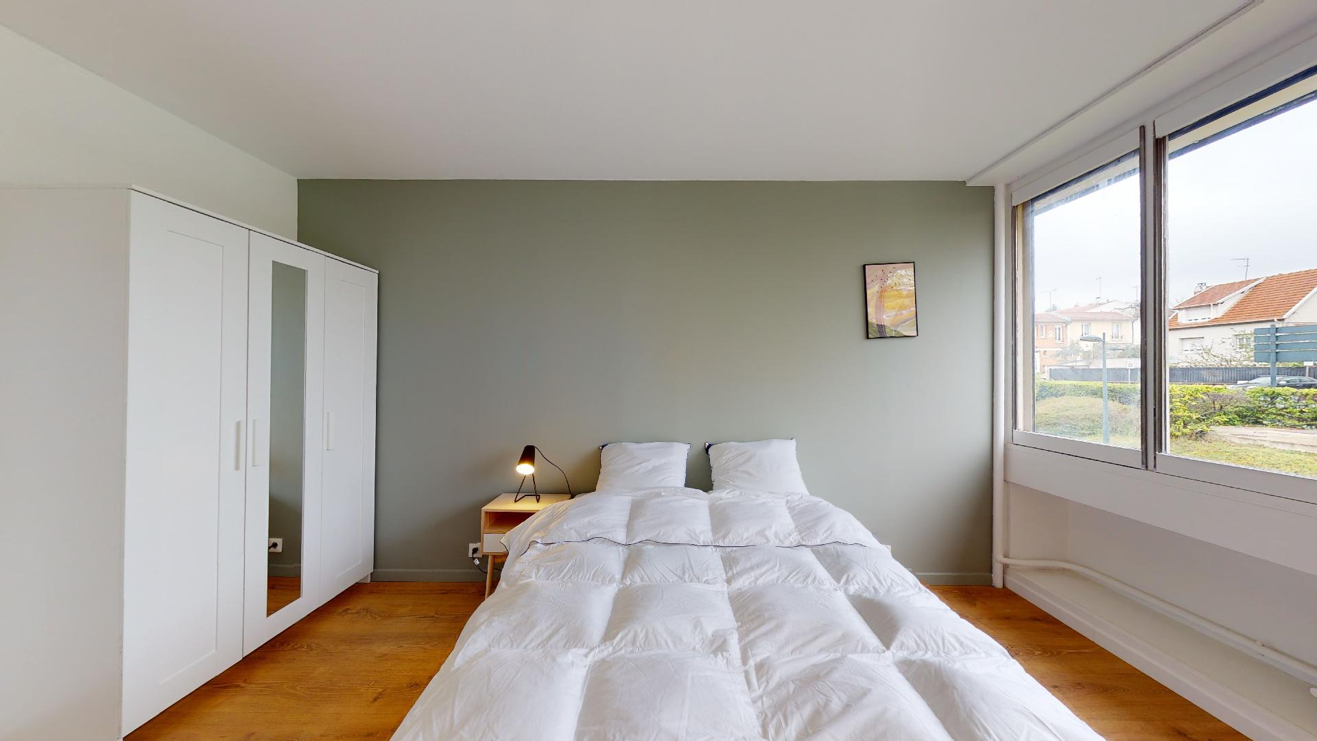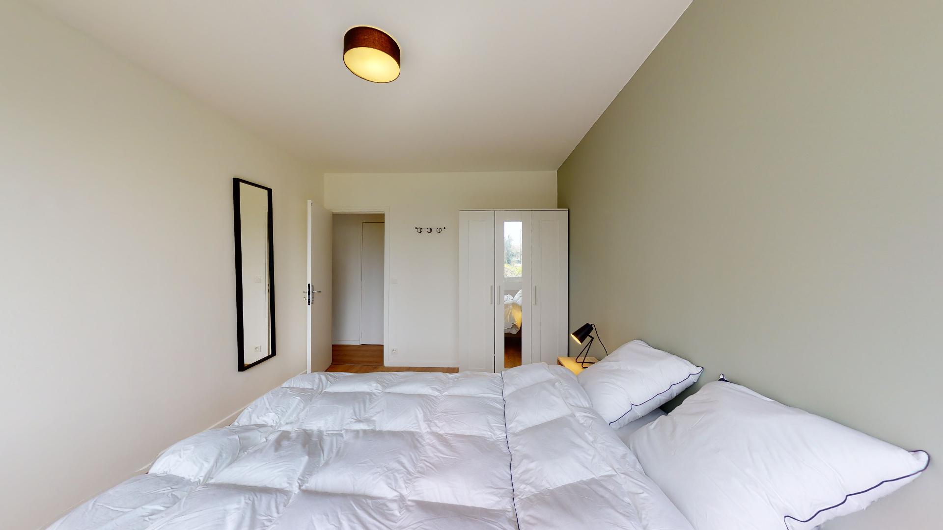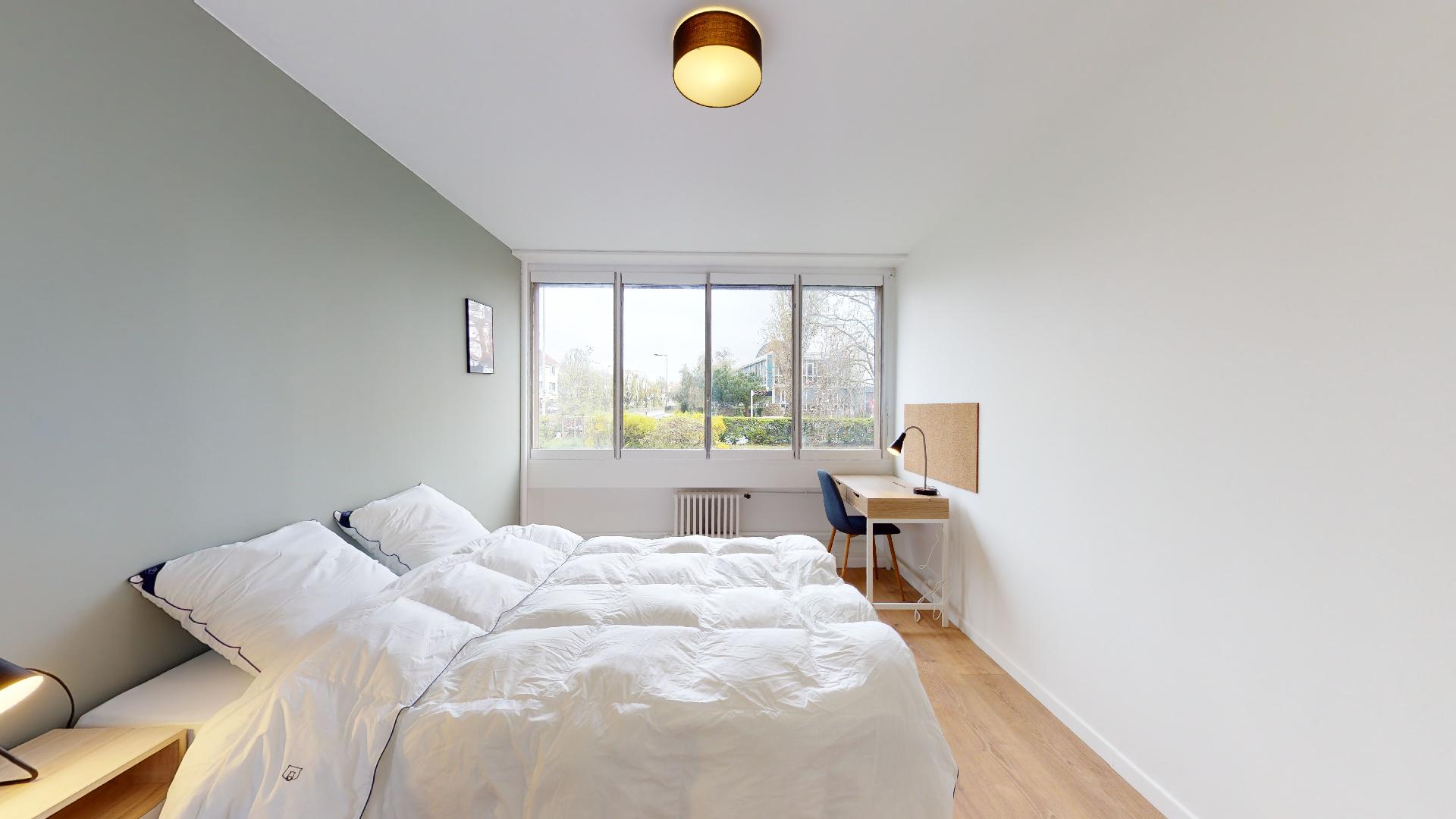 Room 3 est spécialement aménagée pour une personne. Elle est confortable avec un lit double et une literie de qualité pour bien dormir. Vous avez aussi une armoire pour ranger vos affaires, un bureau et une chaise pour travailler ou étudier, et un balcon privé pour prendre l'air. La chambre partage une salle de bain propre et moderne avec d'autres locataires.
