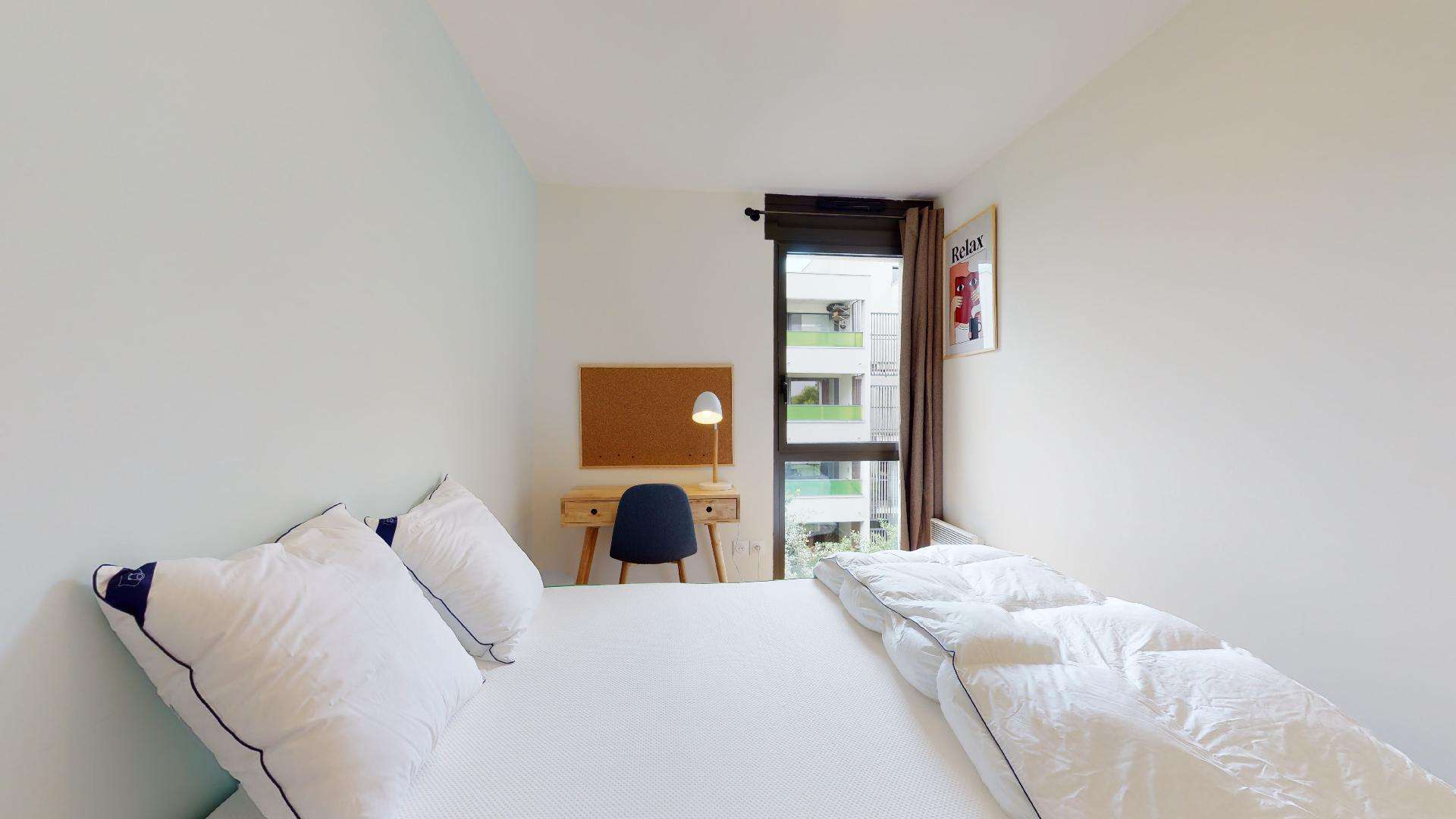Room 1 est pensée juste pour vous ! Avec ses 9 m², elle offre un lit double confortable, une armoire pour vos vêtements, une chaise et un bureau pour travailler ou étudier tranquillement. Vous partagerez une salle de bain moderne équipée d'une douche et de toilettes avec les autres locataires.