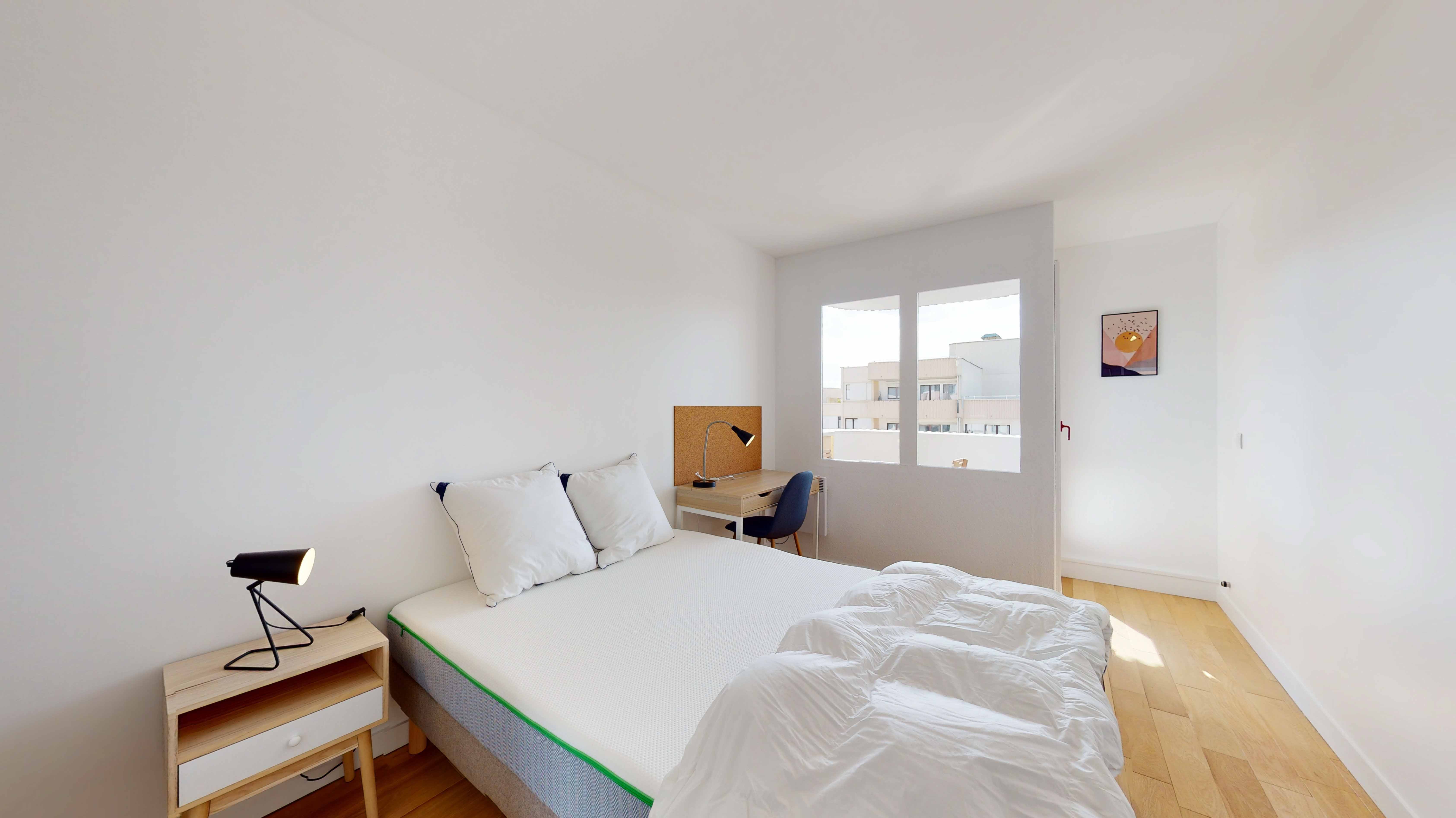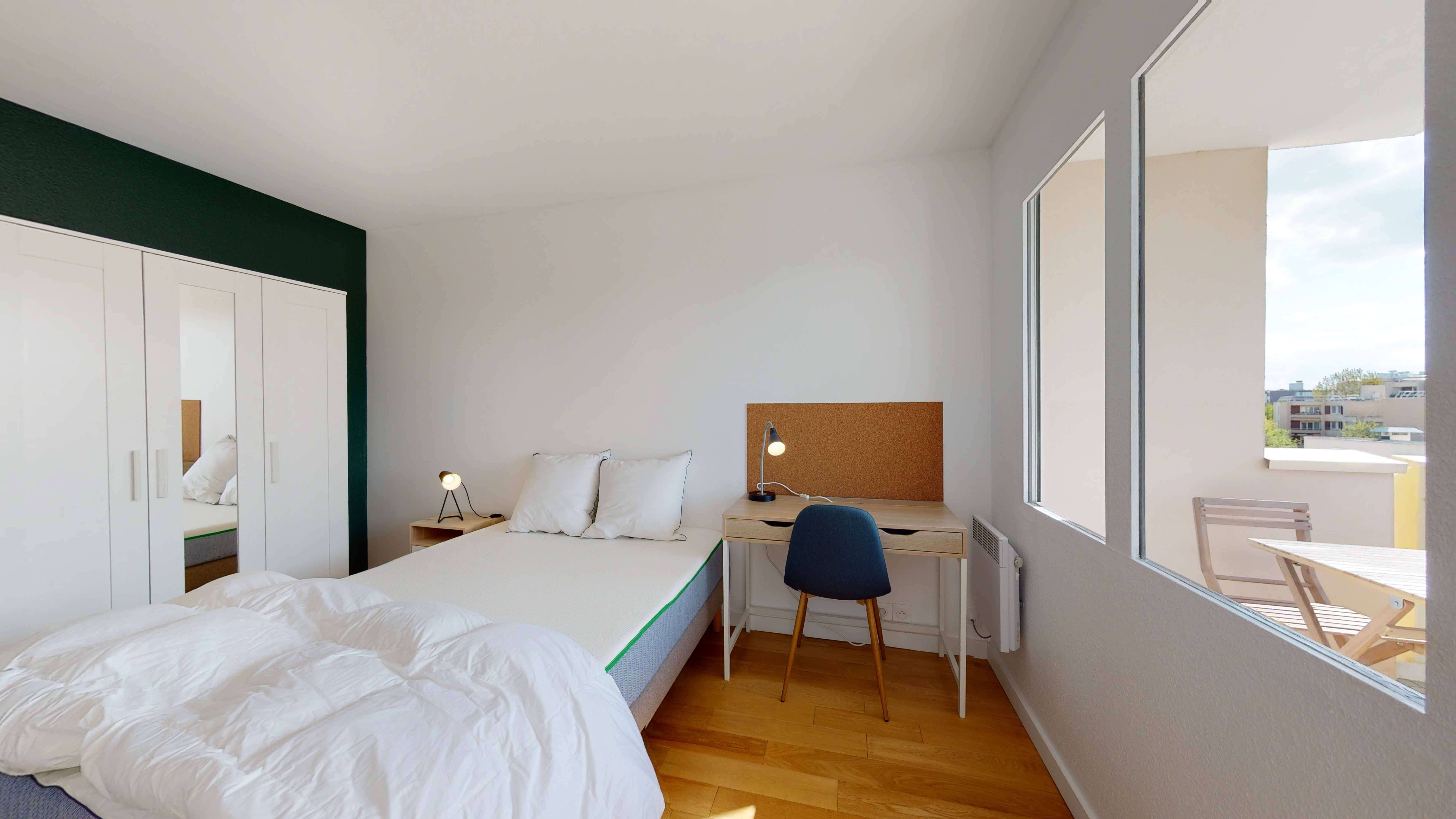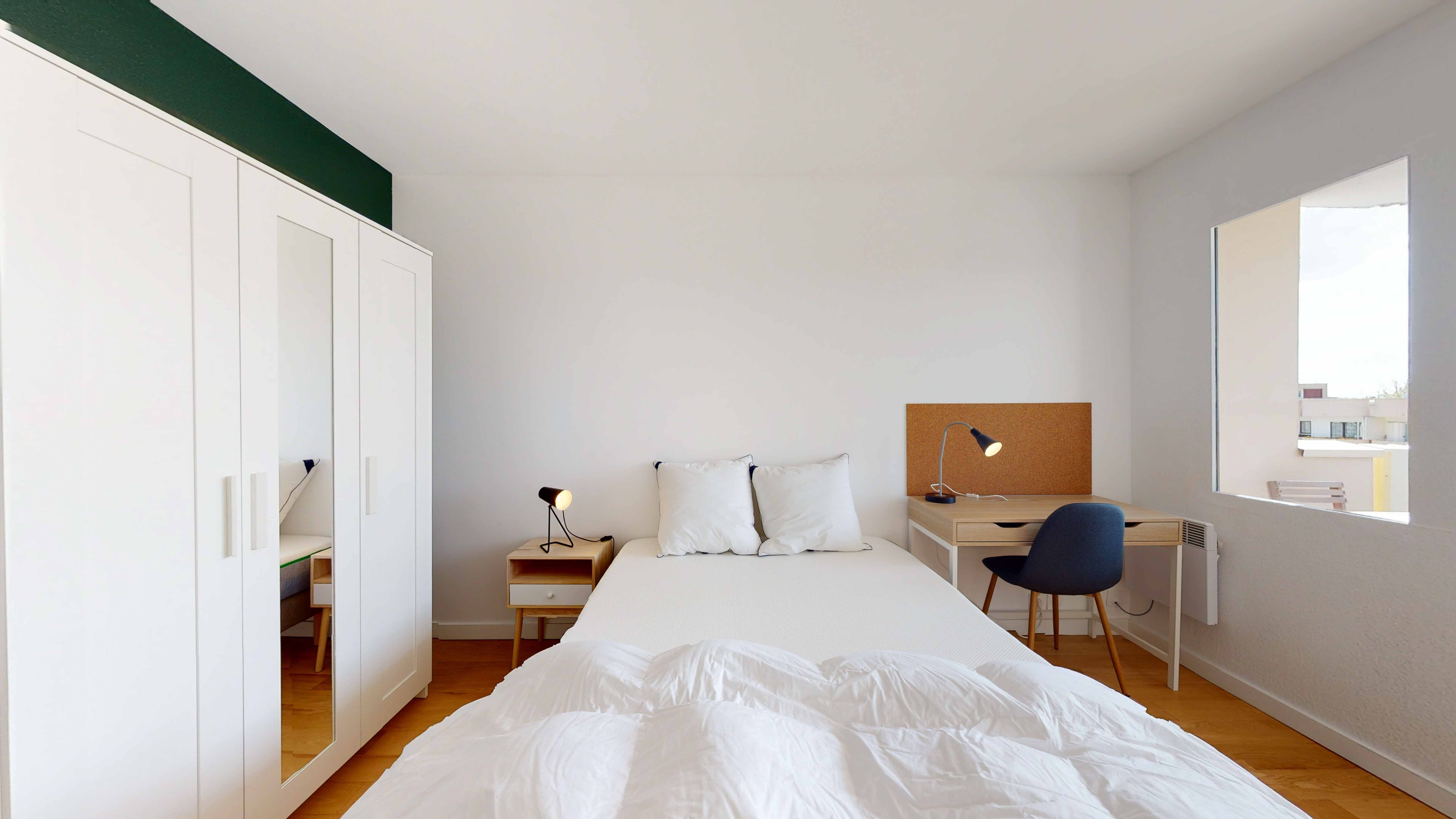 La chambre Room 5 est un petit cocon juste pour vous. Avec ses 10 m², elle est meublée d'un lit double confortable, d'une armoire pour vos vêtements, d'une chaise, d'un bureau pour étudier ou travailler, et d'une lampe de chevet. Vous aurez aussi un balcon privé pour prendre l'air. La chambre partage une salle de bain moderne avec douche avec d'autres locataires.