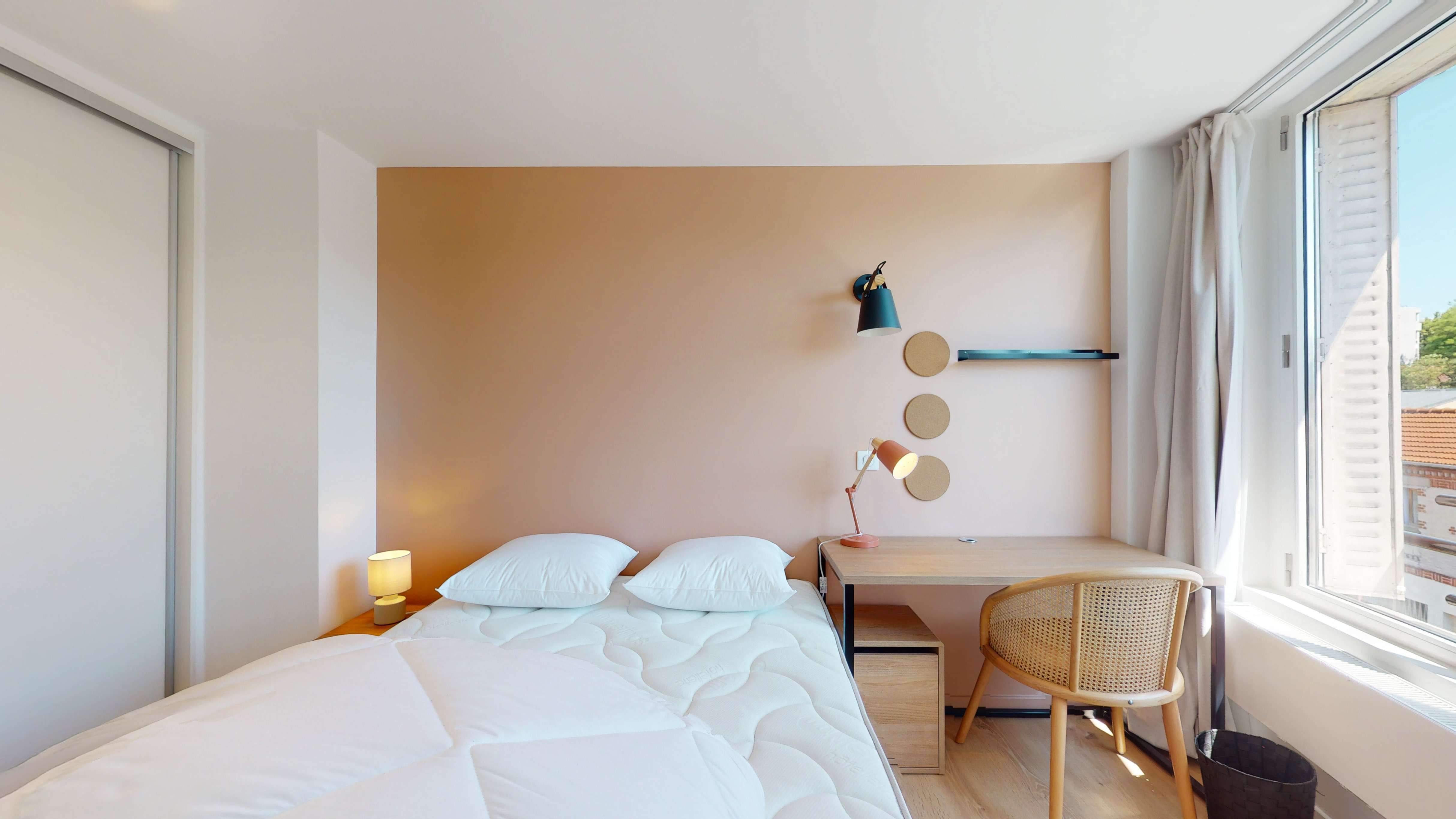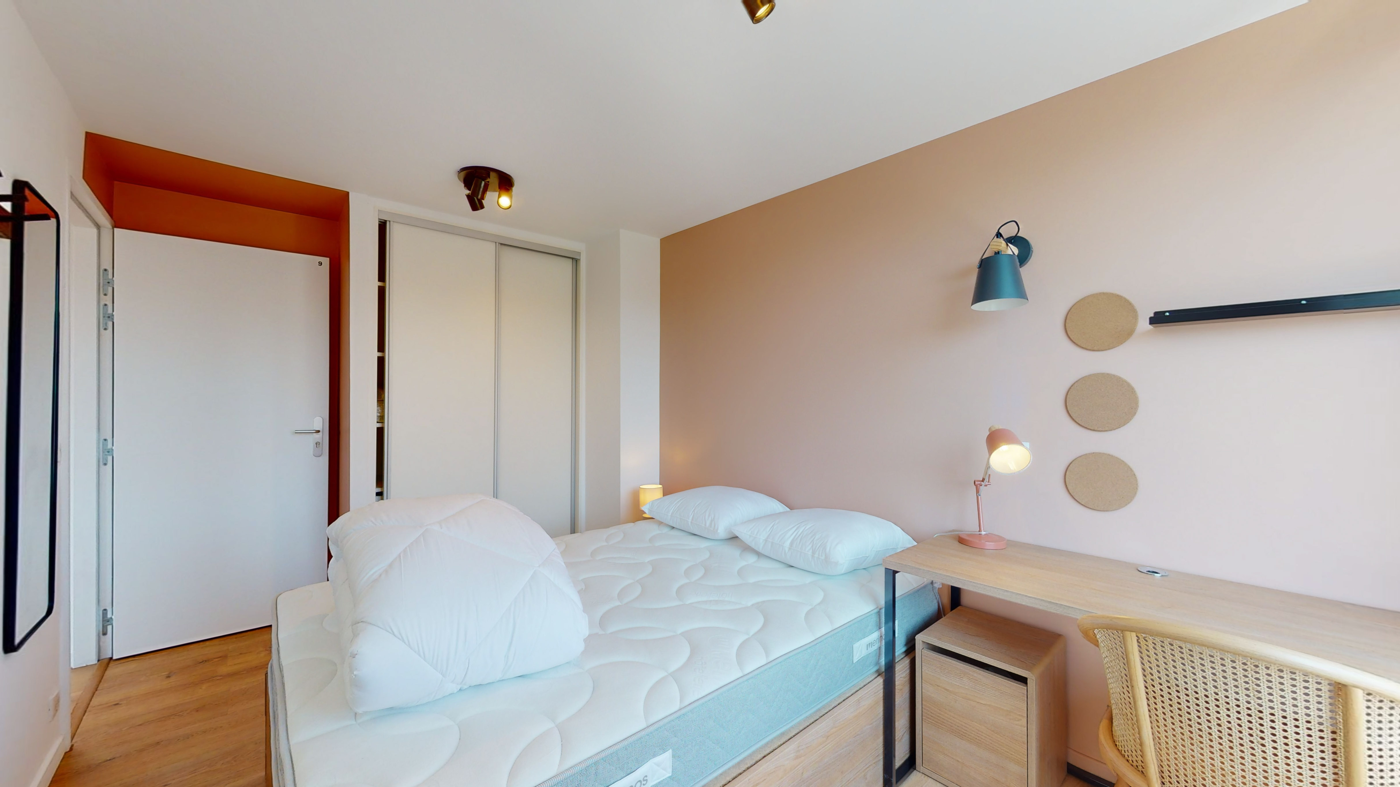 La chambre "Room for one person - 9" est un cocon douillet de 14m2 situé au deuxième étage. Elle est parfaite pour une personne avec son lit double doté de rangements, une armoire spacieuse pour vos affaires, un bureau et une chaise pour travailler ou étudier, et une salle de bain privative avec douche. La chambre est également équipée d'internet haut débit et de tout le linge de maison nécessaire pour votre confort.