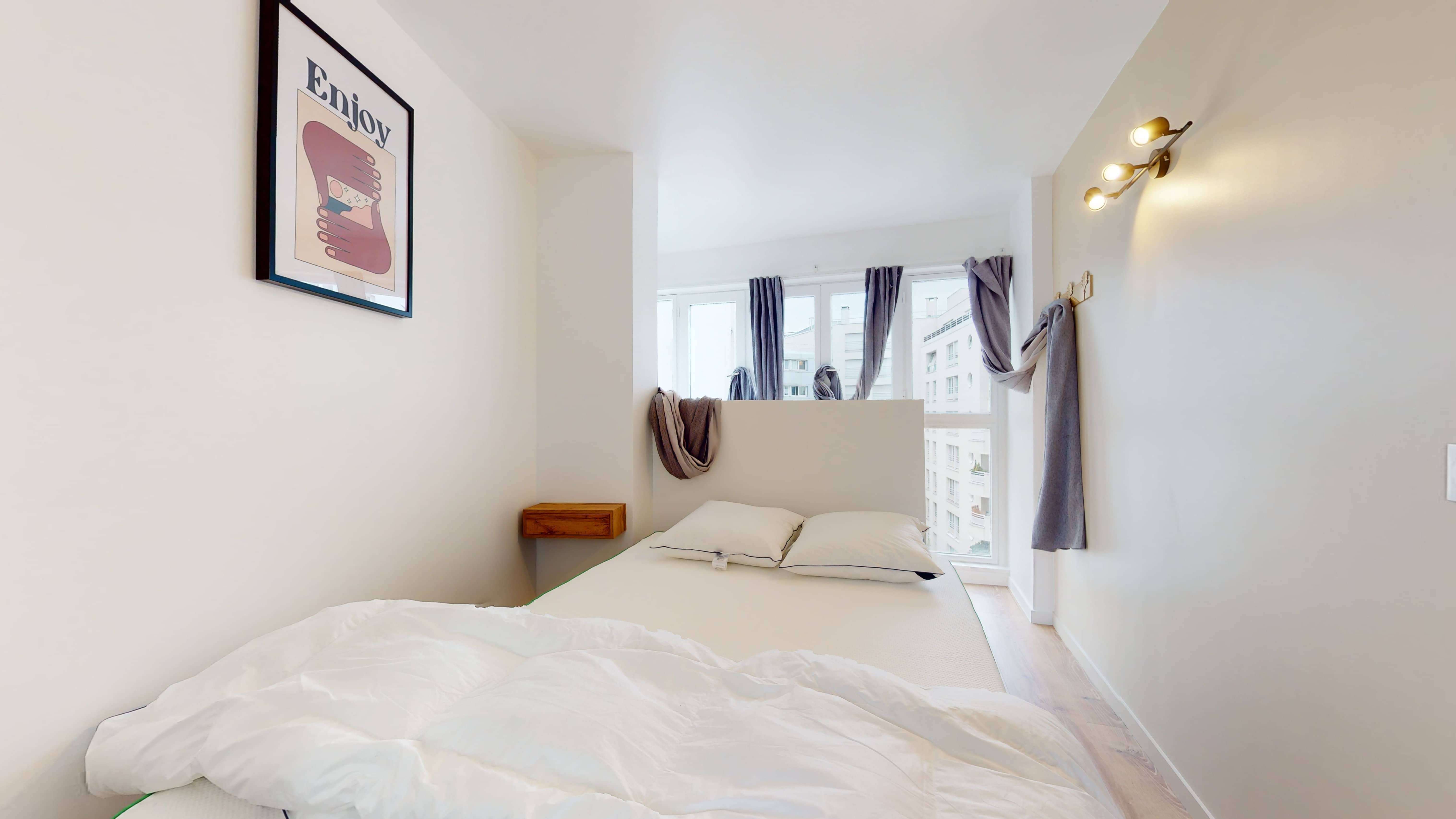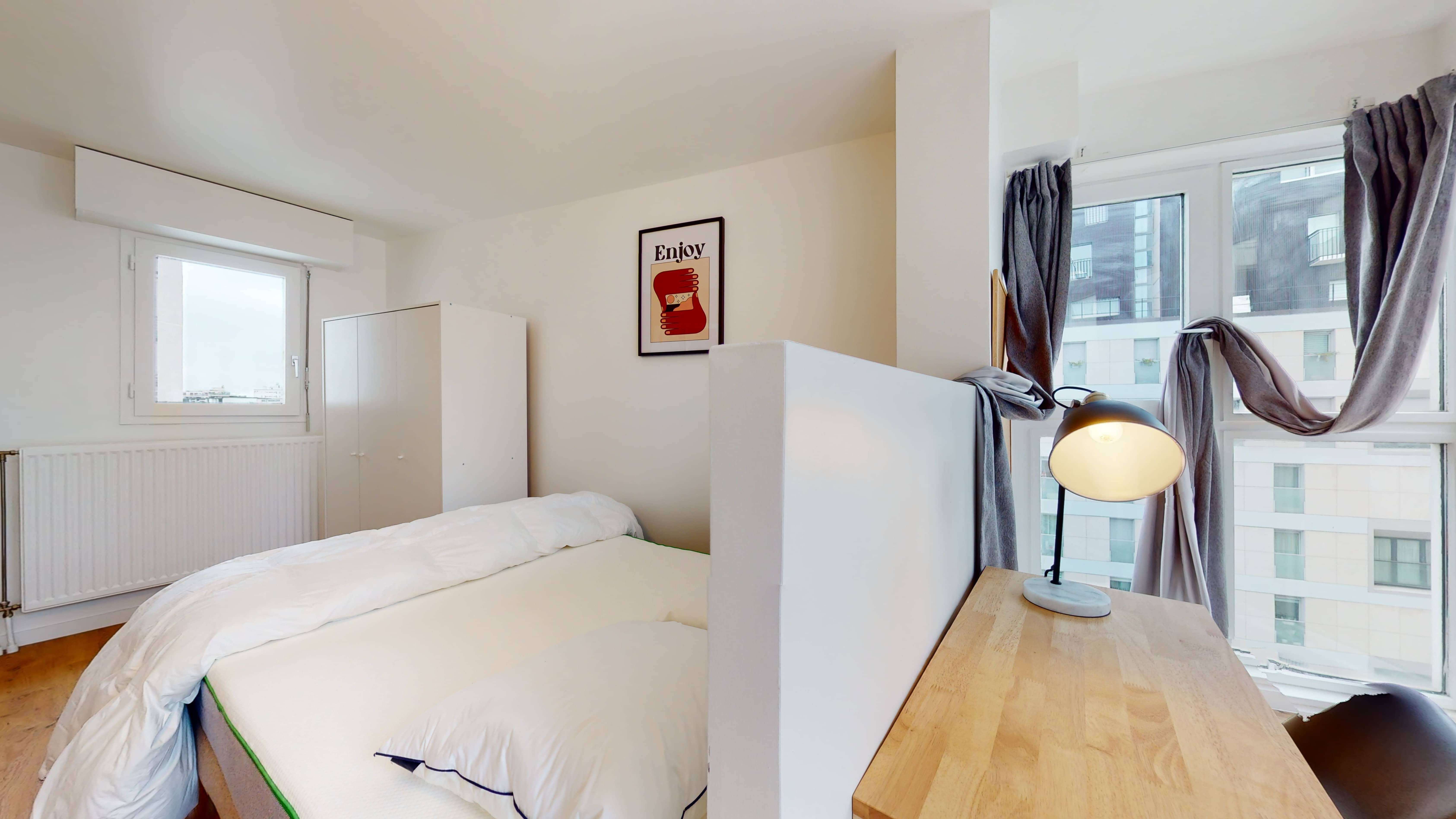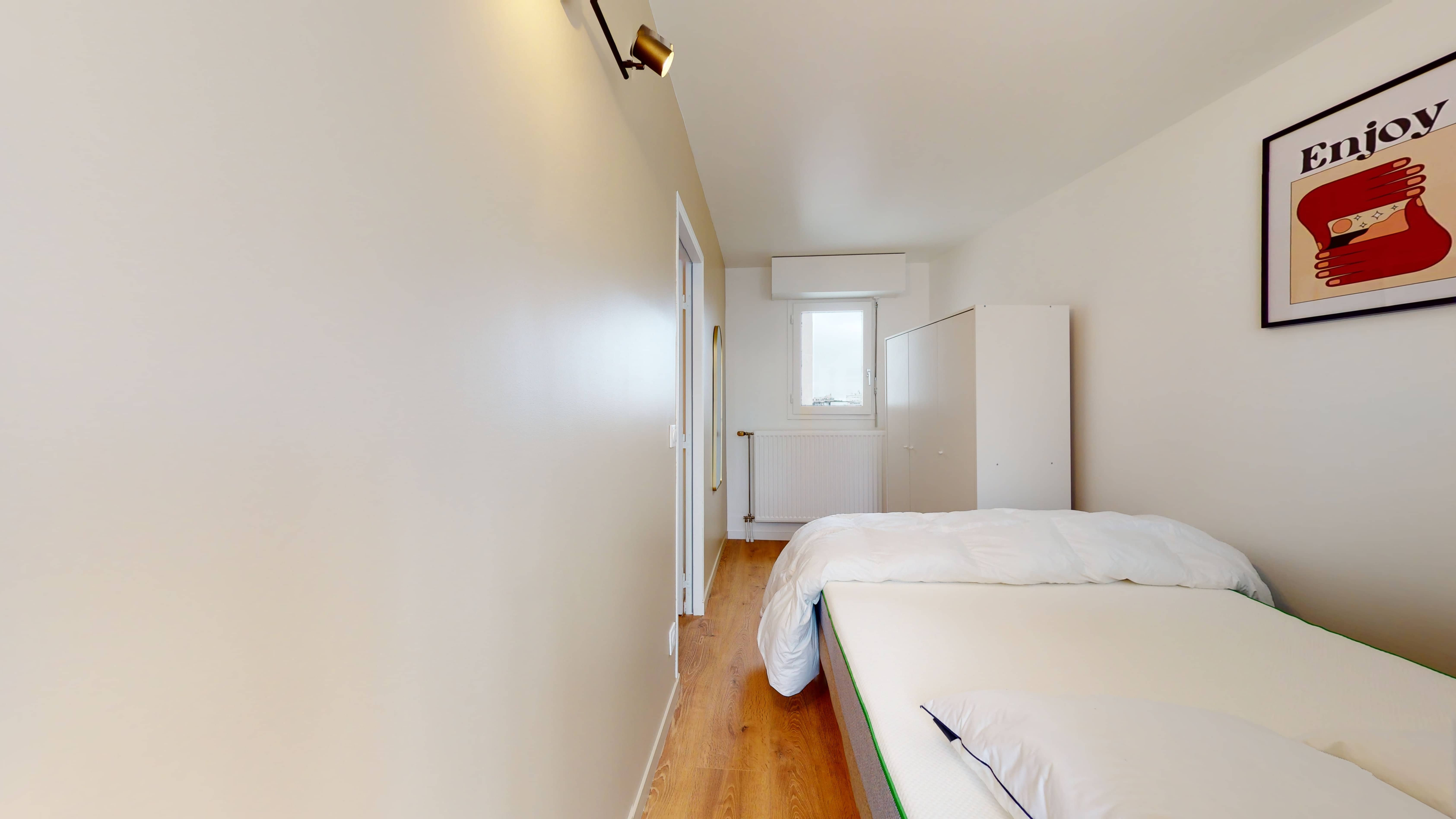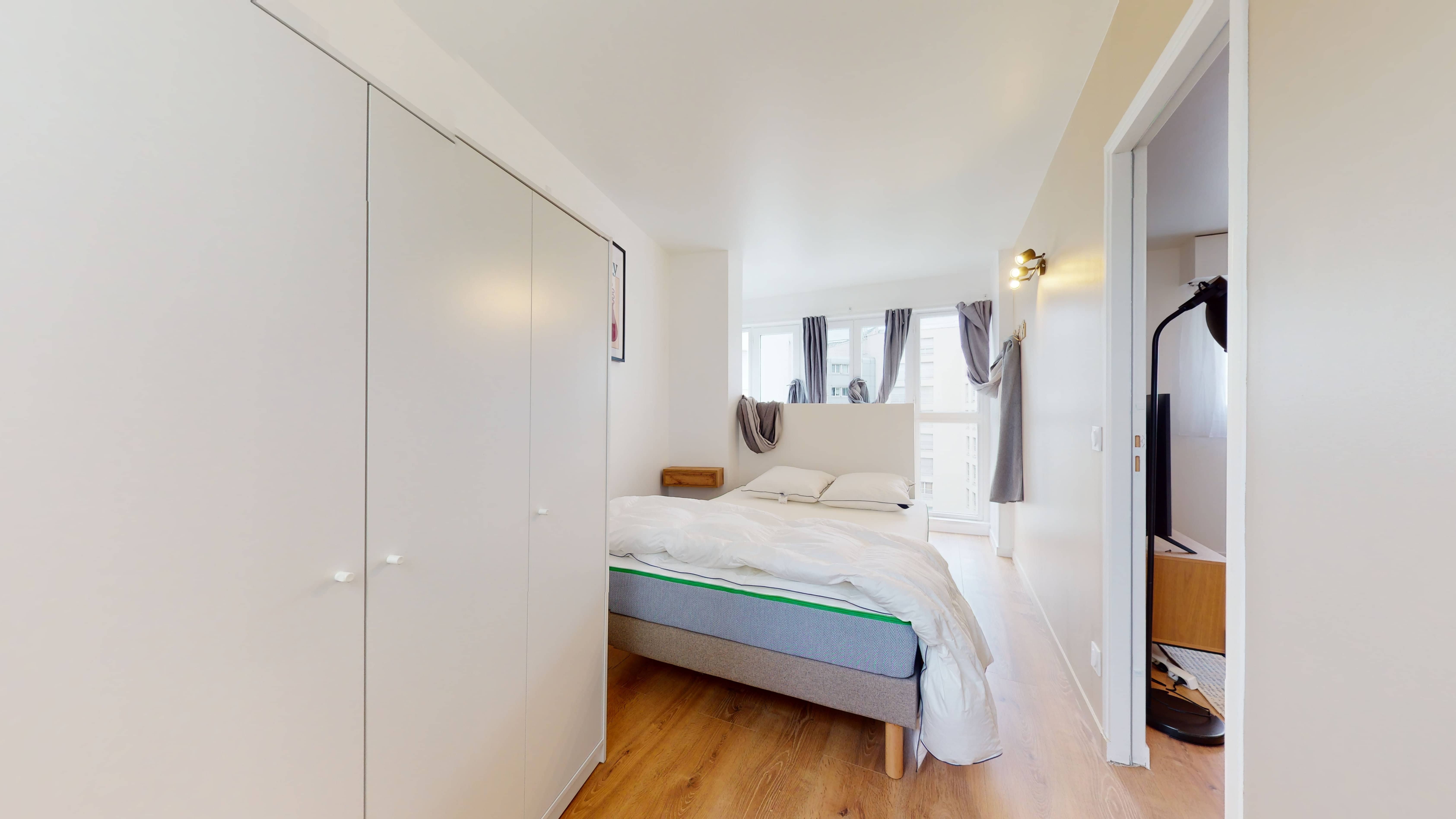 La chambre 5 est idéale pour une personne. Elle dispose d'un confortable lit double, d'une grande armoire pour toutes vos affaires, d'une chaise et d'un bureau pratique pour étudier ou travailler. Vous partagerez une salle de bain propre et moderne avec douche, lavabo et toilettes avec les autres locataires.