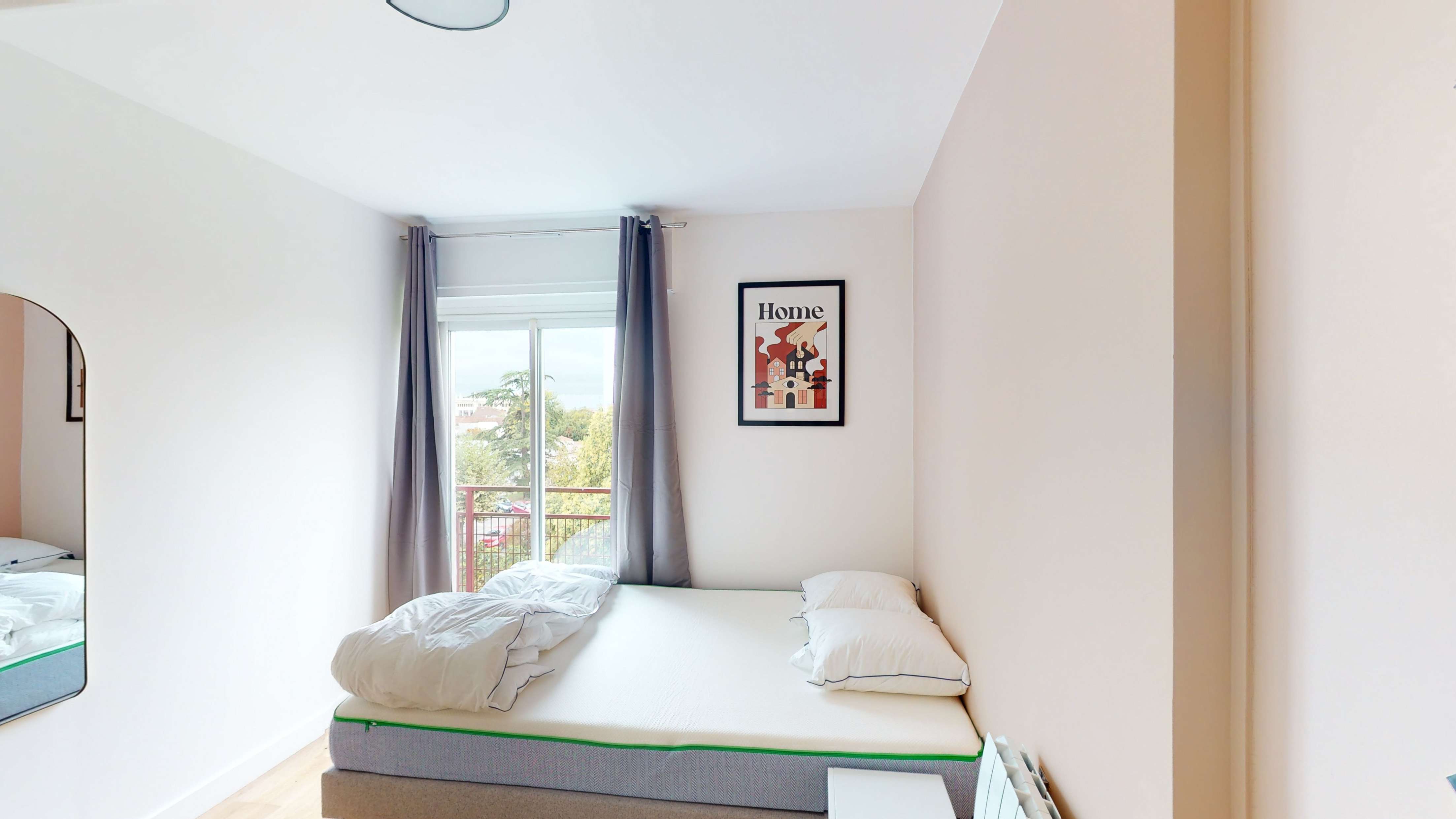 Room 1 est un studio confortable et bien agencé de 10 m², parfait pour une personne. Il dispose d'un lit double, d'une armoire pour ranger vos affaires, d'une chaise et d'un bureau pour travailler ou étudier. La chambre partage une salle de bain moderne avec douche et toilettes avec les autres résidents.