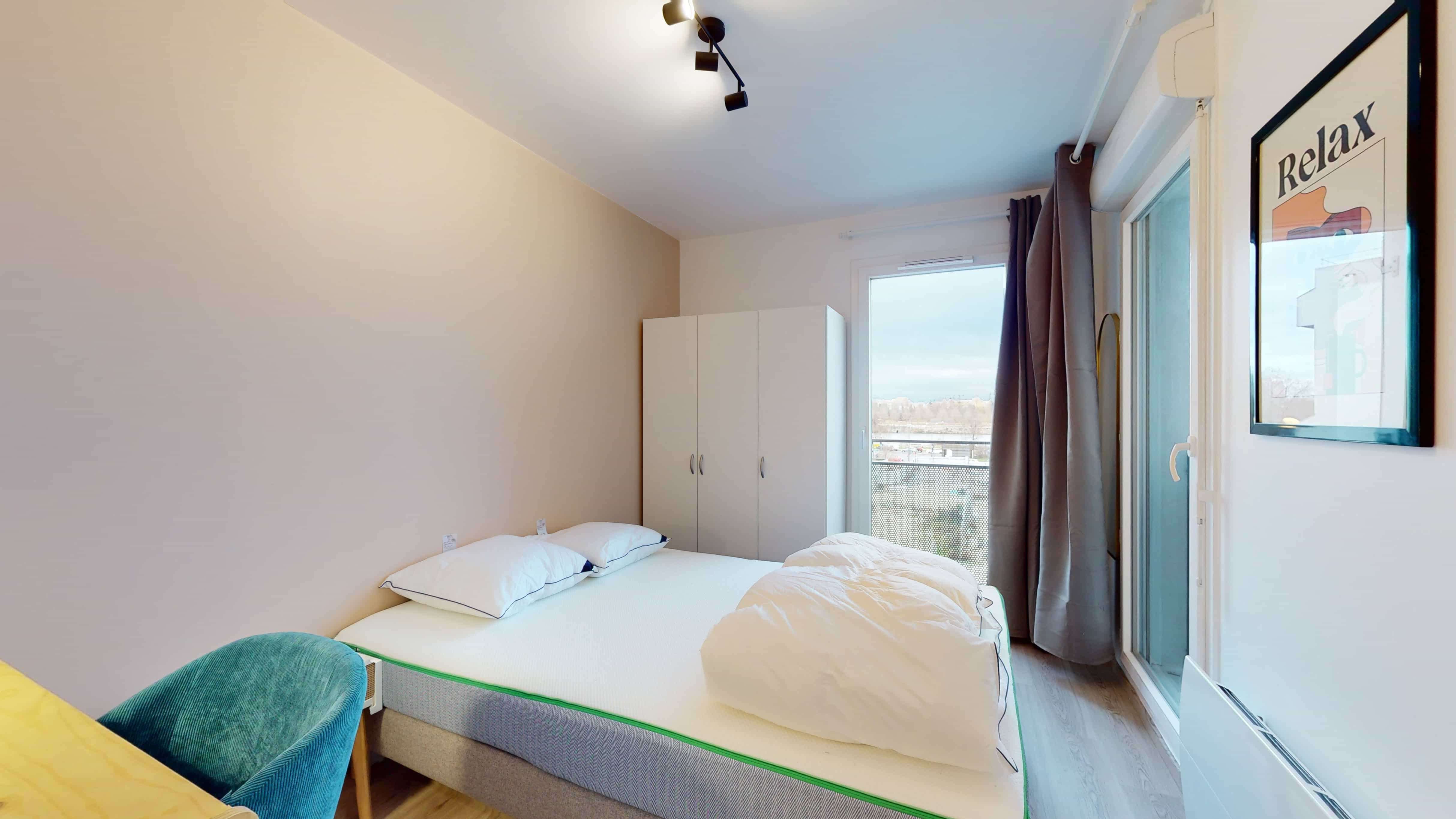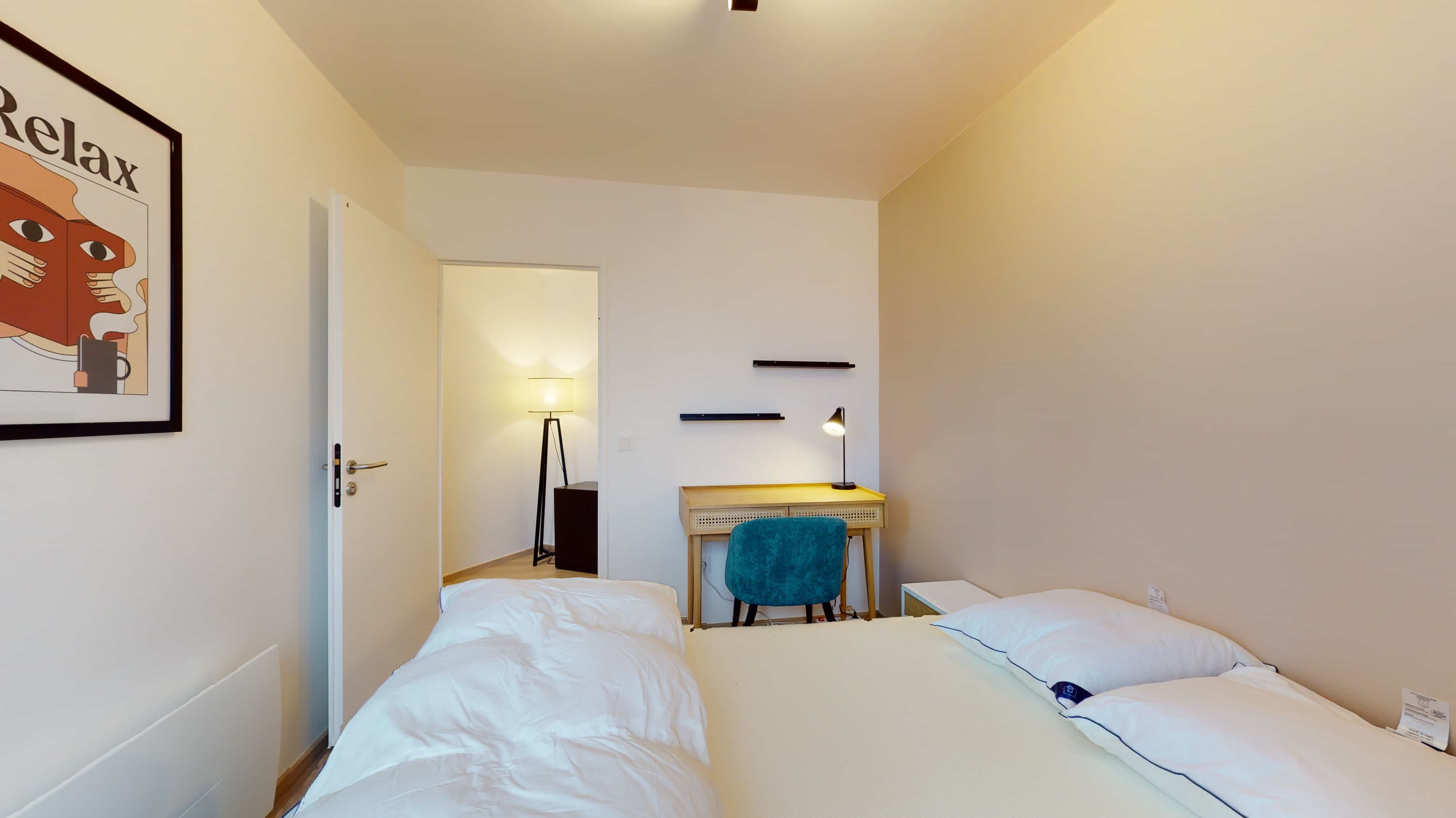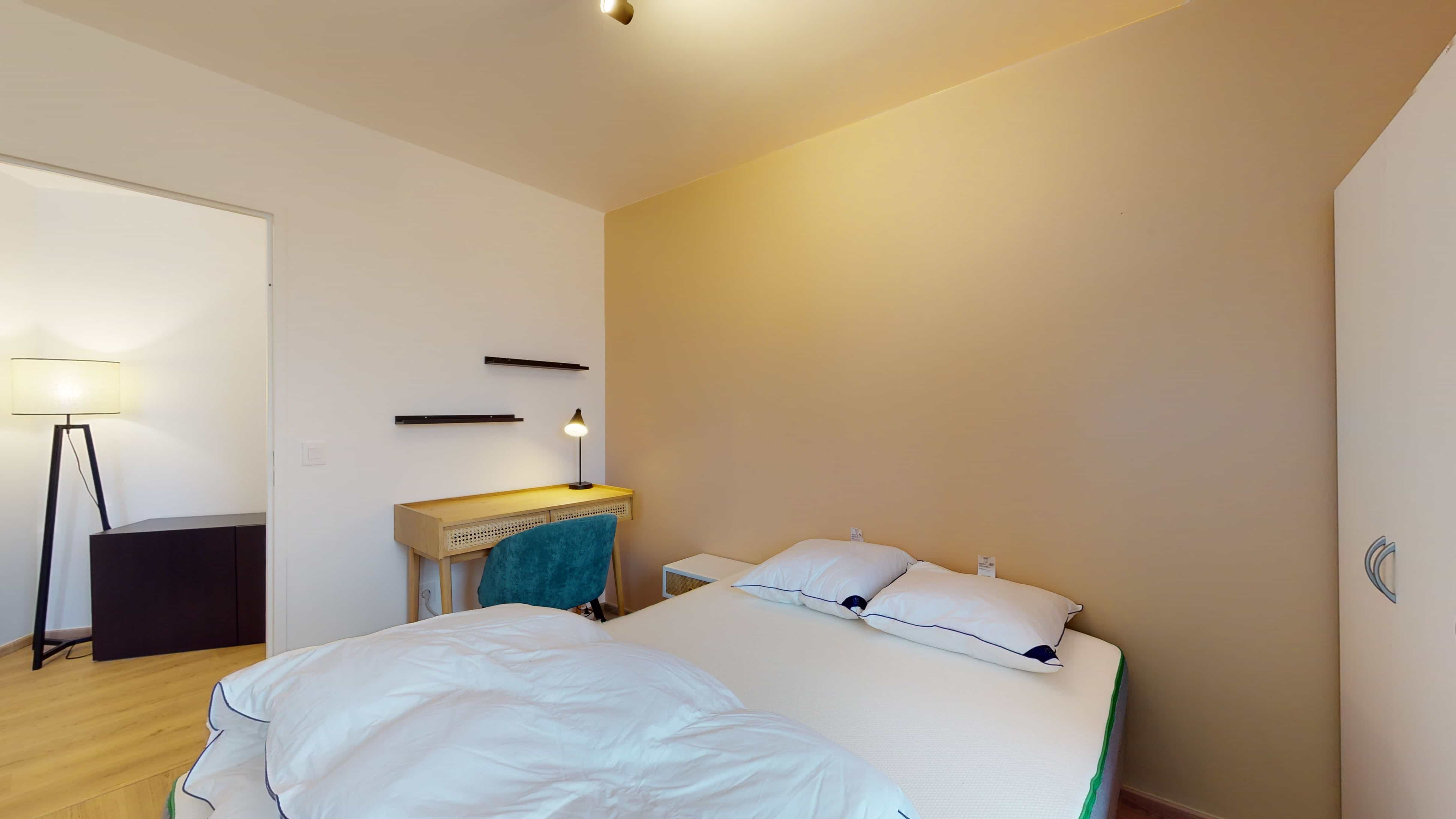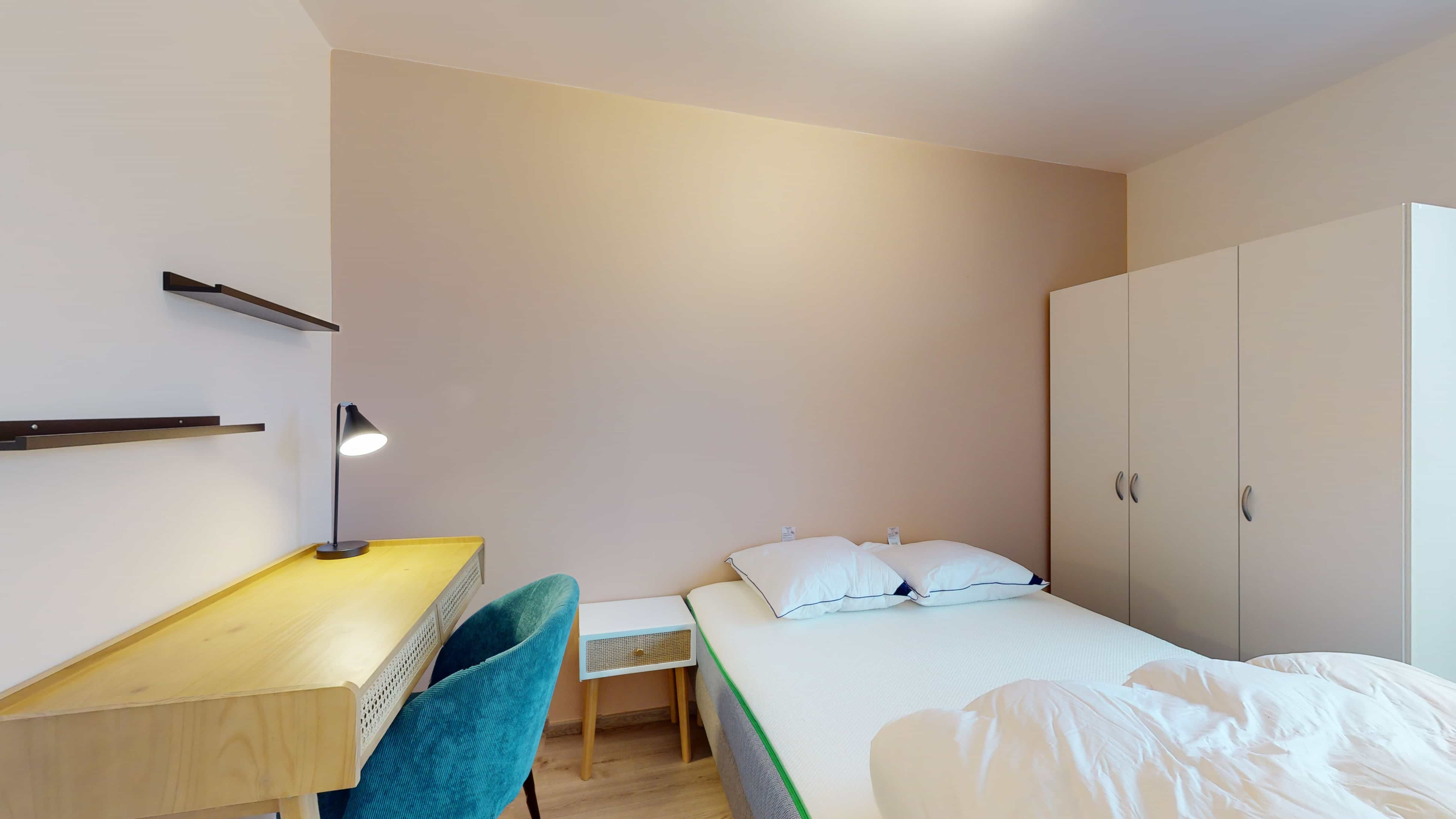 La chambre Room 5 est un petit nid douillet prévu pour une personne. Avec ses 10 m², elle offre un lit double confortable avec de la literie de qualité, une armoire pour ranger vos affaires, ainsi qu'un bureau et une chaise pour vos moments d'études ou de travail. La chambre partage une salle de bain propre et moderne avec d'autres locataires.