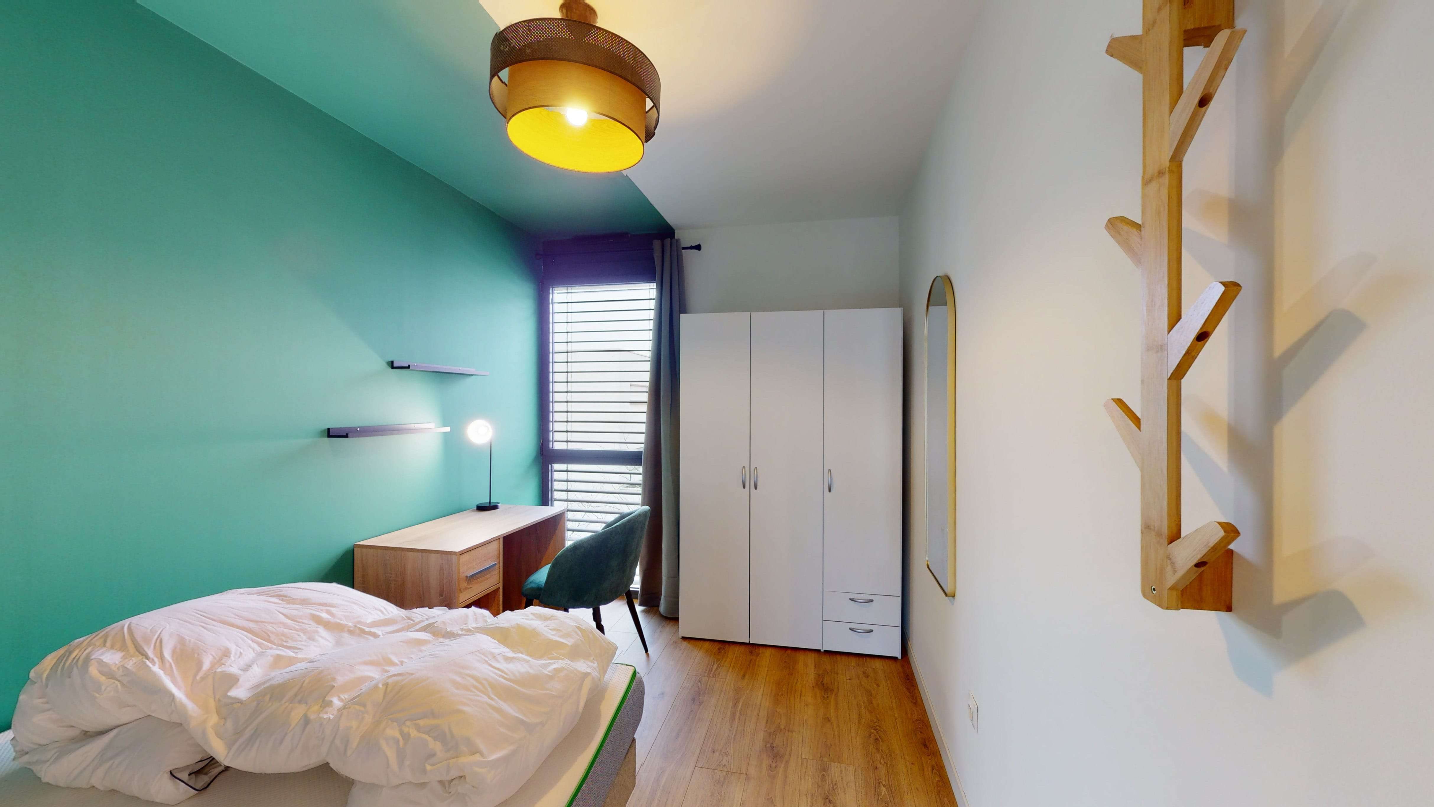 La chambre en question, nommée "Room 1", est un cocon douillet de 9 m², idéal pour se ressourcer. Elle dispose d'un lit double avec une literie de qualité, d'une armoire pour ranger vos affaires, ainsi que d'un bureau et d'une chaise, parfaits pour étudier ou travailler en toute tranquillité. La salle de bain est à partager avec les autres résidents.
