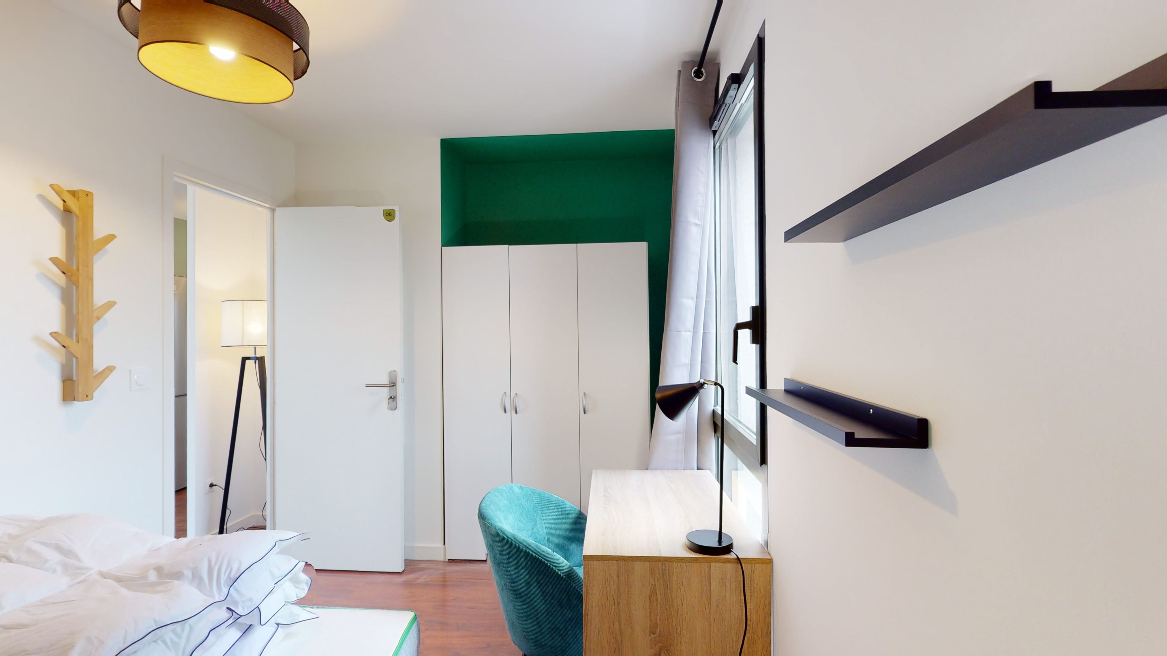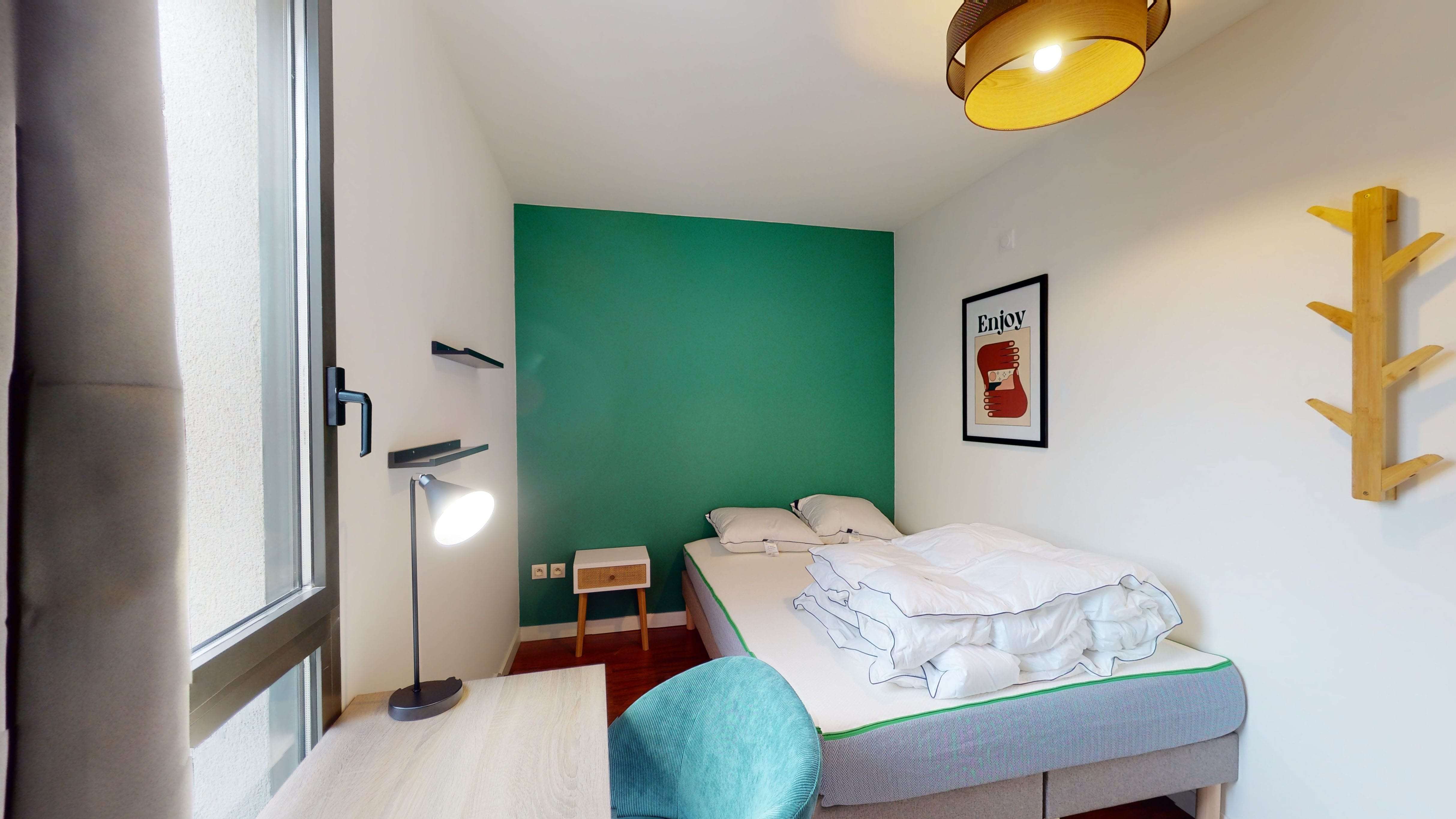 La chambre disponible, Room 5, est un espace privé conçu juste pour vous. D'une superficie de 9 m², elle est aménagée avec un lit double confortable, une armoire spacieuse pour tous vos vêtements, une chaise et un bureau pour vos sessions de travail ou d'étude. La chambre partage une salle de bain propre et moderne avec douche et toilettes.
