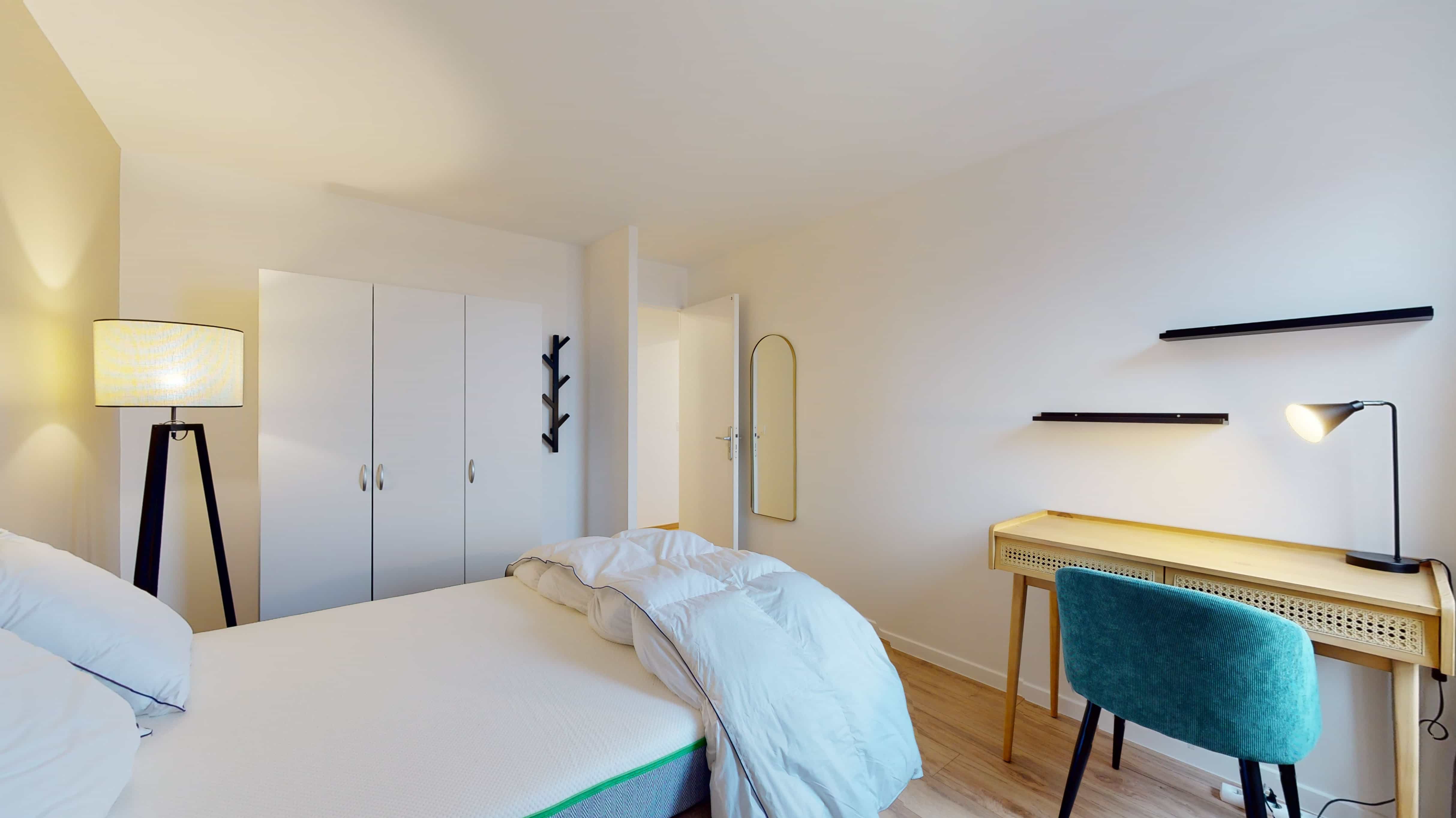 La chambre nommée Room 3 est un petit cocon de 12 m² juste pour toi. Elle a un grand lit douillet, une armoire pour tes habits, une chaise et un bureau pour travailler ou étudier. La salle de bain avec douche est à partager, et elle est bien propre et moderne.