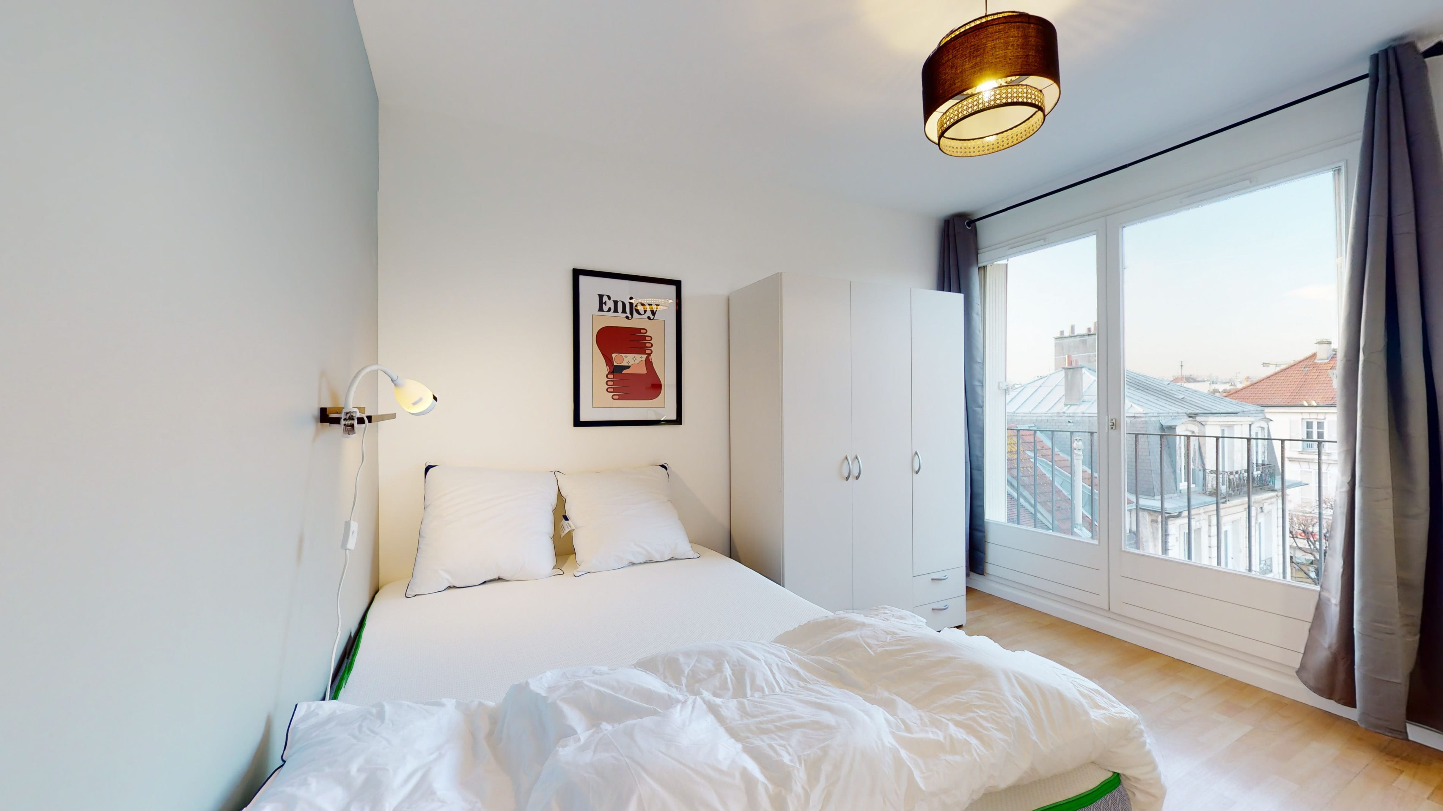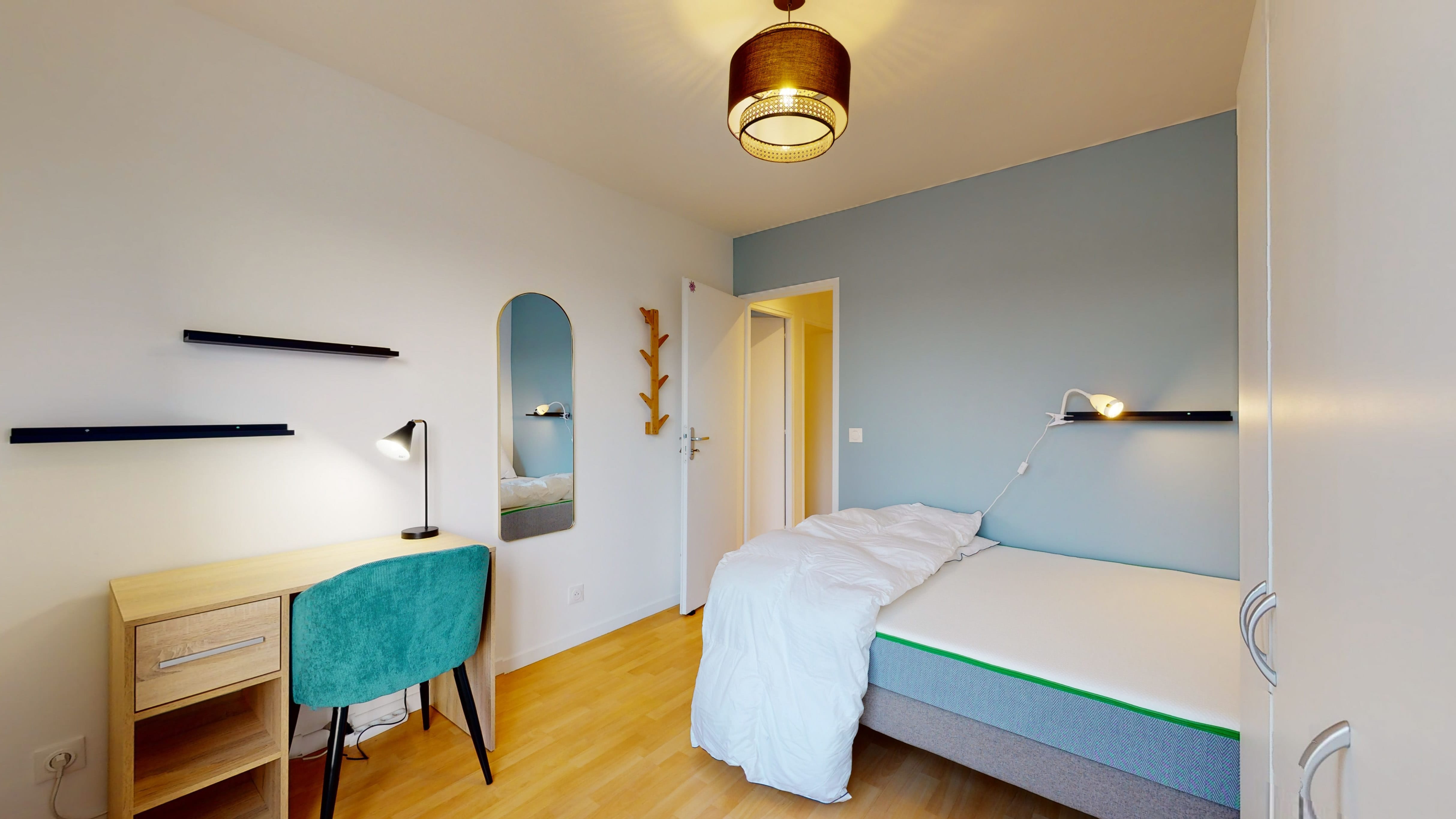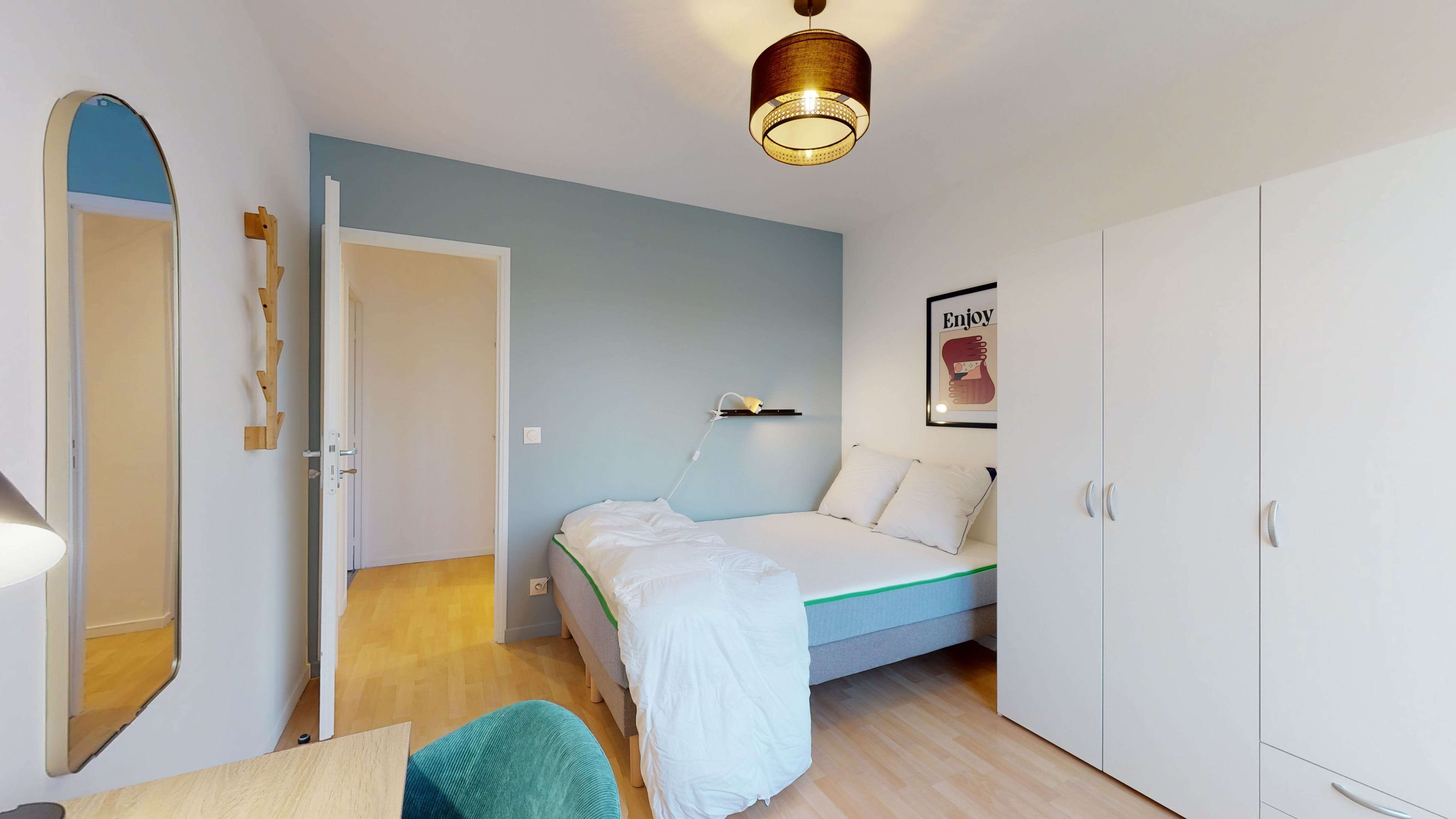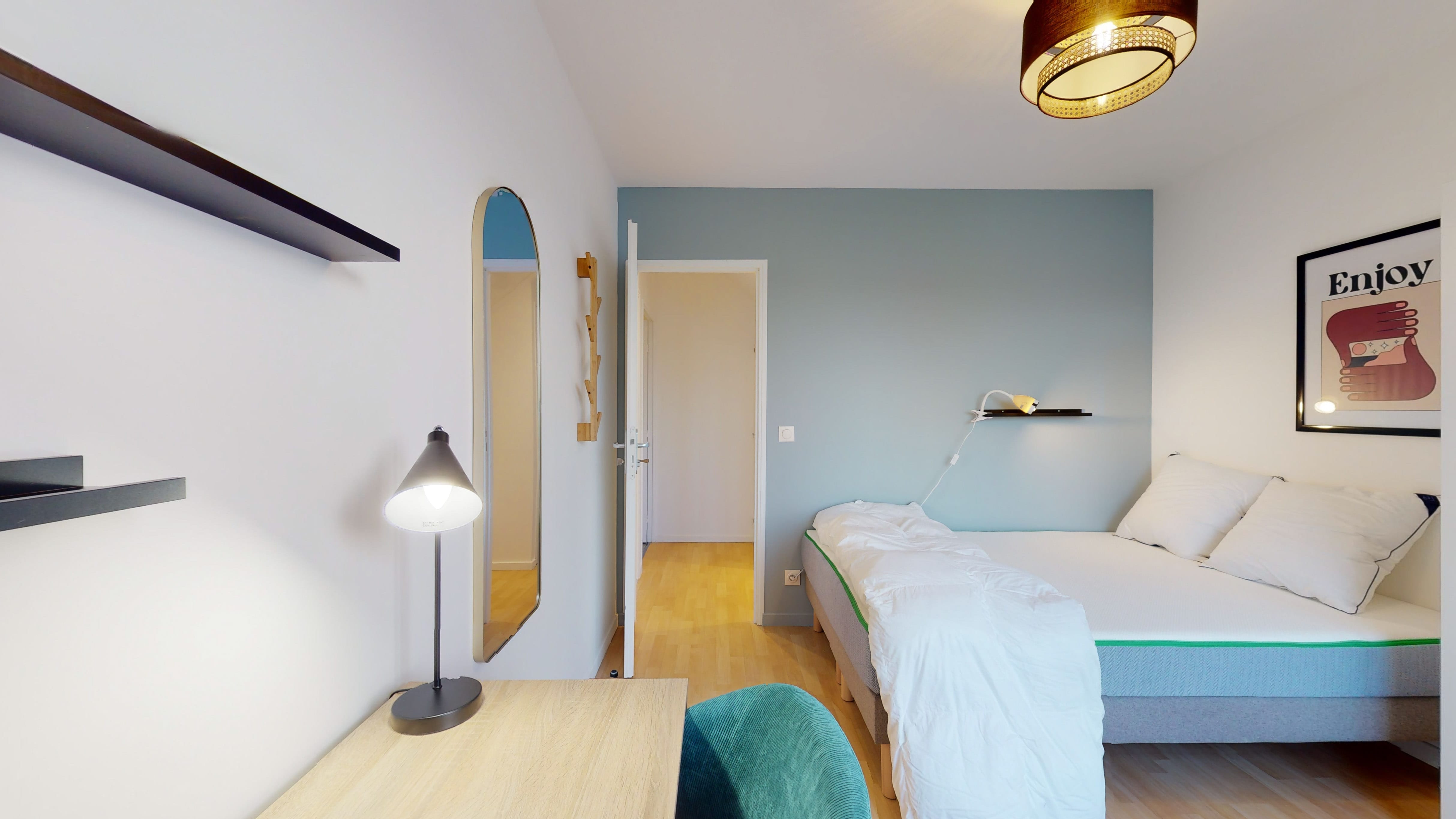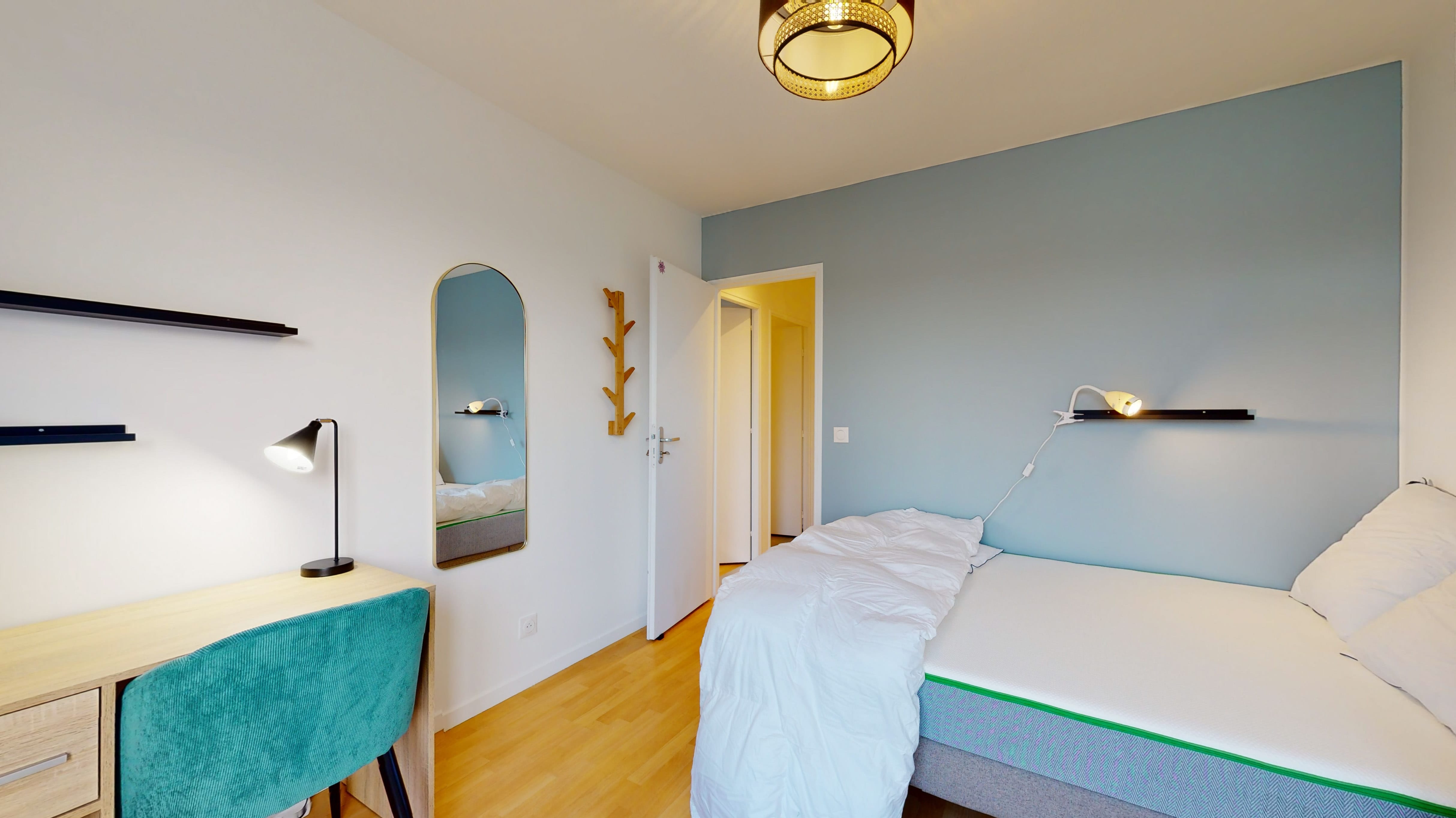 Room 4 est votre espace personnel conçu pour une personne. Elle est aménagée avec un confortable lit double, une armoire pour vos vêtements, une chaise et un bureau pour travailler ou étudier en toute tranquillité. La chambre de 10 m² partage une salle de bain moderne, comprenant douche, lavabo et toilettes, avec d'autres locataires de l'appartement.