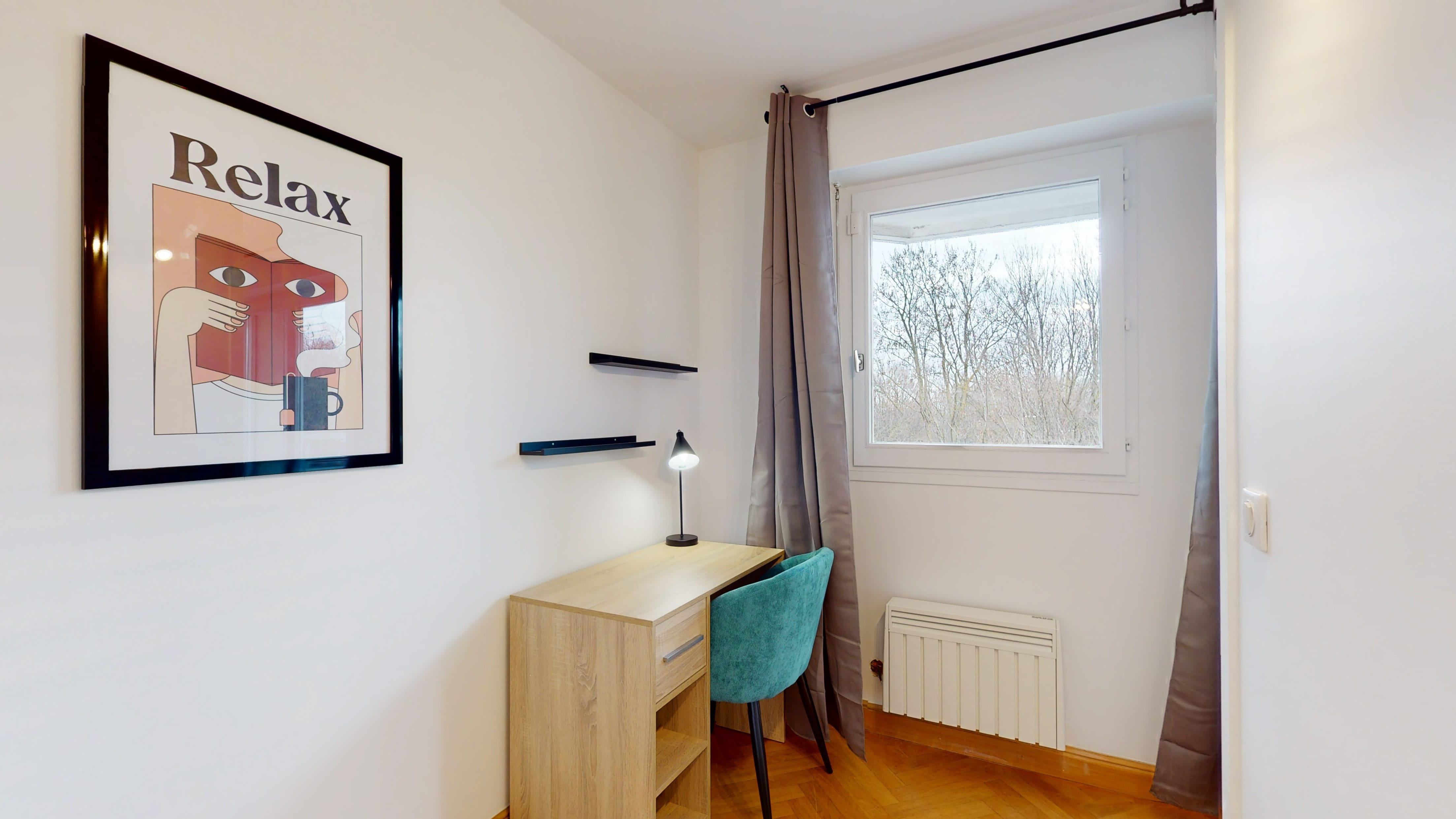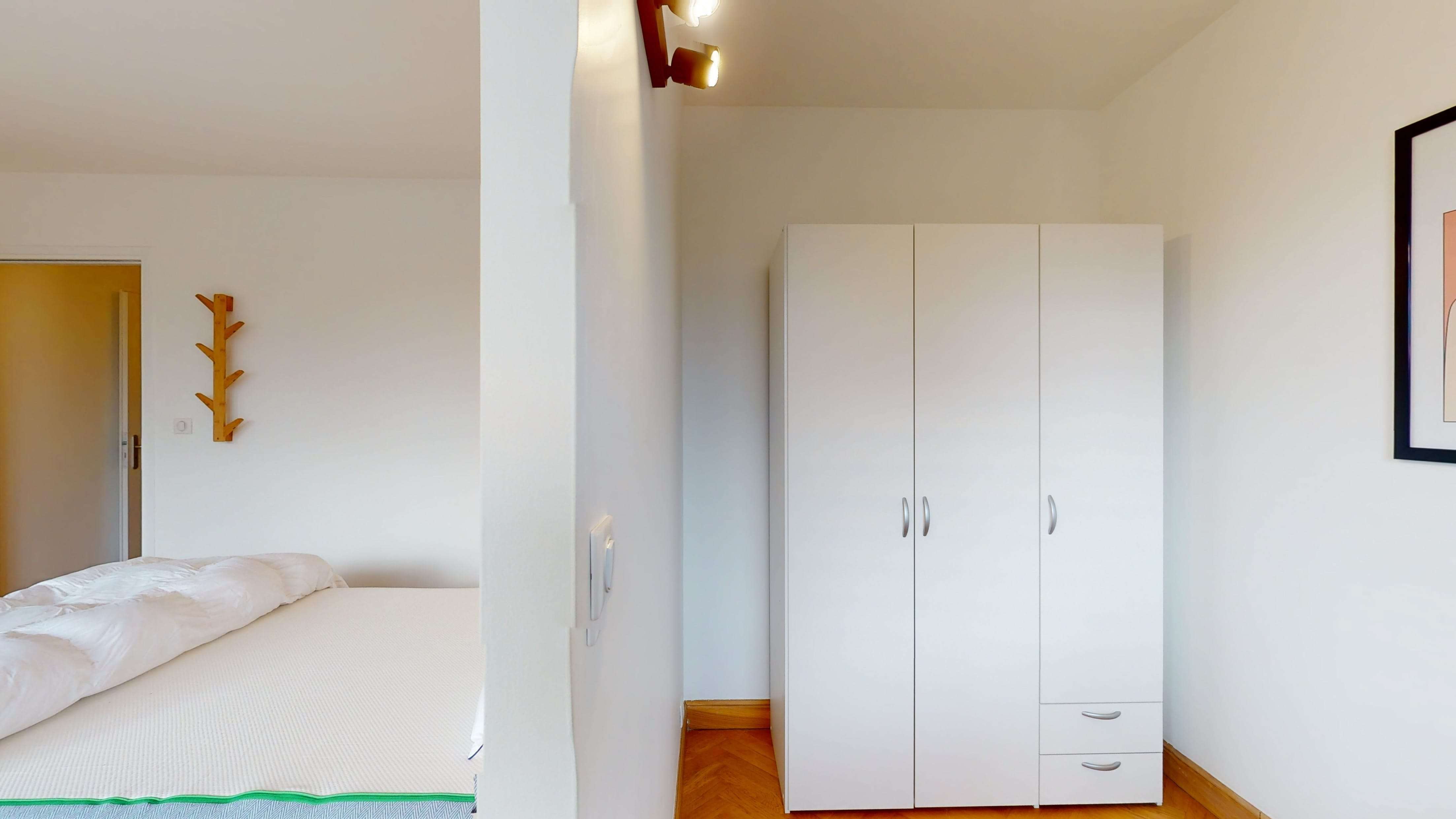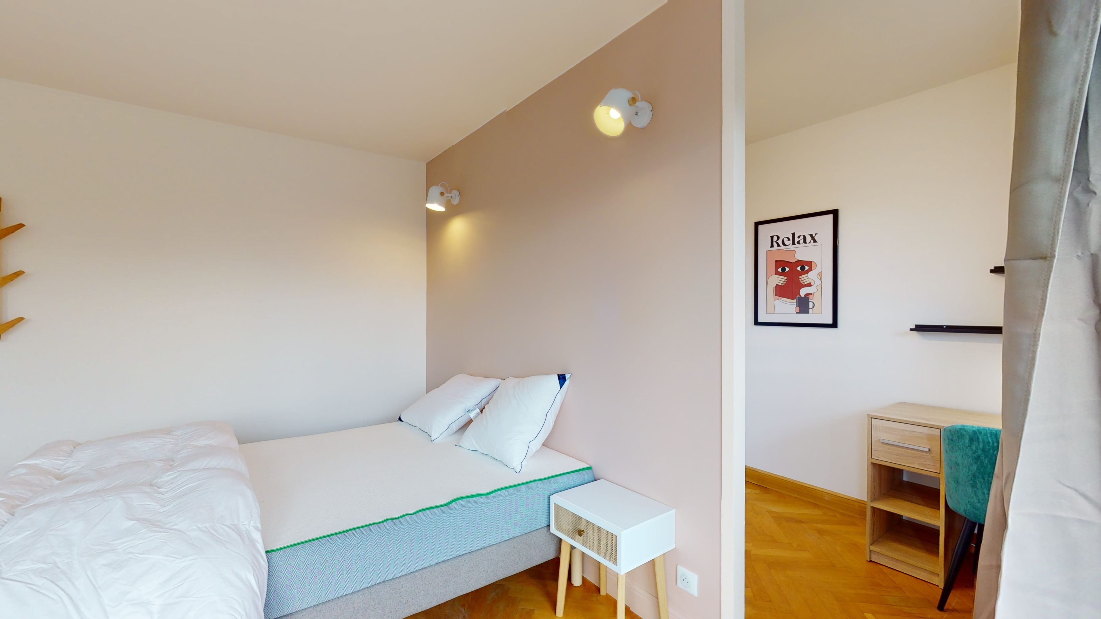 Room 1, conçue spécialement pour une personne, est un vrai petit cocon de 19m². Elle dispose d'un confortable lit double pour des nuits douces, d'une armoire où ranger toutes vos affaires, d'une chaise et d'un bureau pour travailler ou étudier tranquillement. Vous profiterez aussi d'une salle de bain privative avec douche pour vous préparer en toute intimité, et d'un accès au balcon pour profiter de la vue.