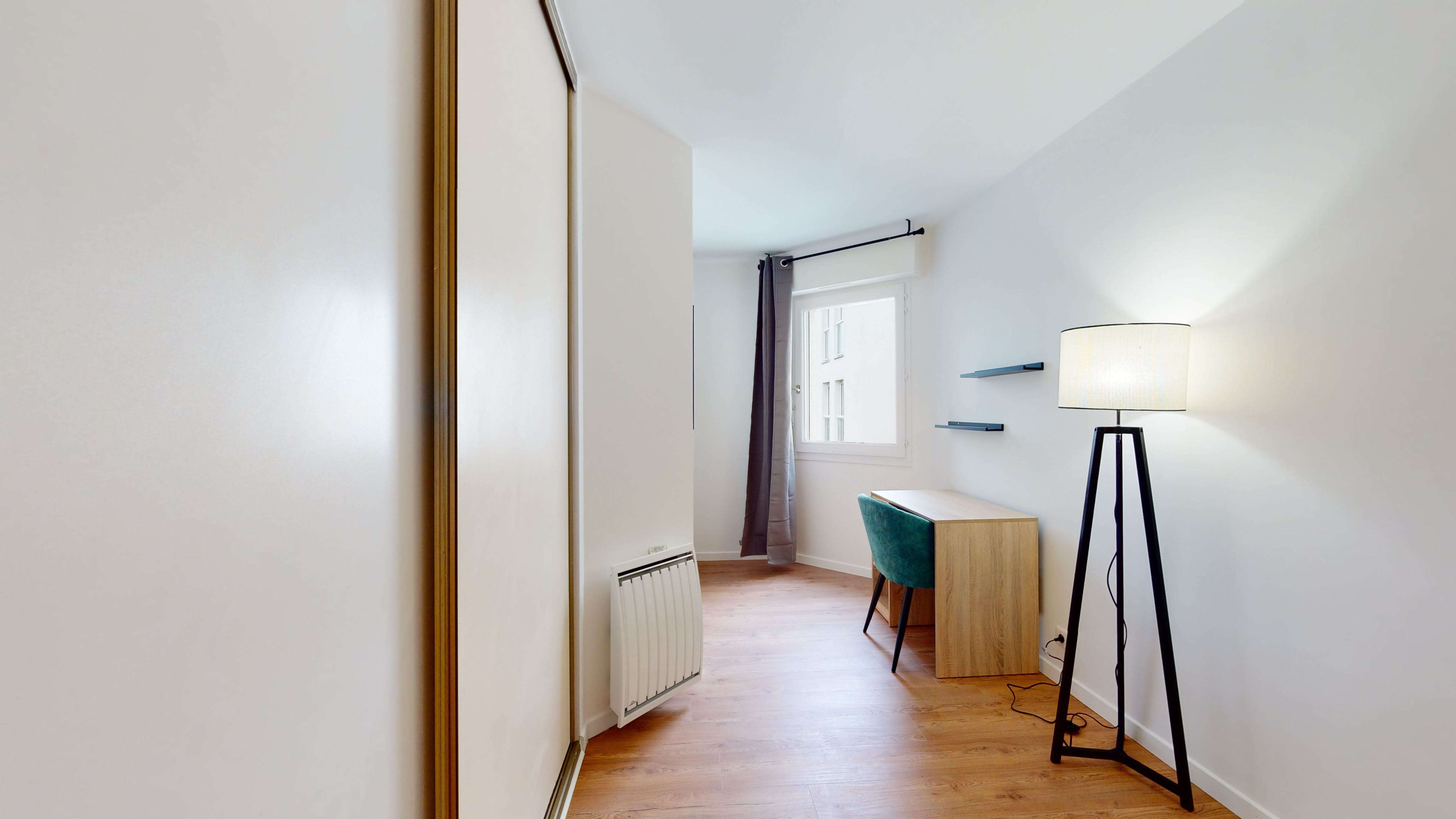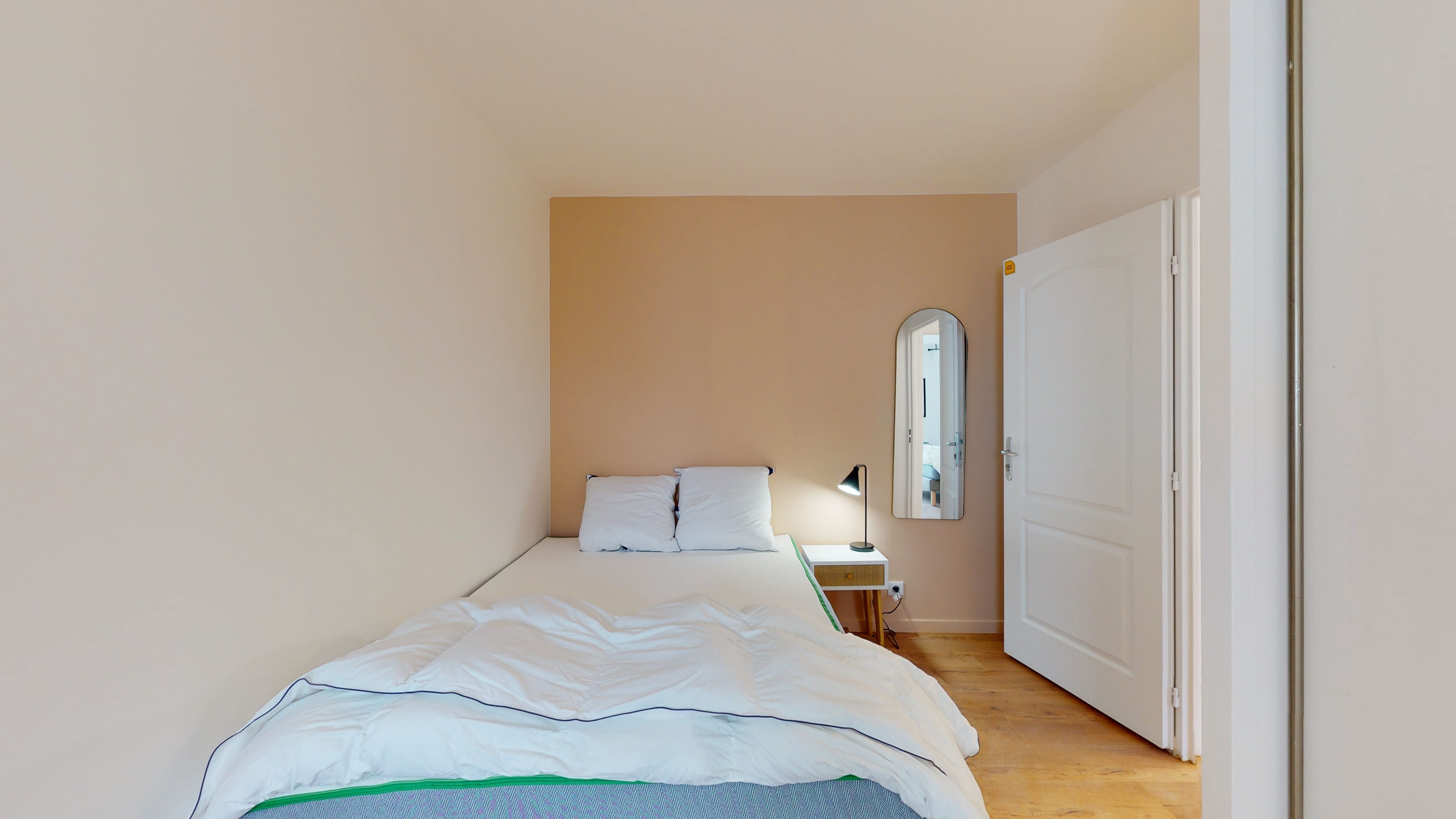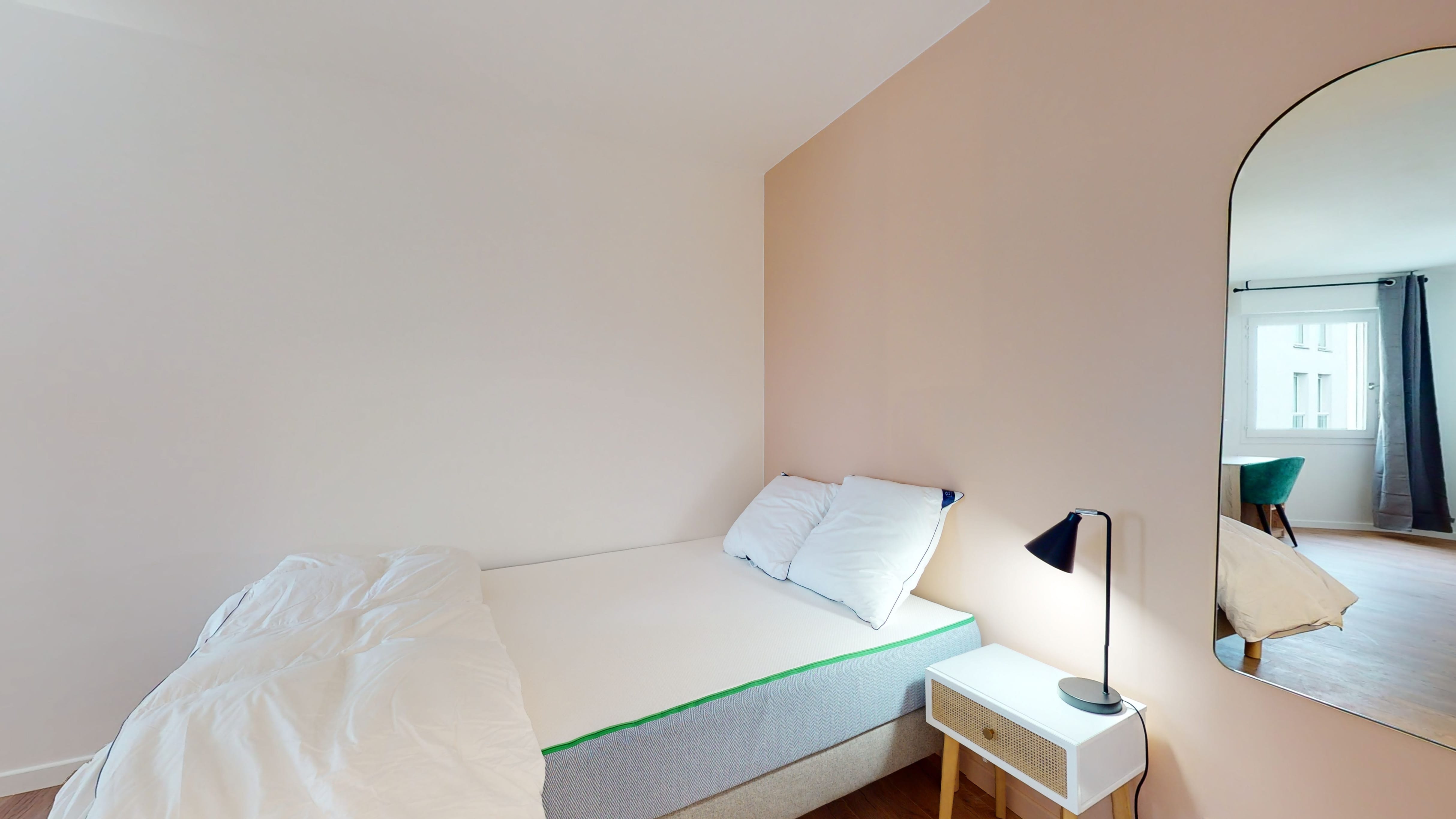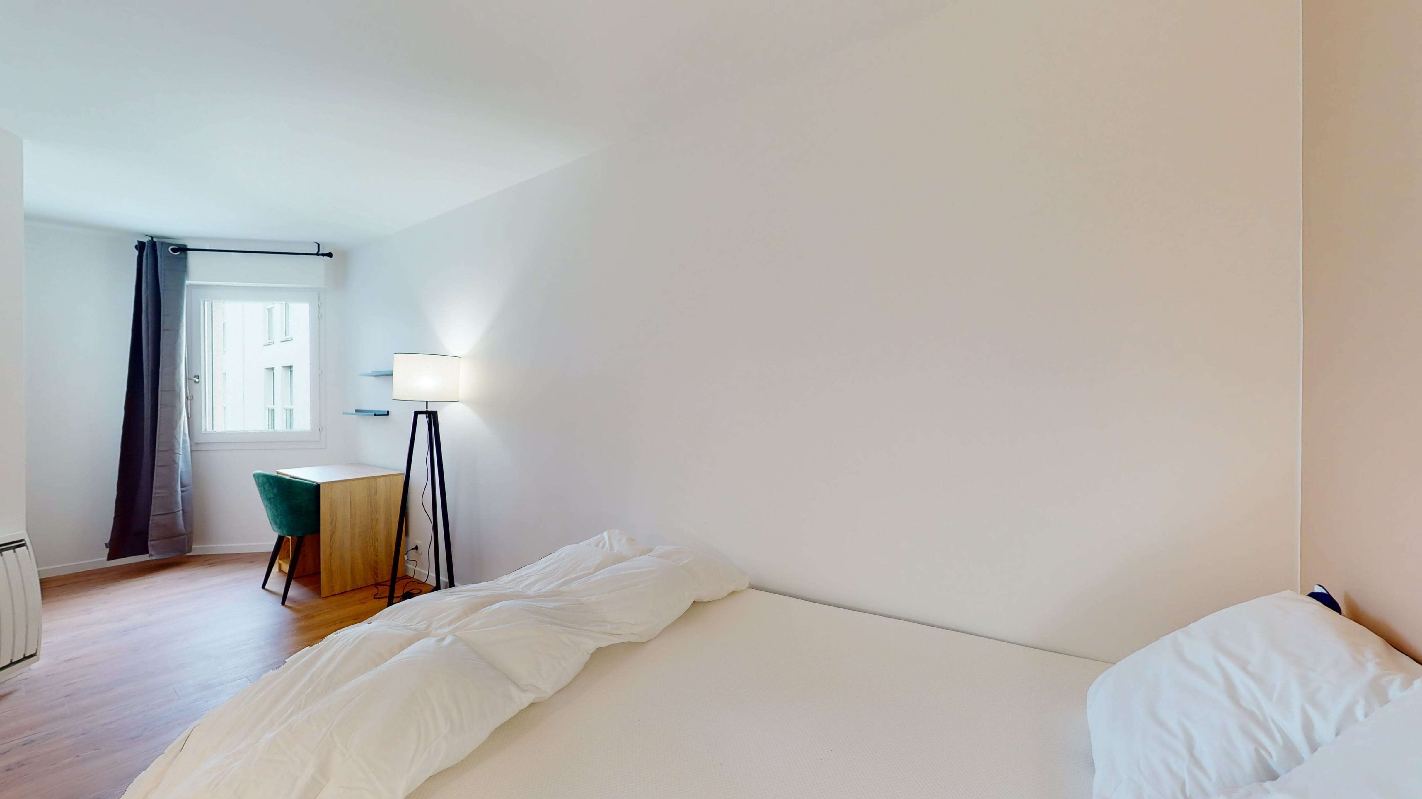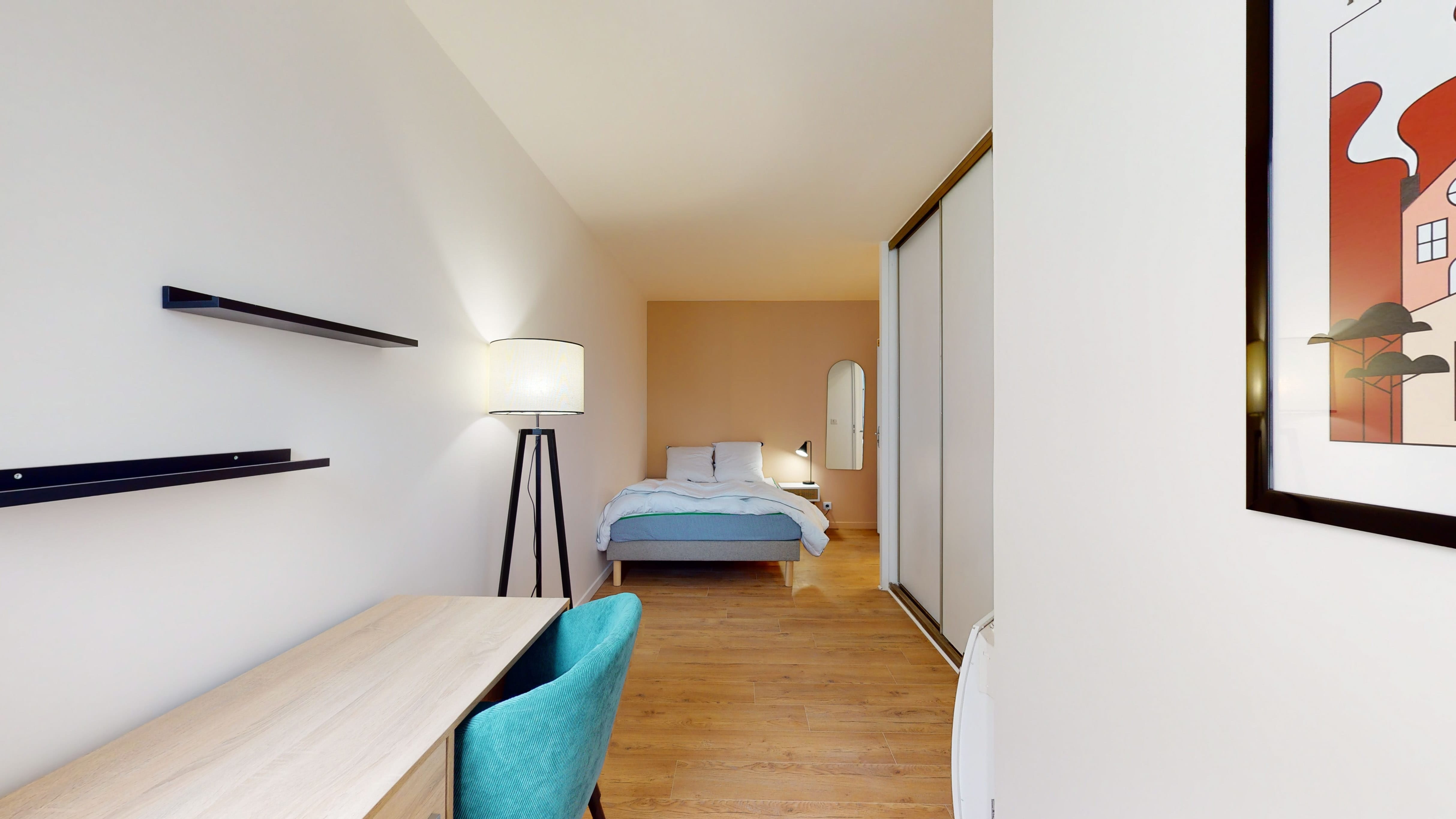La chambre "Room 2" est parfaite pour une personne avec son lit double confortable, son bureau pour travailler ou étudier, une chaise, et une armoire pour ranger toutes vos affaires. Cette chambre de 14 m² est conçue pour votre intimité et partage une salle de bain moderne avec d'autres locataires.