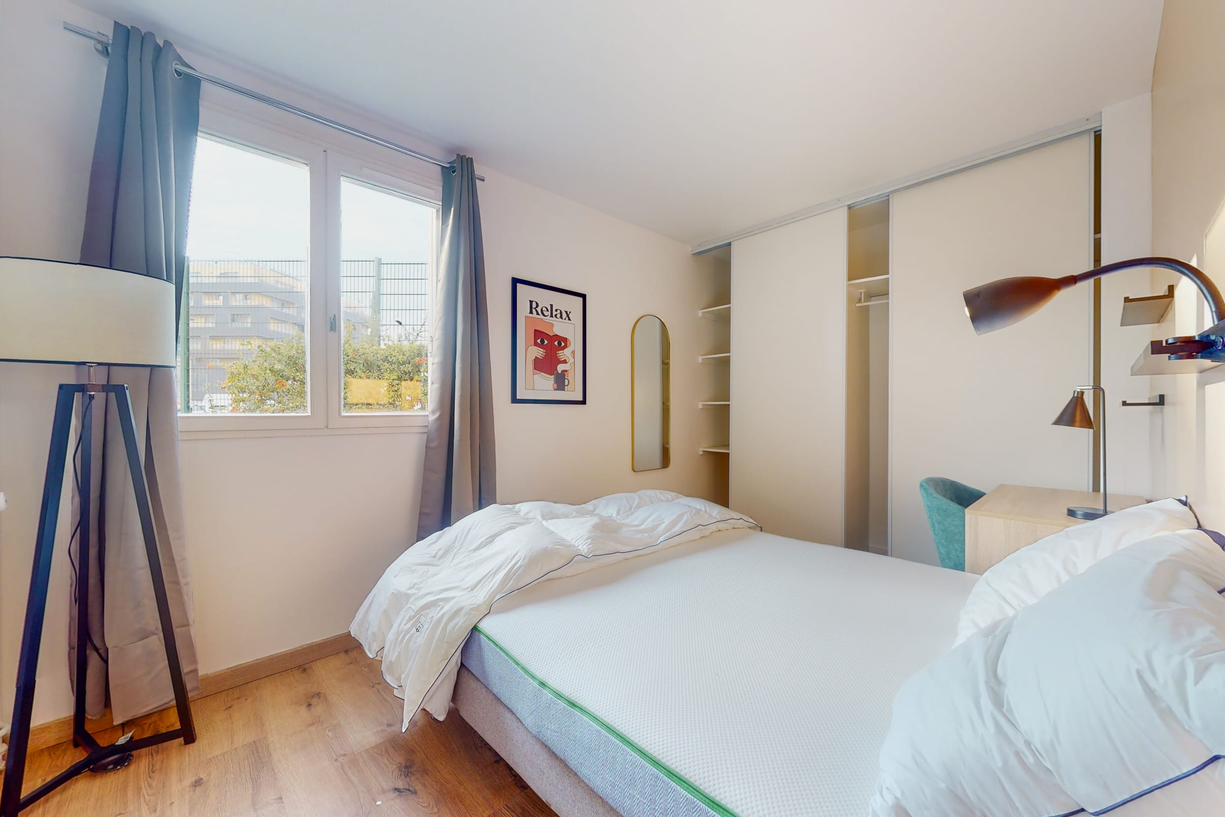 La chambre Room 2 est parfaite pour une personne. Avec ses 9 m², elle est meublée d'un lit double confortable, d'une armoire pour ranger vos affaires, d'une chaise et d'un bureau pour travailler ou étudier. La chambre partage une salle de bain moderne avec douche, lavabo et toilettes avec les autres locataires.