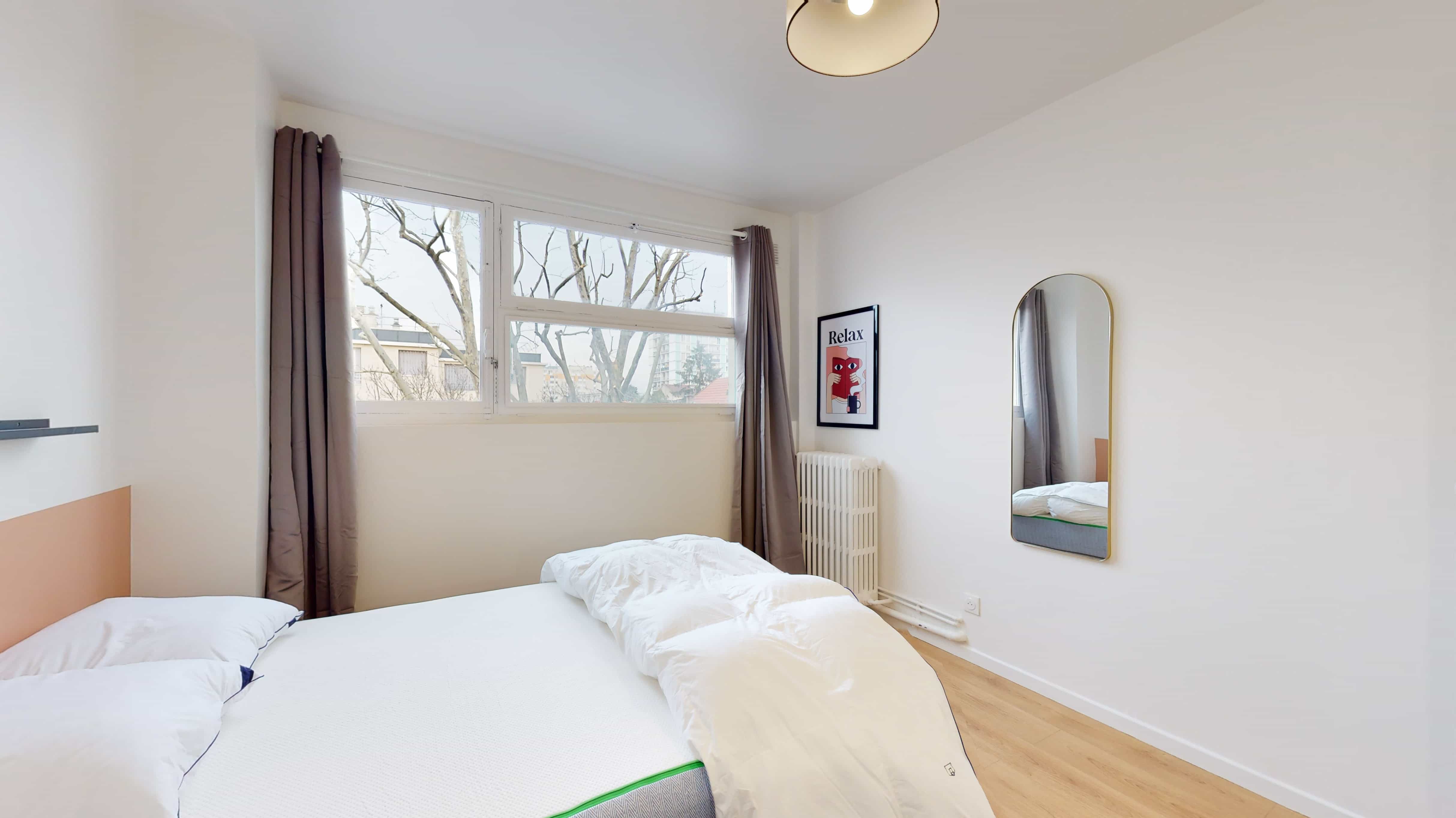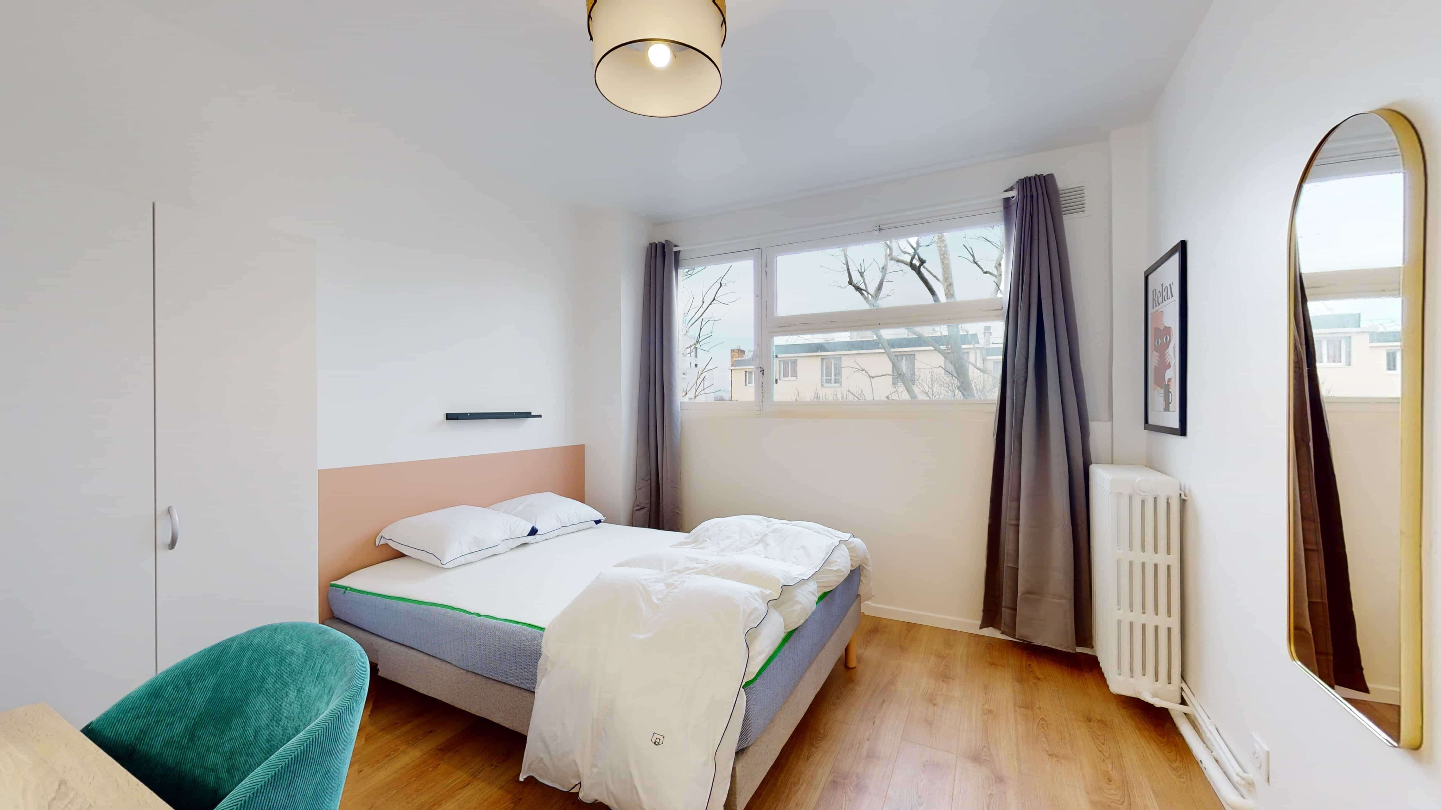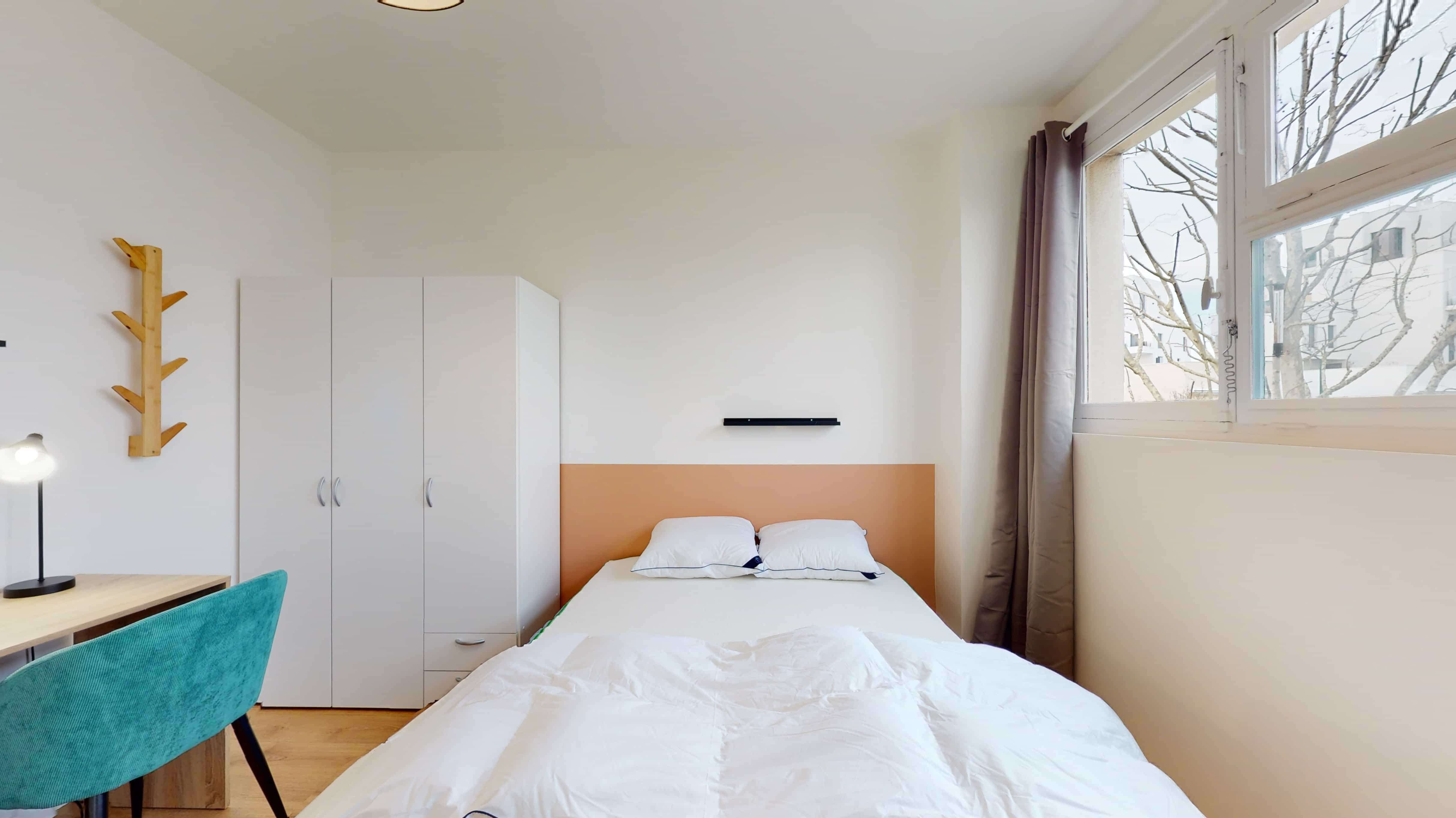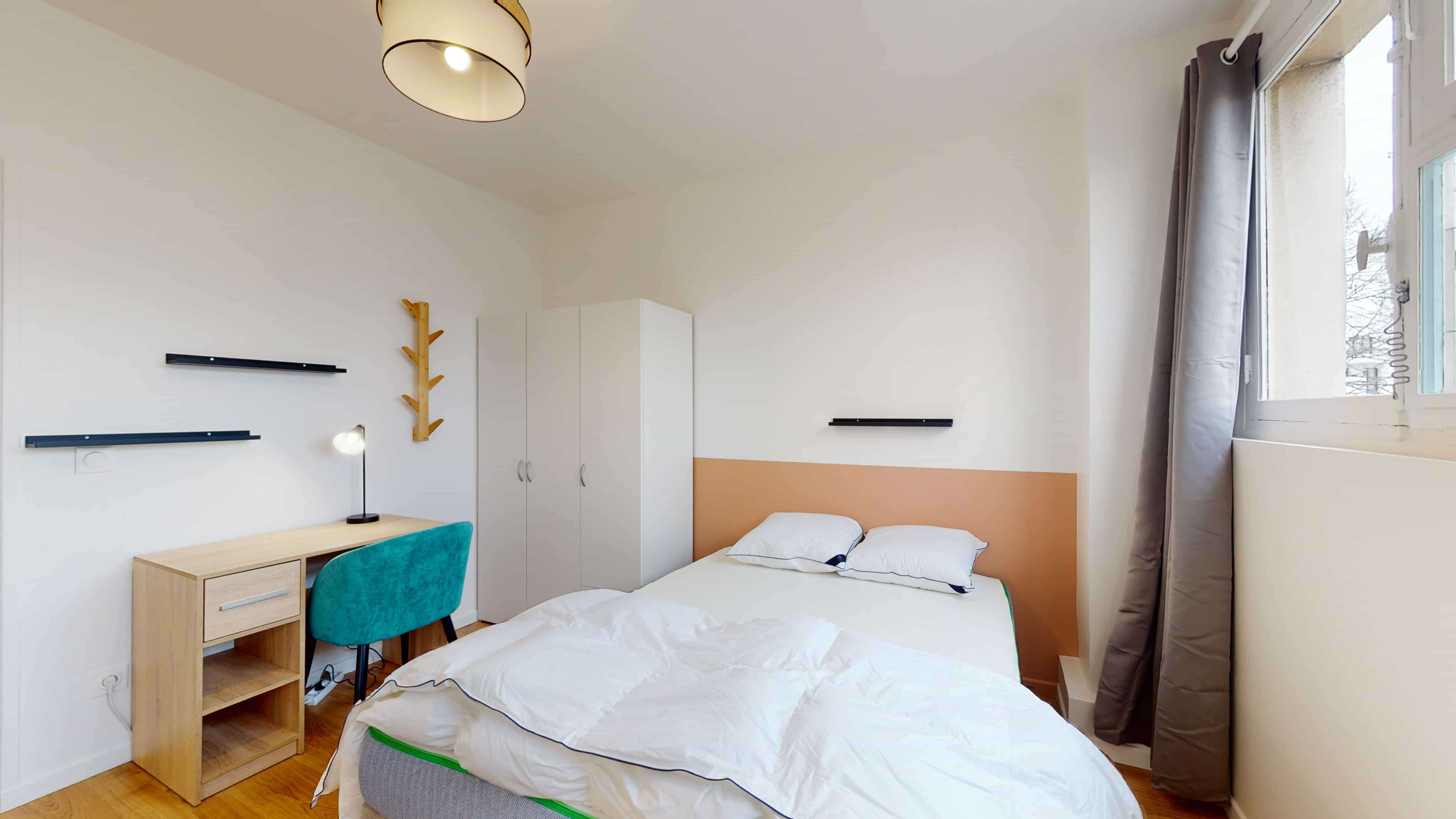 La chambre 2, pensée pour une personne, offre tout le confort nécessaire avec un lit double confortable, une grande armoire pour ranger toutes vos affaires, un bureau et une chaise pour travailler ou étudier. La chambre mesure 10 m² et bénéficie d'une salle de bain partagée avec douche, lavabo et toilettes.