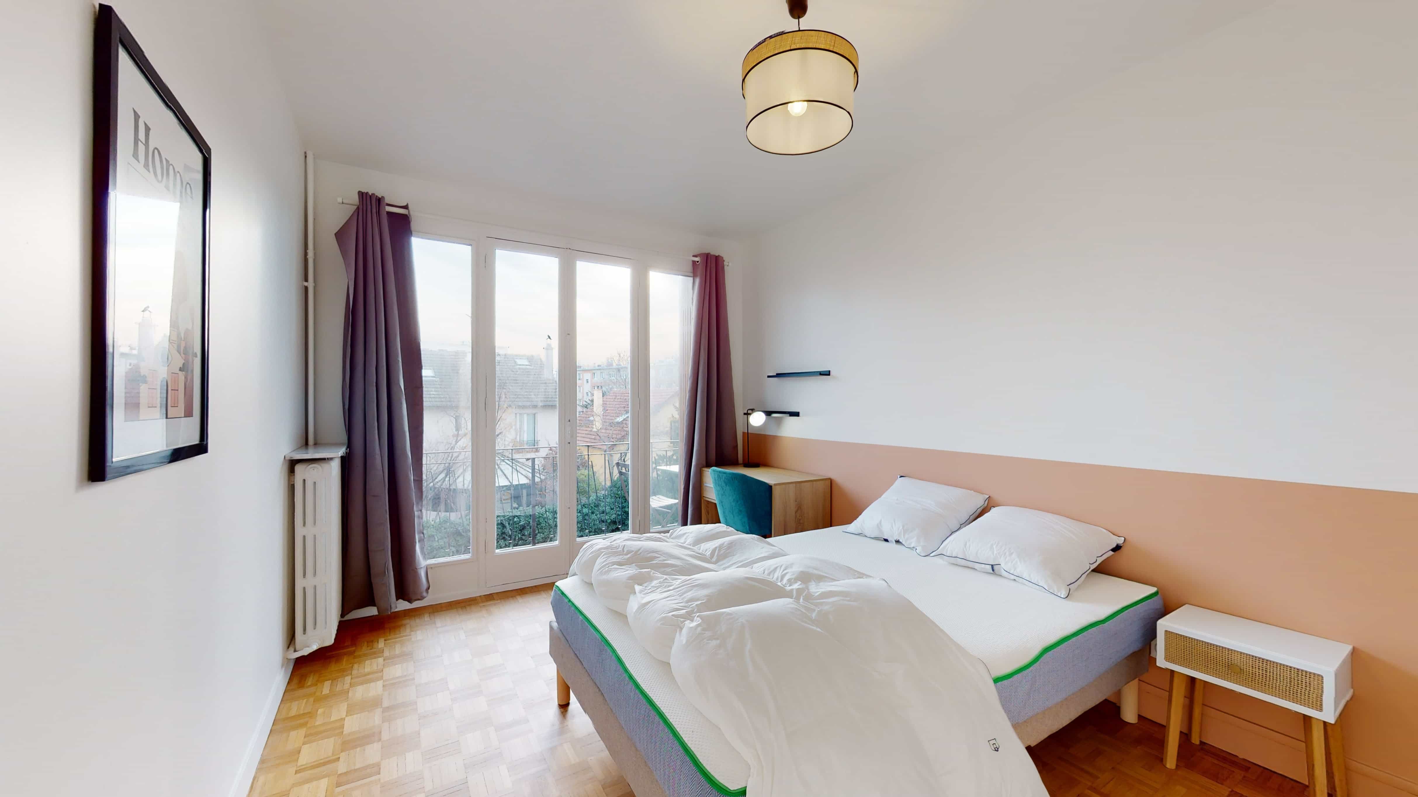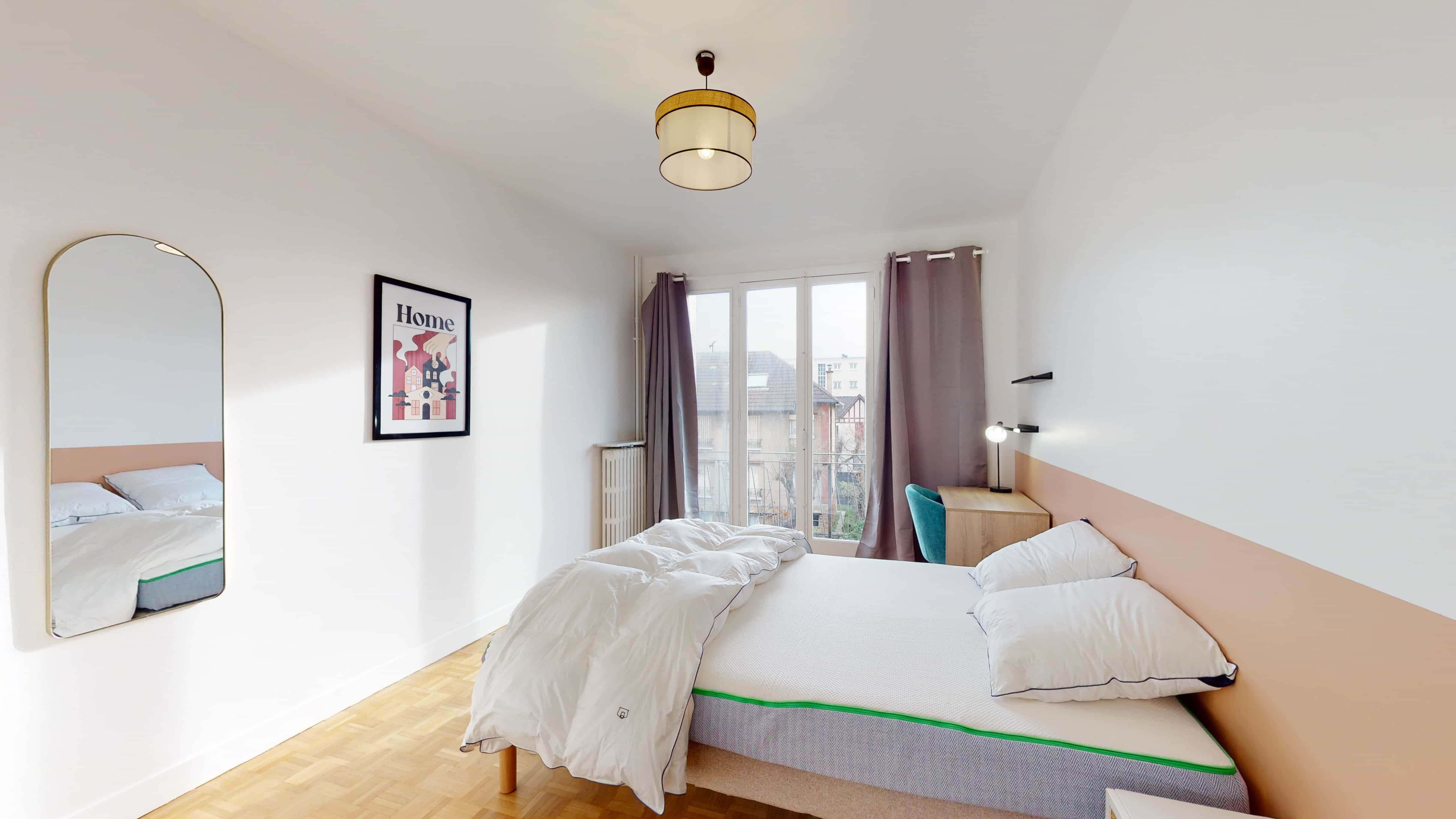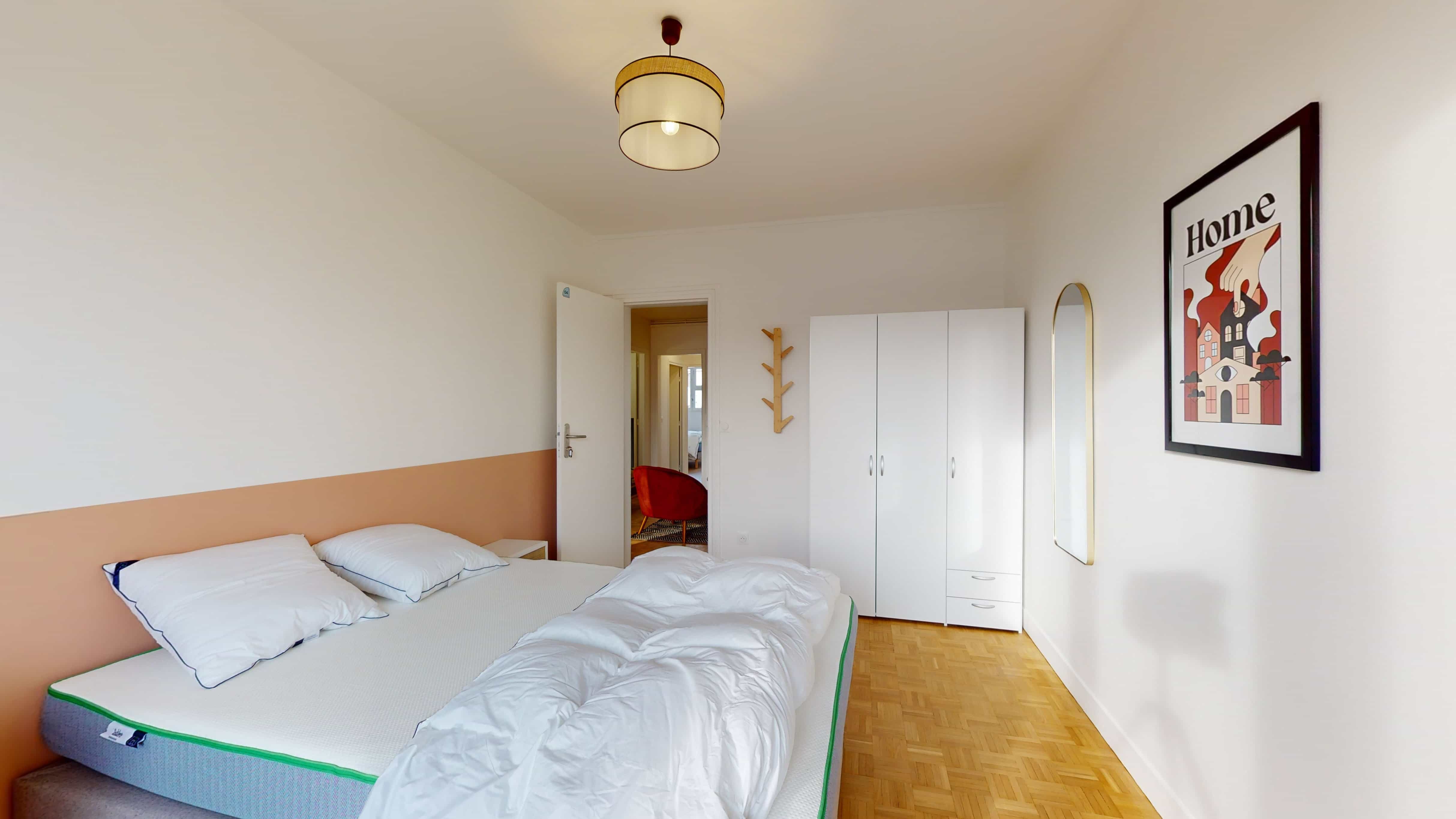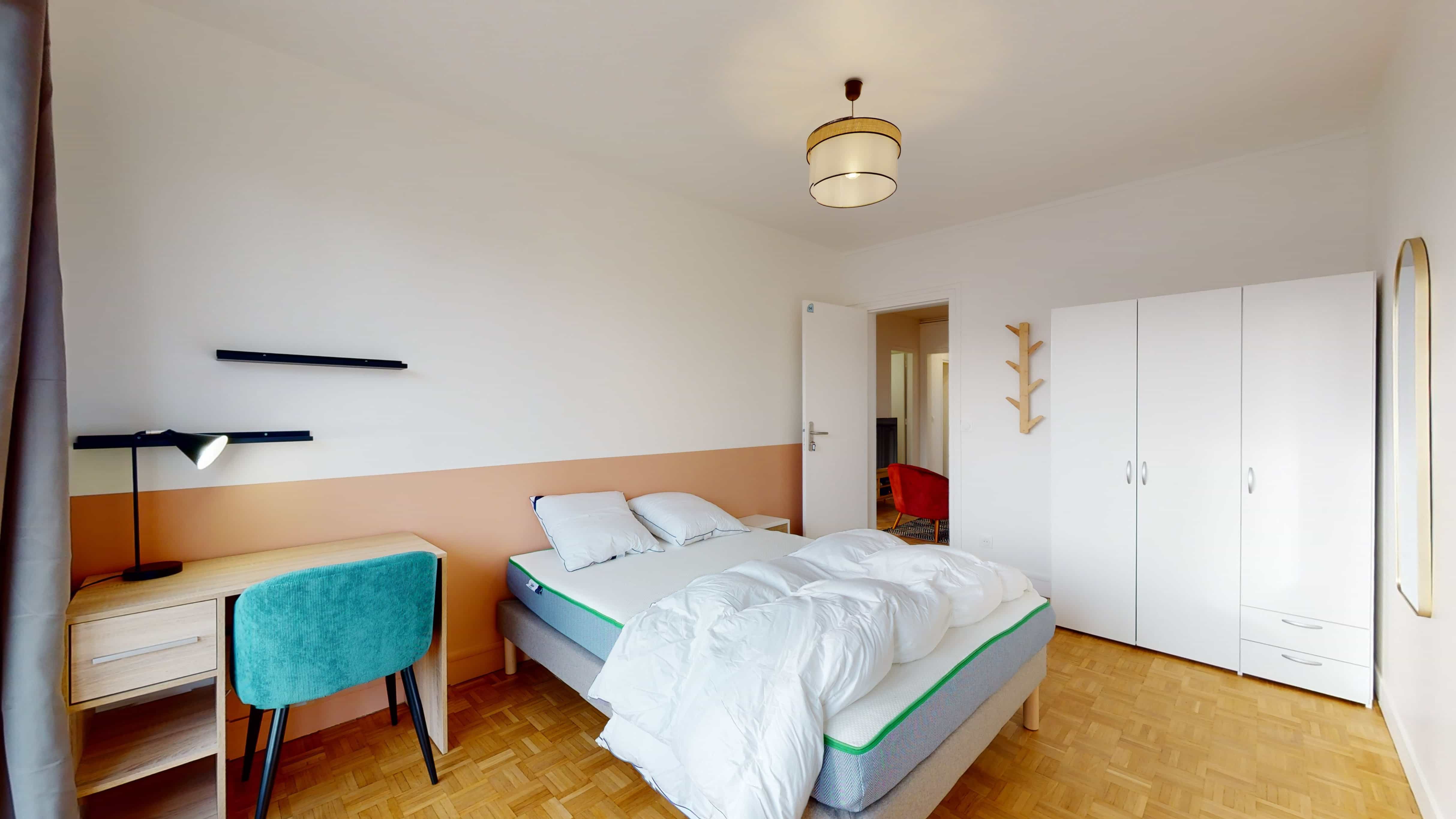La chambre 4, pensée pour une personne, offre un cocon personnel de 13 m². Elle est meublée d'un lit double confortable, d'une grande armoire pour ranger toutes vos affaires, d'une chaise et d'un bureau pour étudier ou travailler tranquillement. Elle partage une salle de bain moderne avec quelques autres locataires, assurant hygiène et commodité.