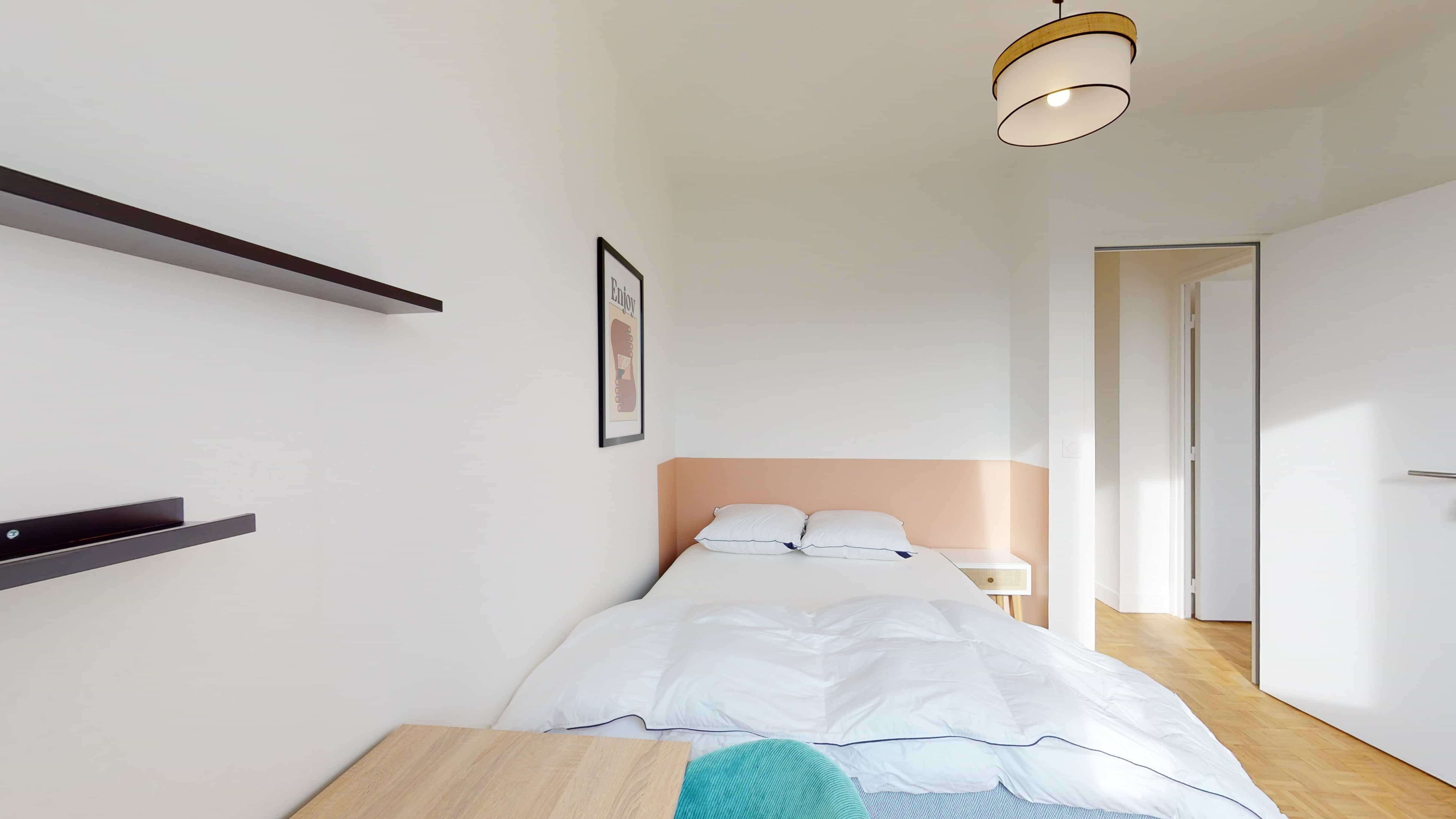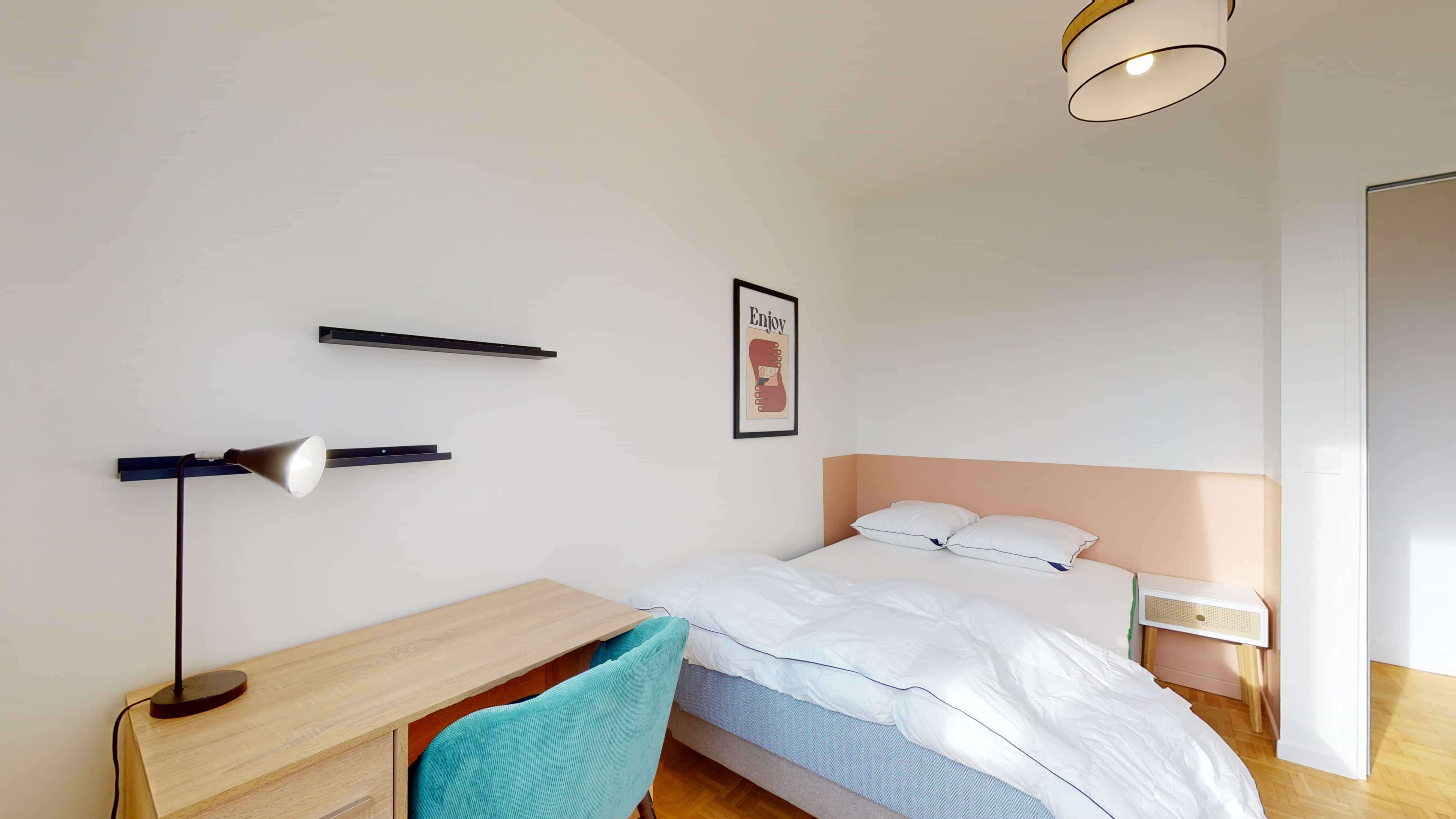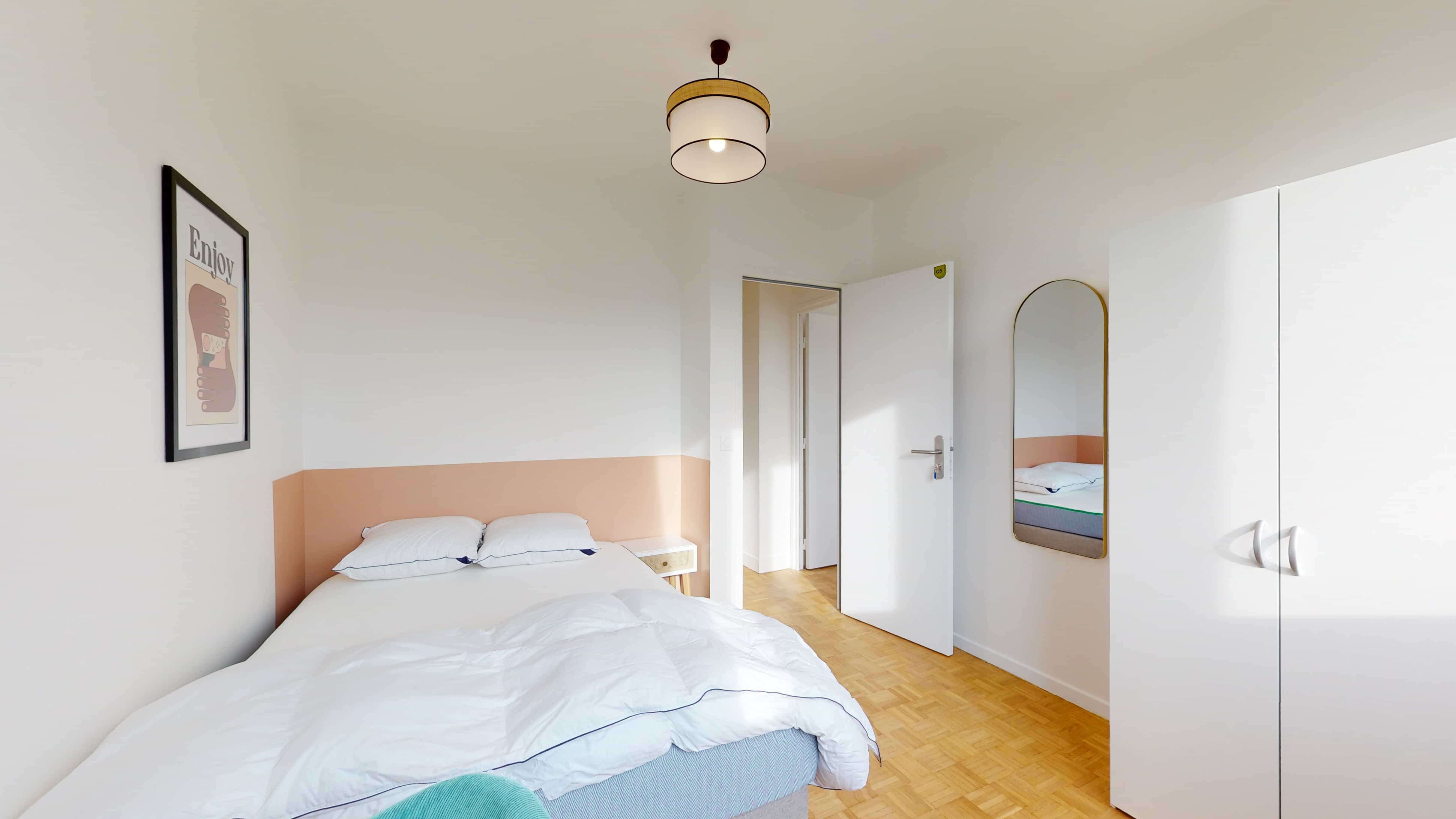 La chambre 5 est un espace personnel conçu pour une personne, offrant un confortable lit double avec de la literie de qualité, une armoire pour ranger vos affaires, ainsi qu'un bureau et une chaise pour vos moments d'étude ou de travail. Cette chambre partage une salle de bain moderne avec d'autres locataires.
