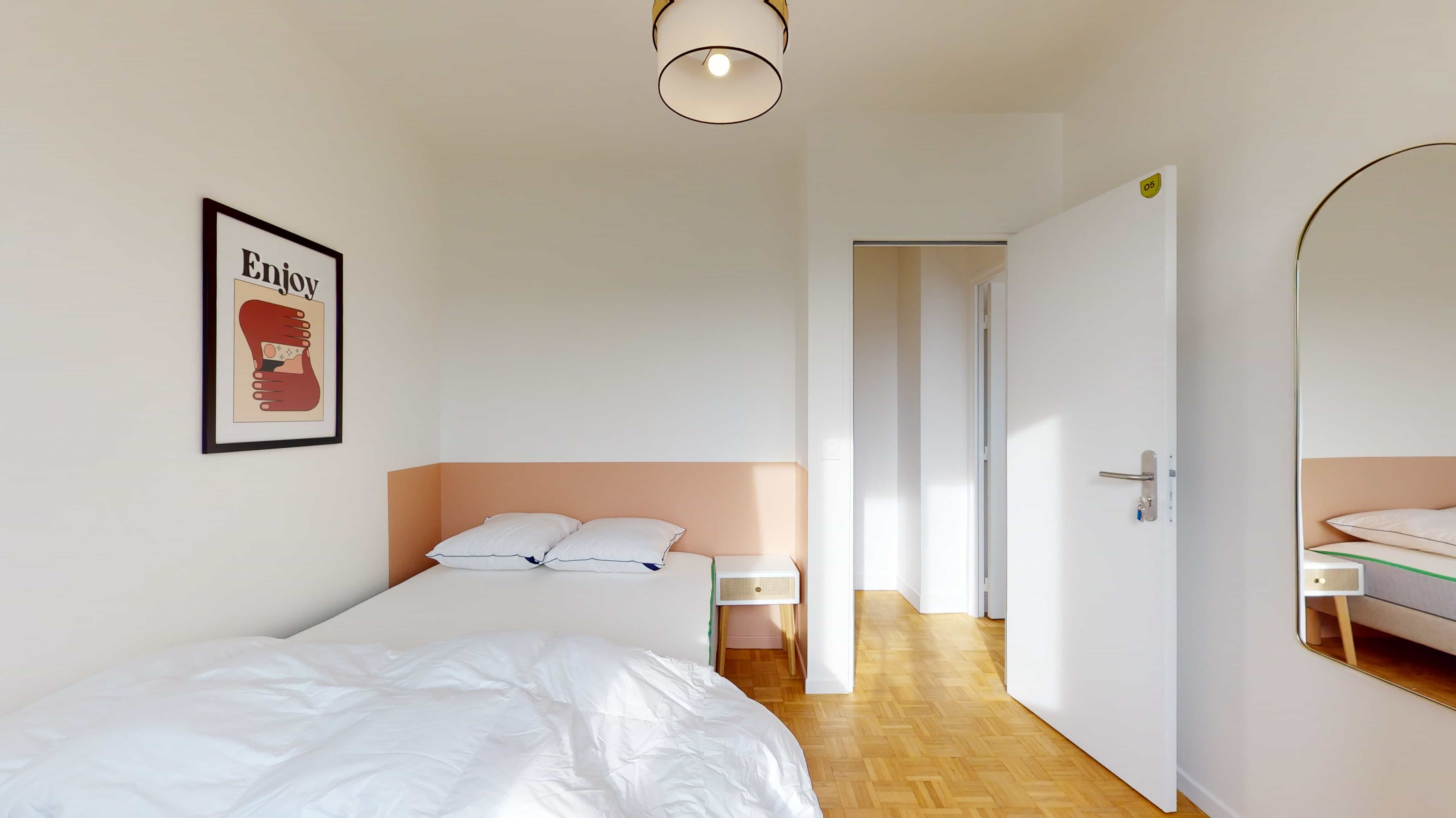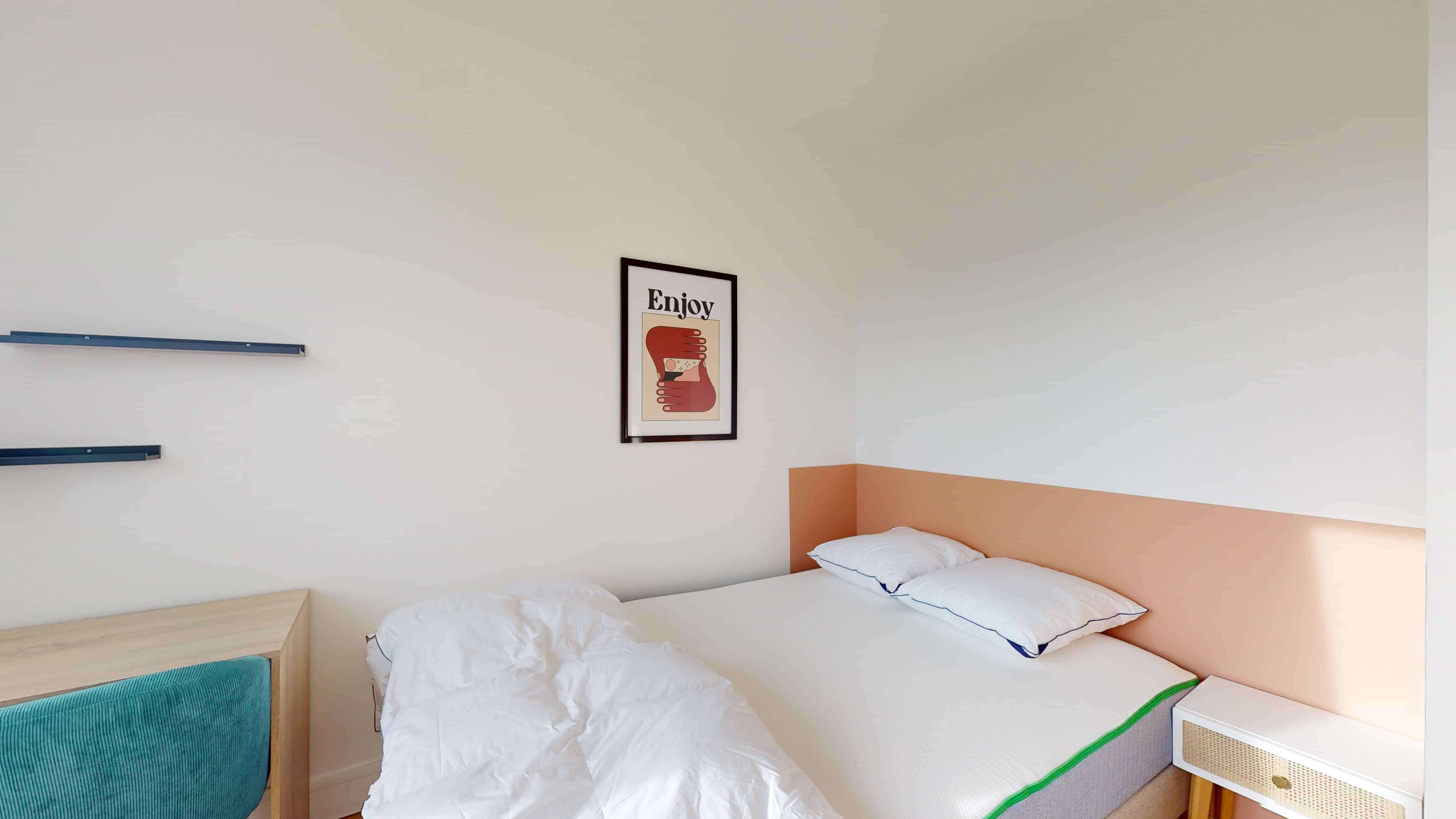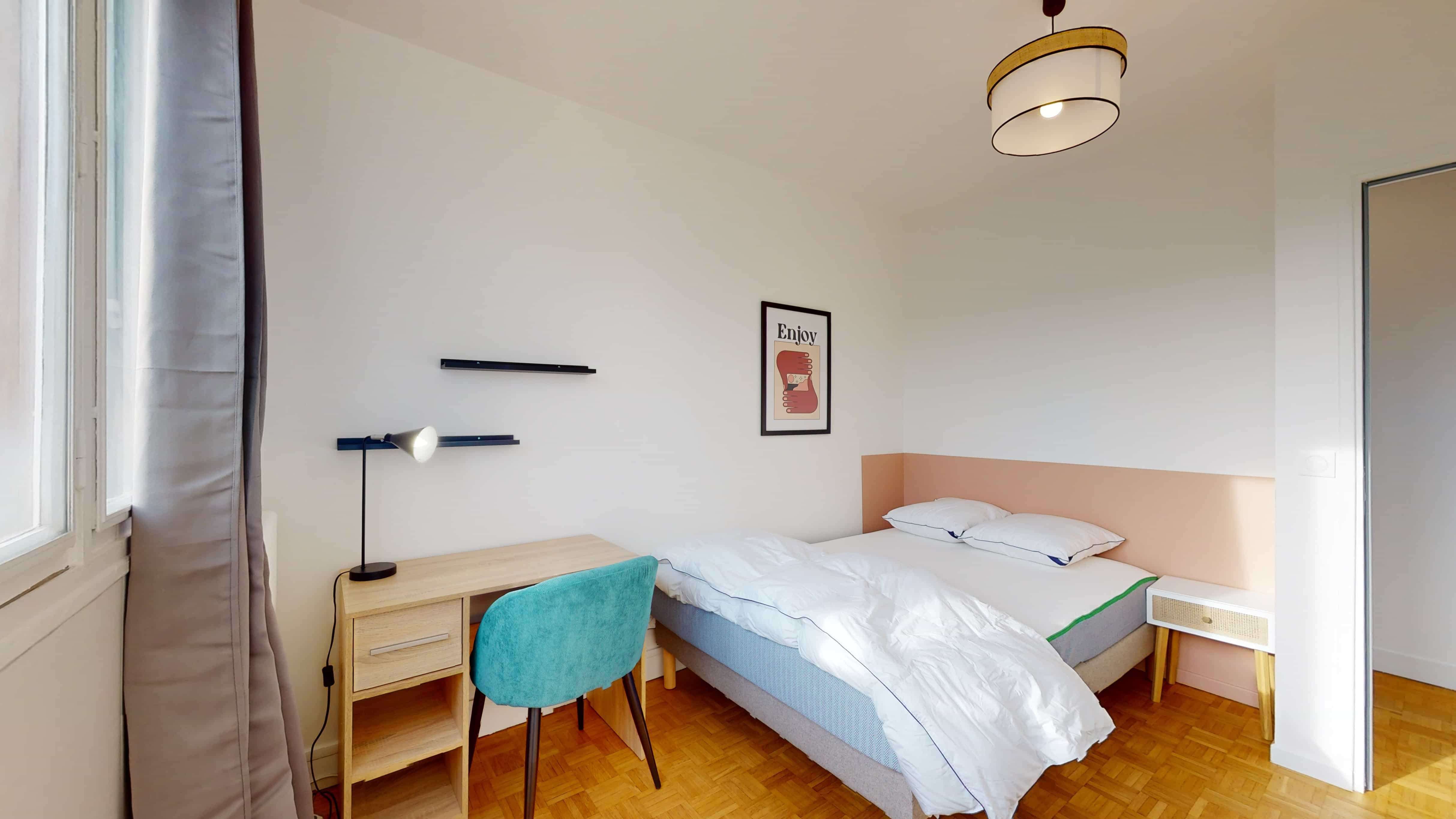 La chambre 5 est un espace personnel conçu pour une personne, offrant un confortable lit double avec de la literie de qualité, une armoire pour ranger vos affaires, ainsi qu'un bureau et une chaise pour vos moments d'étude ou de travail. Cette chambre partage une salle de bain moderne avec d'autres locataires.