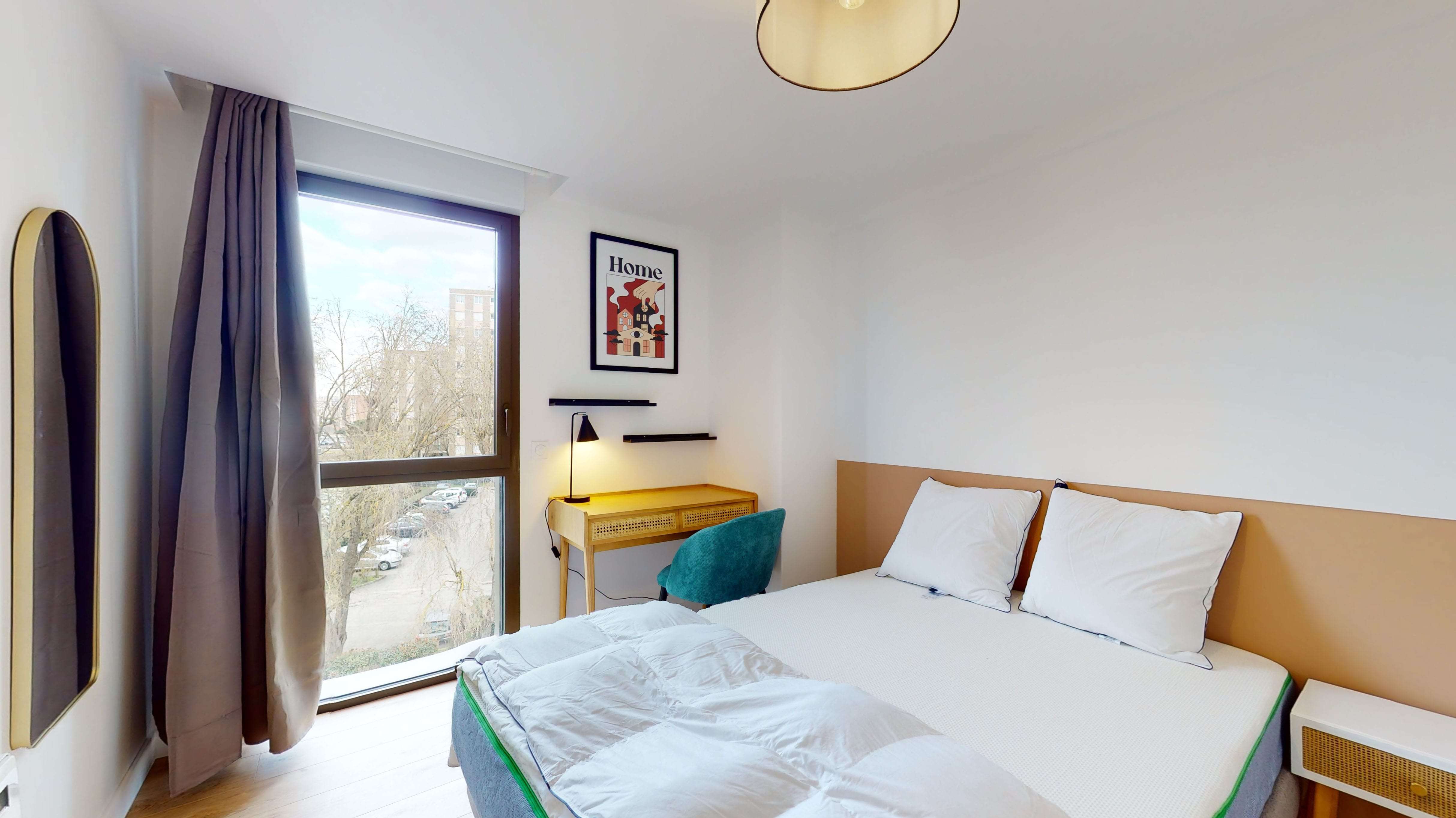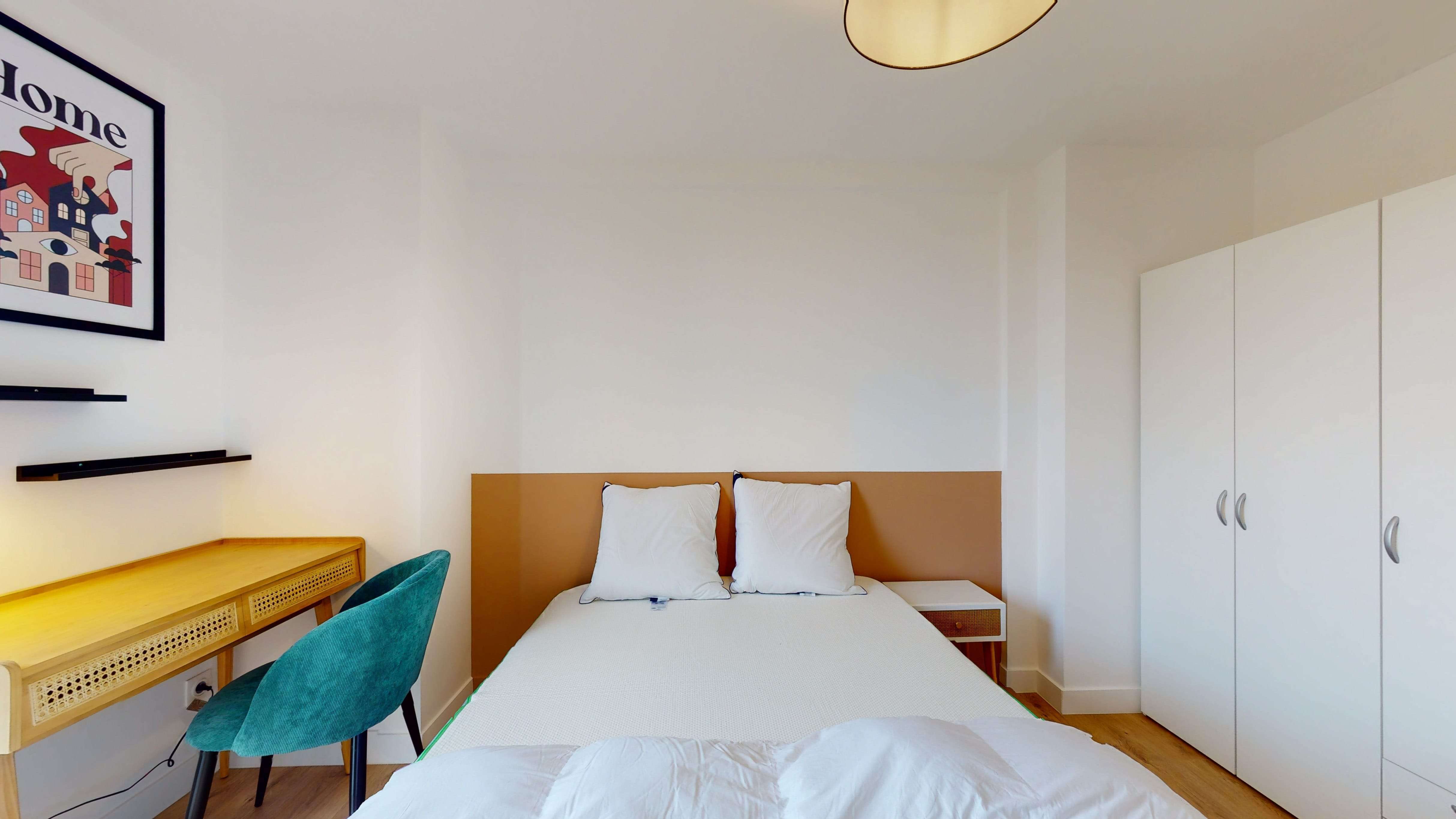 Room 2 est faite rien que pour vous! Elle a tout ce qu'il faut pour être bien : un grand lit douillet, une armoire pour vos vêtements, une chaise et un bureau pour travailler ou étudier. Vous partagerez une salle de bain avec douche et toilettes avec d'autres locataires.