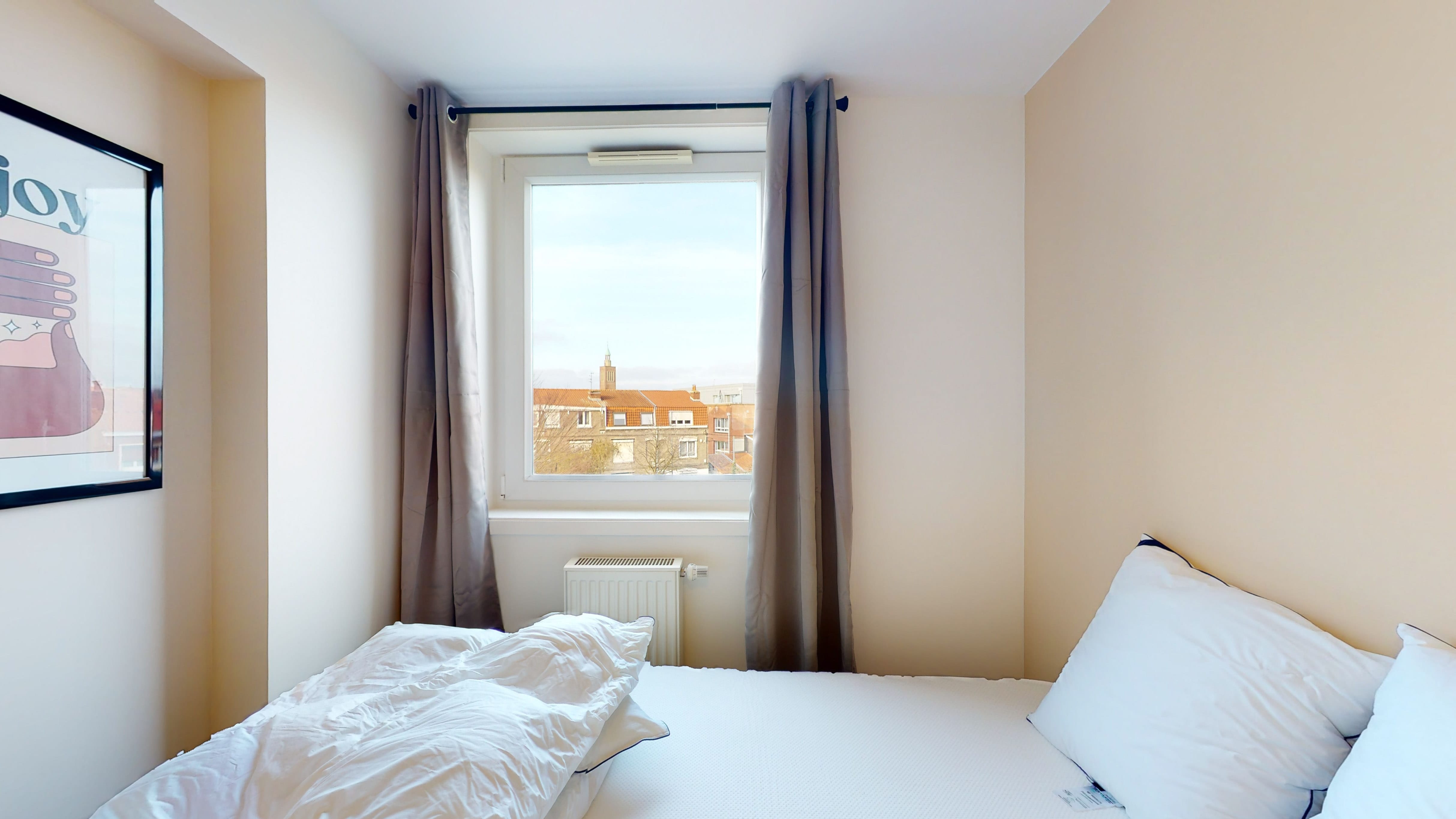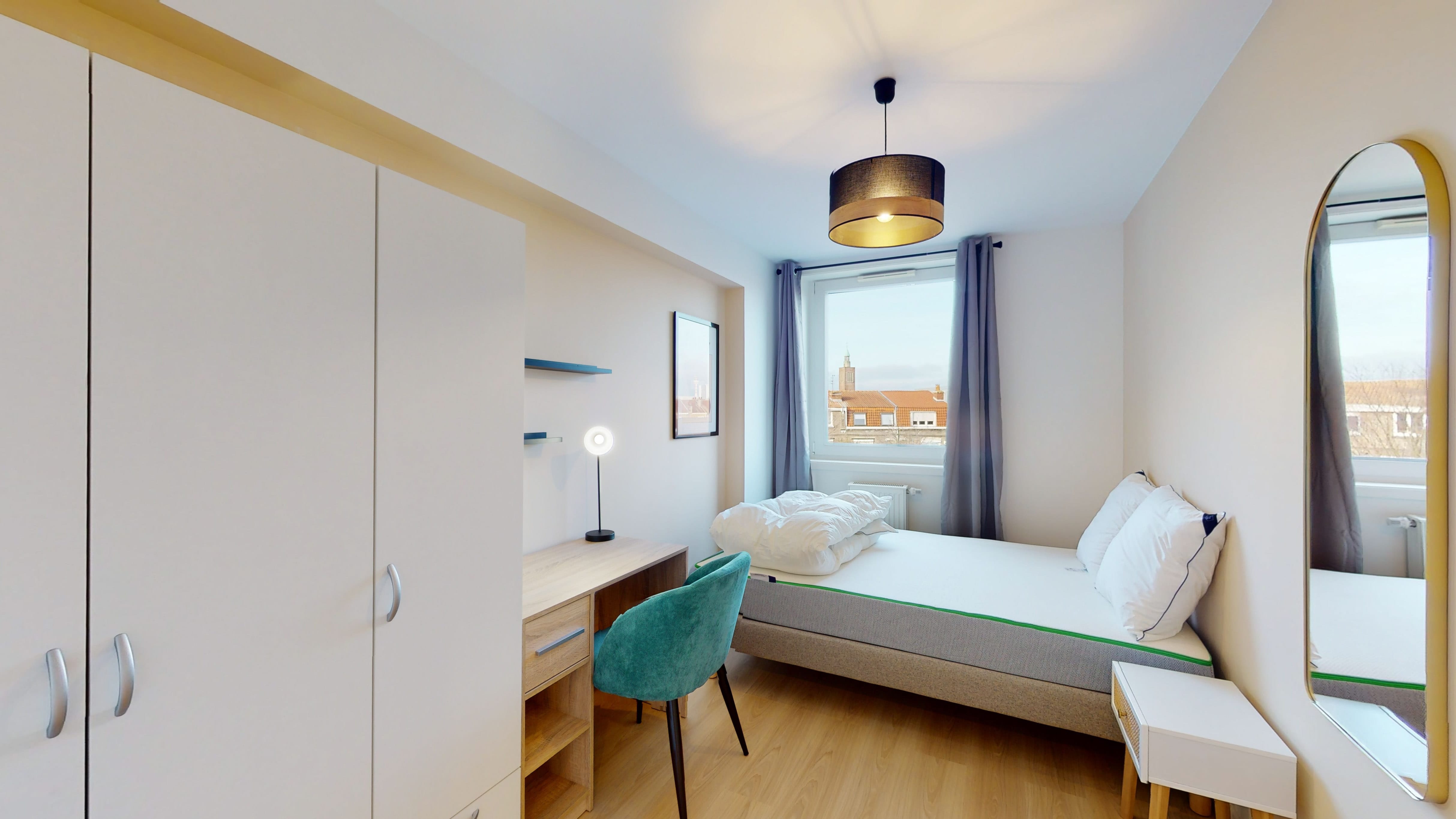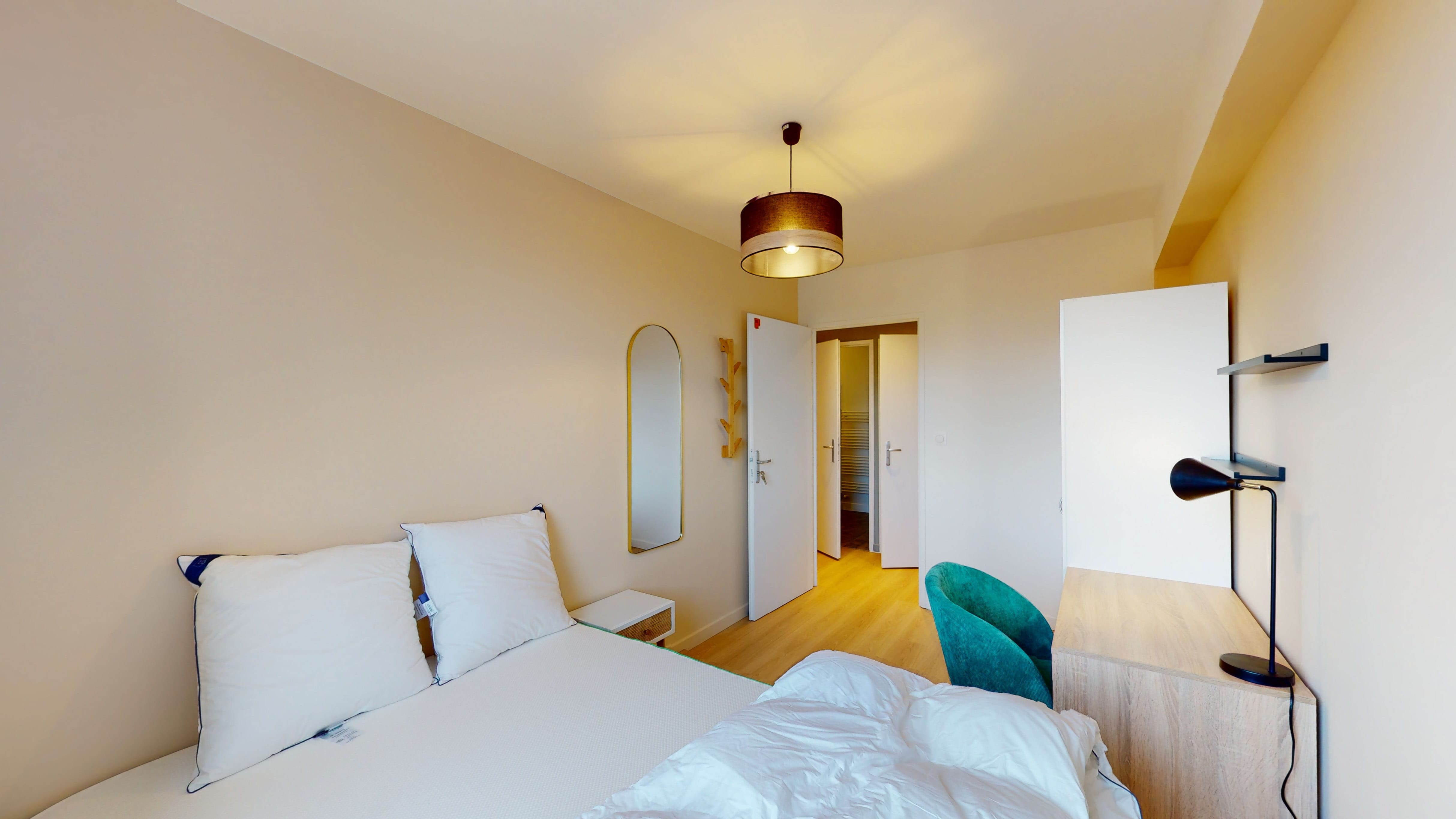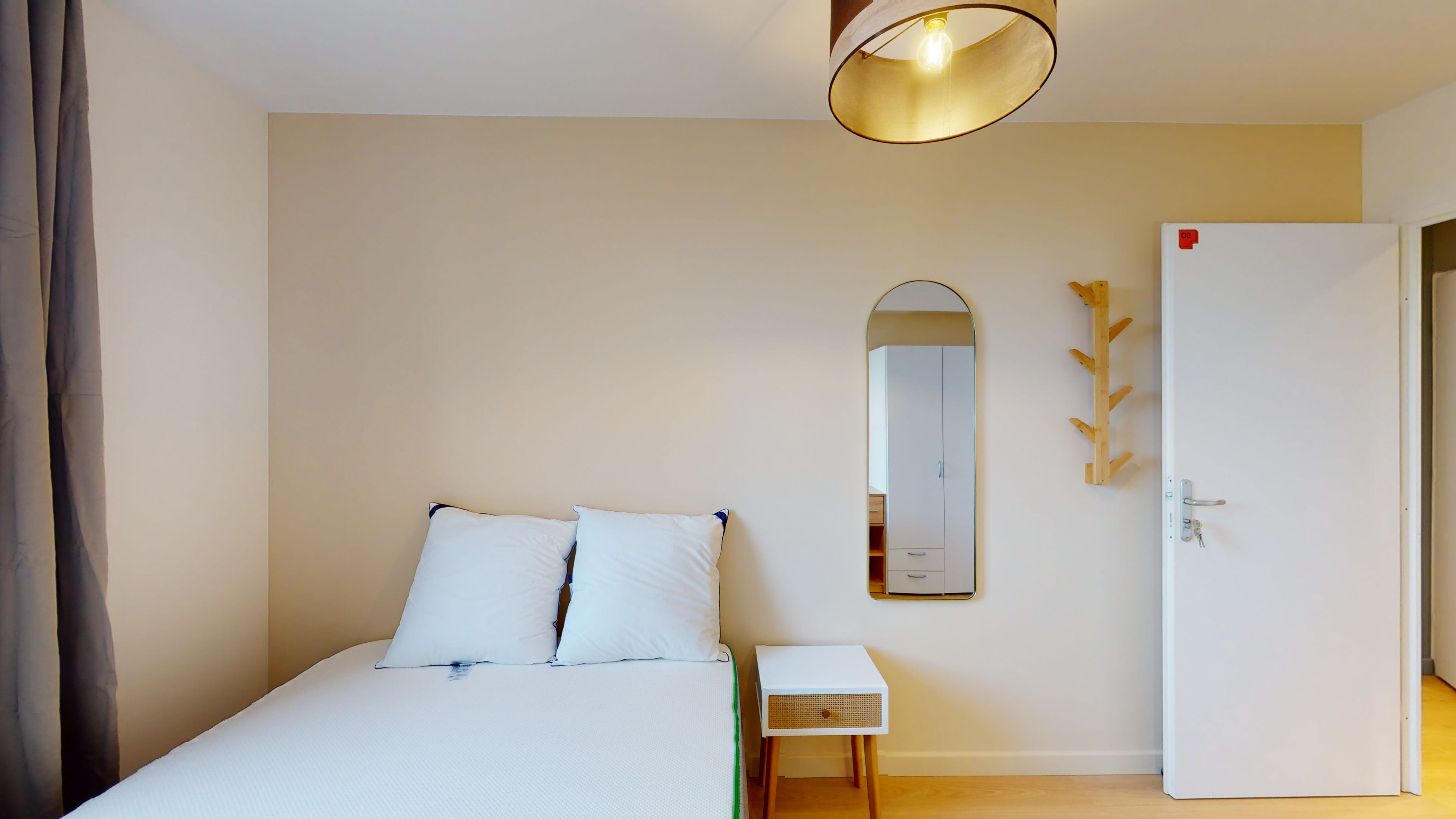 La "Room 3" est une chambre individuelle pensée pour le confort d'une personne. Elle comprend un lit double avec de la literie de qualité, une grande armoire pour vos affaires, un bureau pour travailler et une chaise confortable. Cette pièce cosy partage une salle de bain bien équipée avec douche et toilettes.