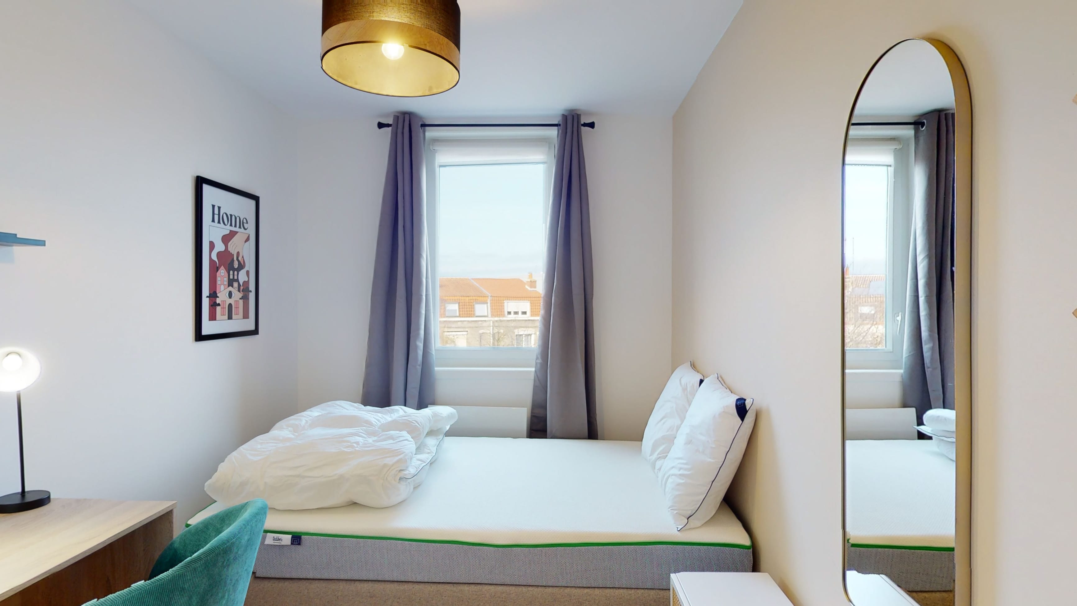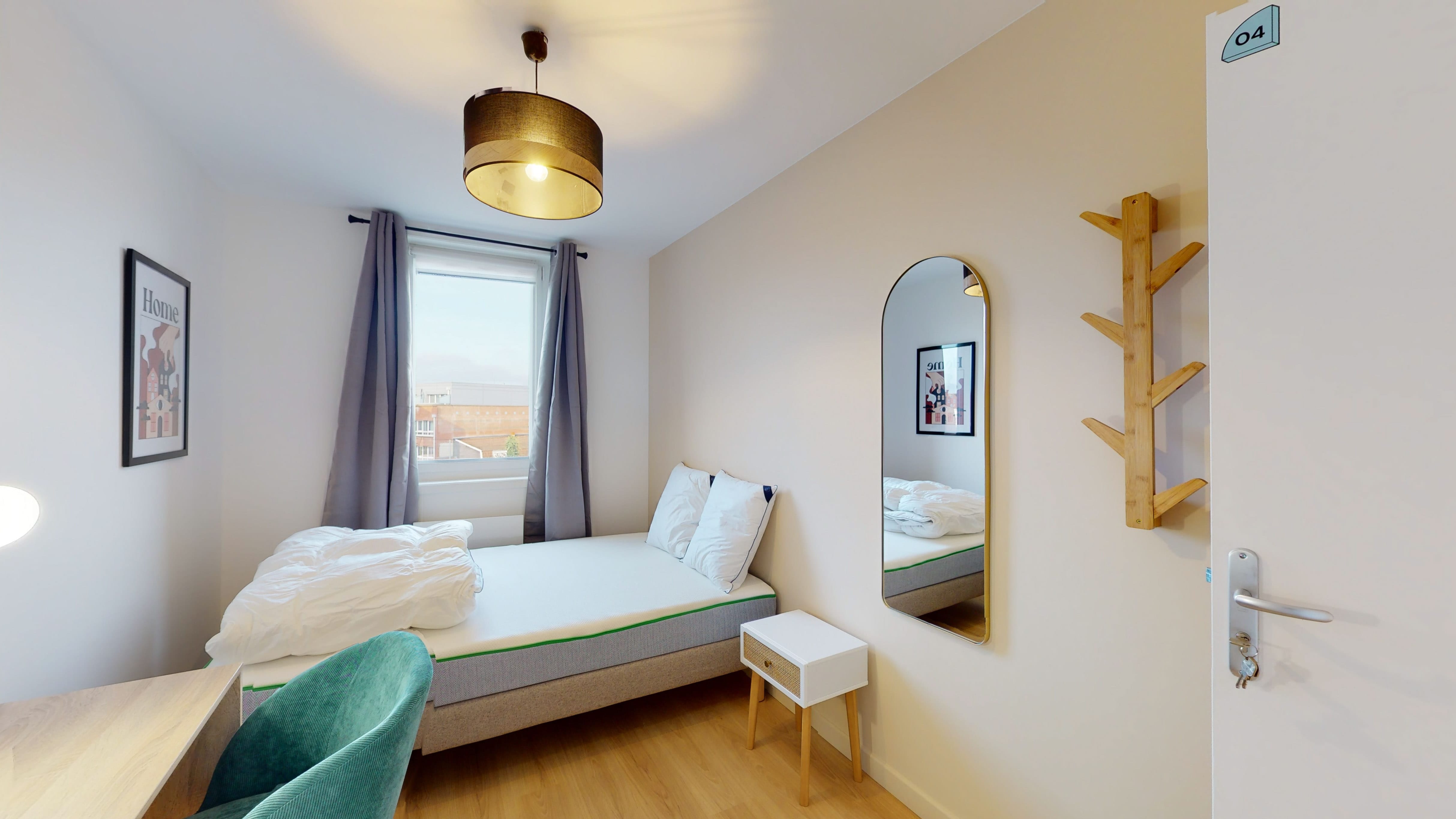 La chambre Room 4 est idéale pour une personne avec son lit double confortable, une armoire où ranger vos affaires, une chaise et un bureau pour étudier ou travailler. Elle mesure 10 m² et partage une salle de bain propre et fonctionnelle avec d'autres locataires.
