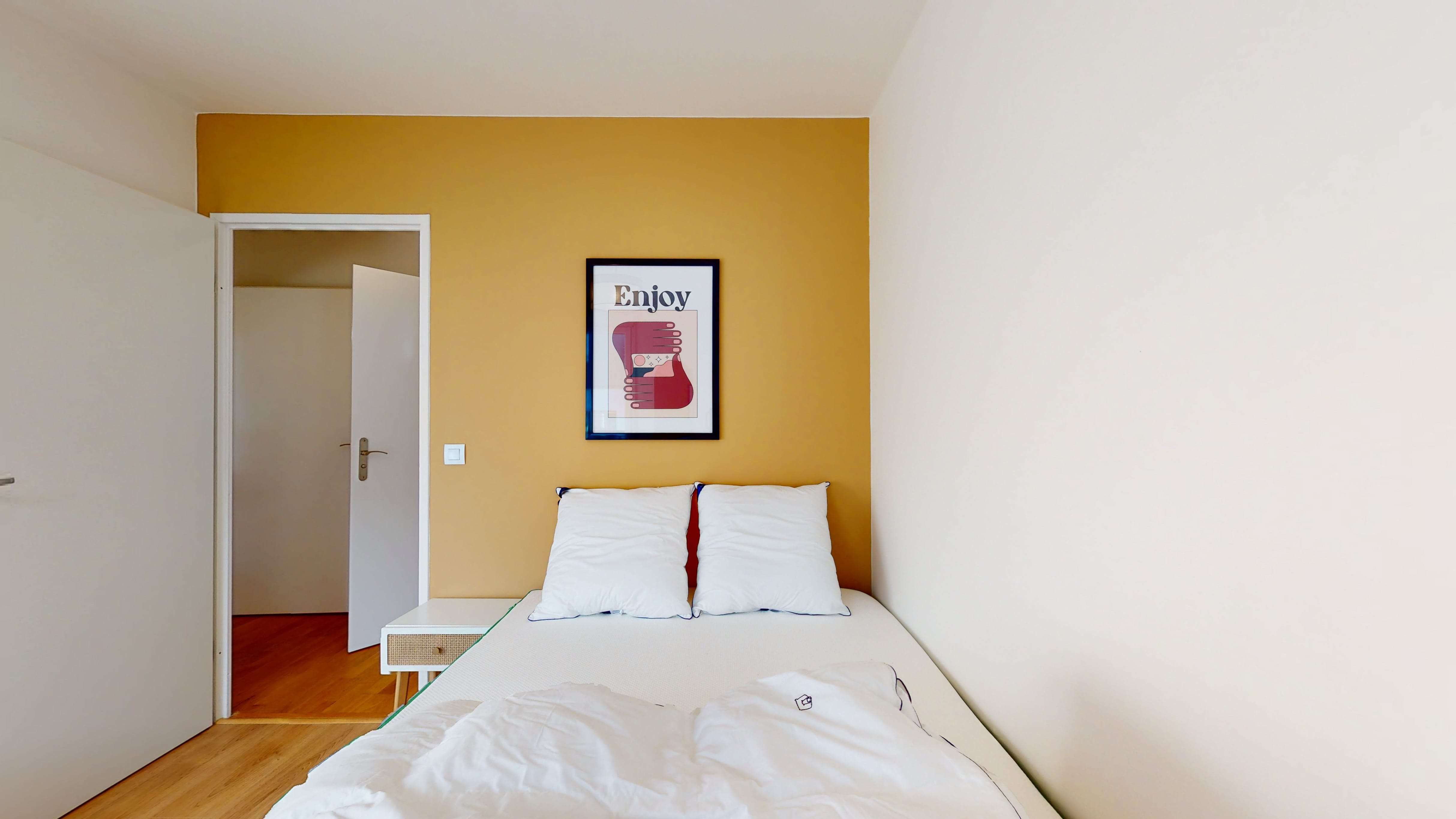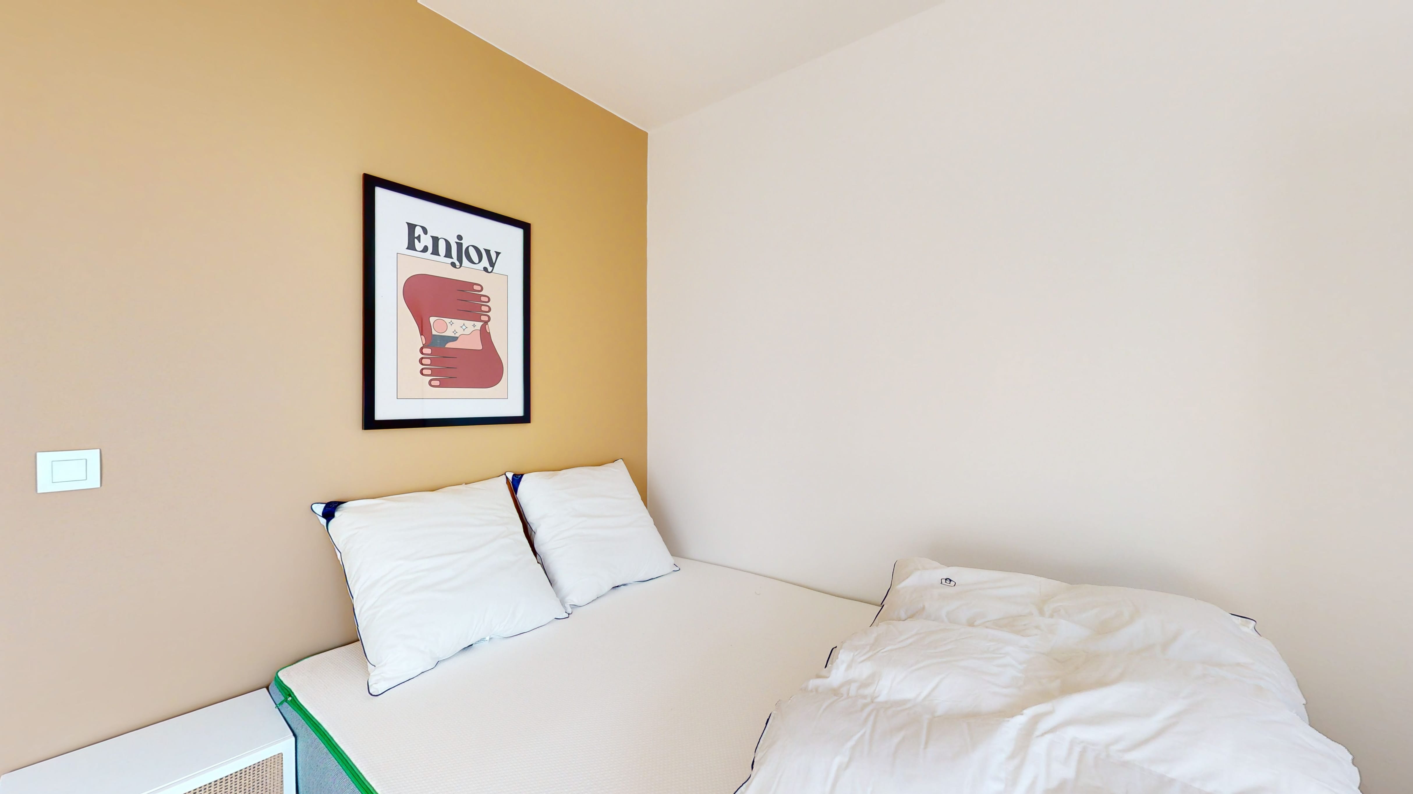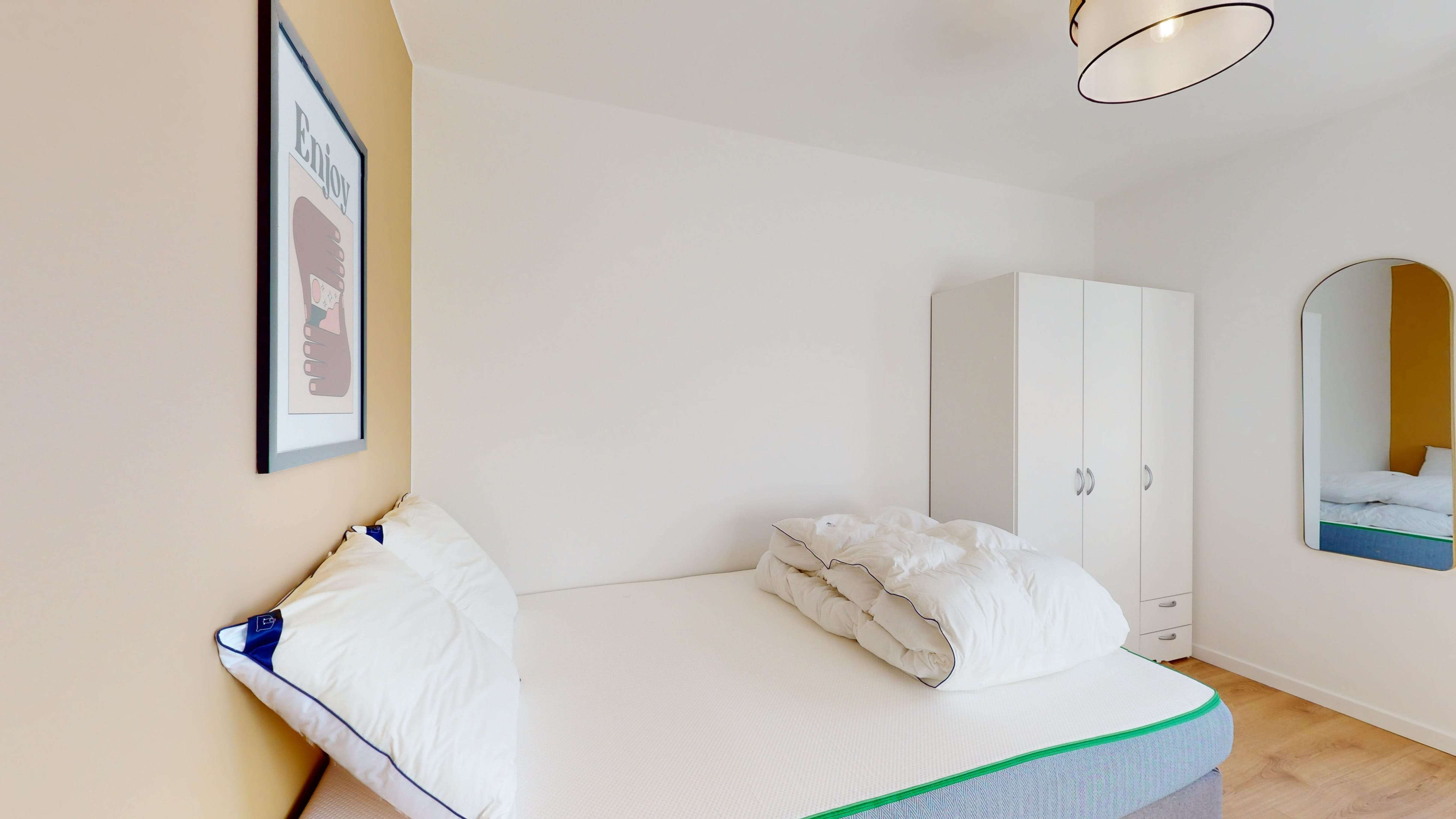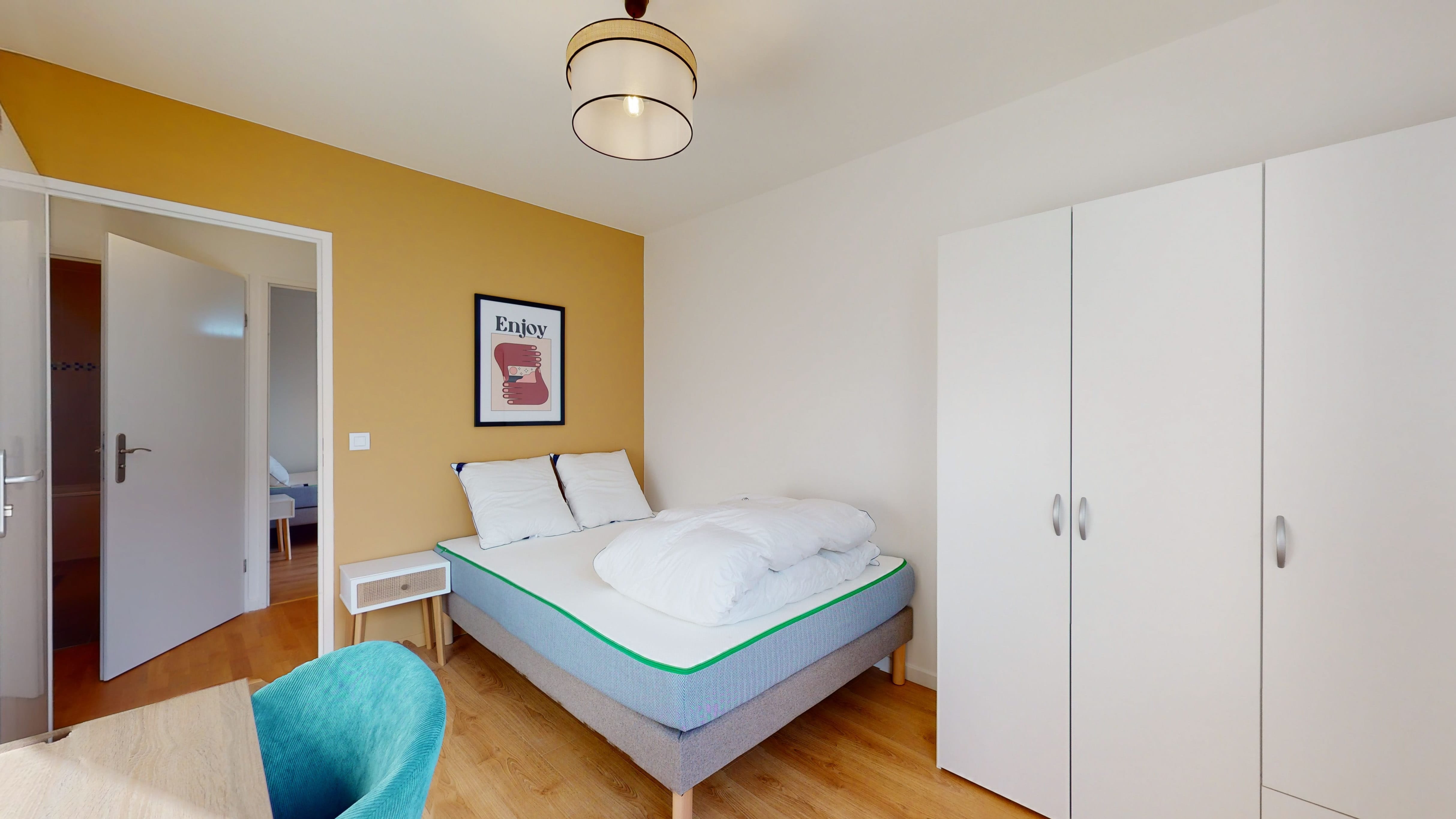 La chambre disponible, nommée "Room 3", est idéale pour une personne. Avec ses 10m², elle offre un lit double confortable, une armoire pour vos vêtements, ainsi qu'un bureau et une chaise pour travailler ou étudier en toute tranquillité. La salle de bains partagée est équipée d'une douche moderne pour votre confort.