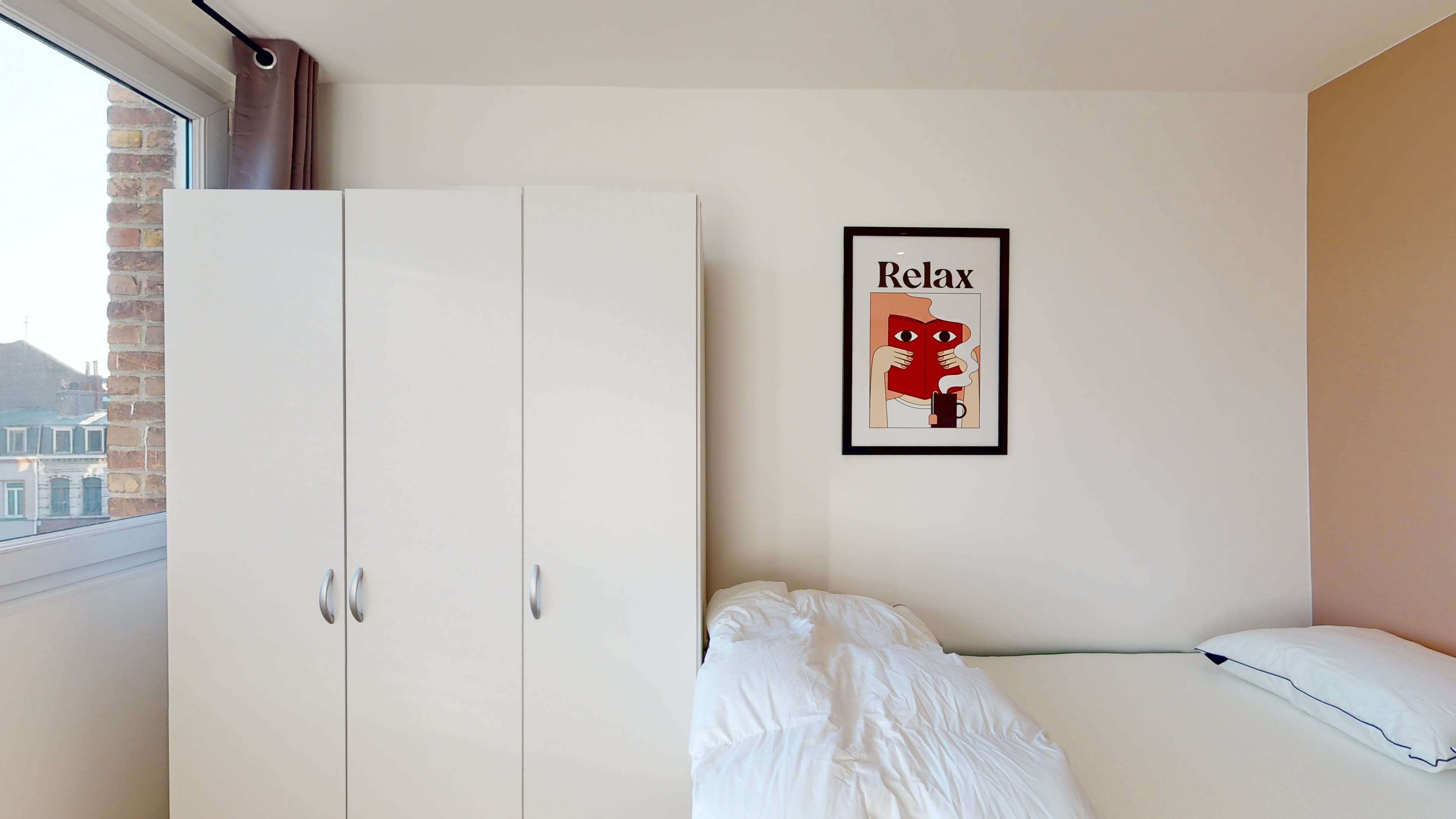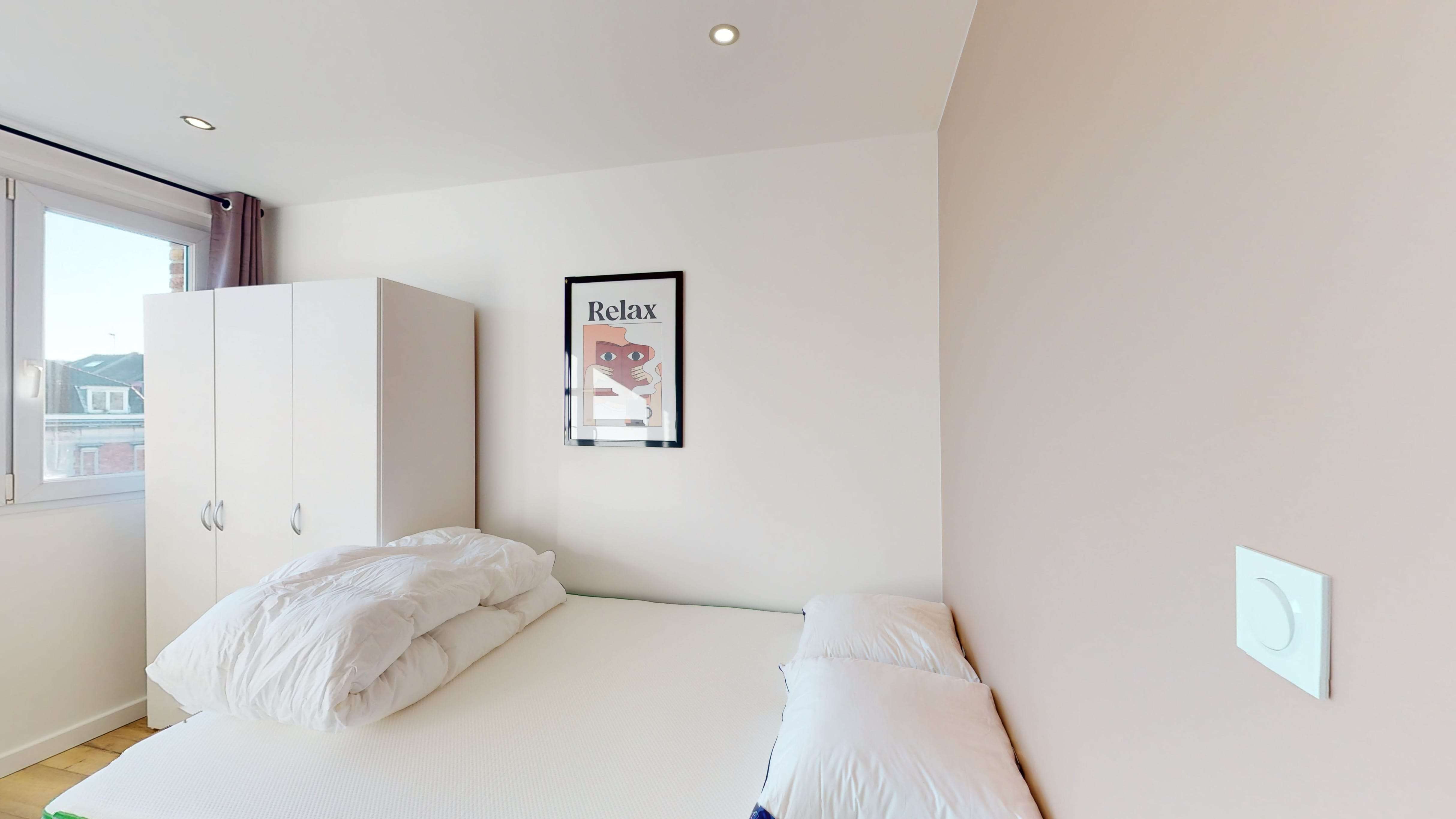 La chambre Room 3, conçue pour une personne, est un espace personnel confortable de 9 m². Elle comprend tout ce dont vous avez besoin pour votre confort : un lit double douillet, une armoire spacieuse pour vos affaires, un bureau pour travailler et une chaise. La salle de bain est à partager avec d'autres locataires, mais elle offre une douche moderne et des toilettes.