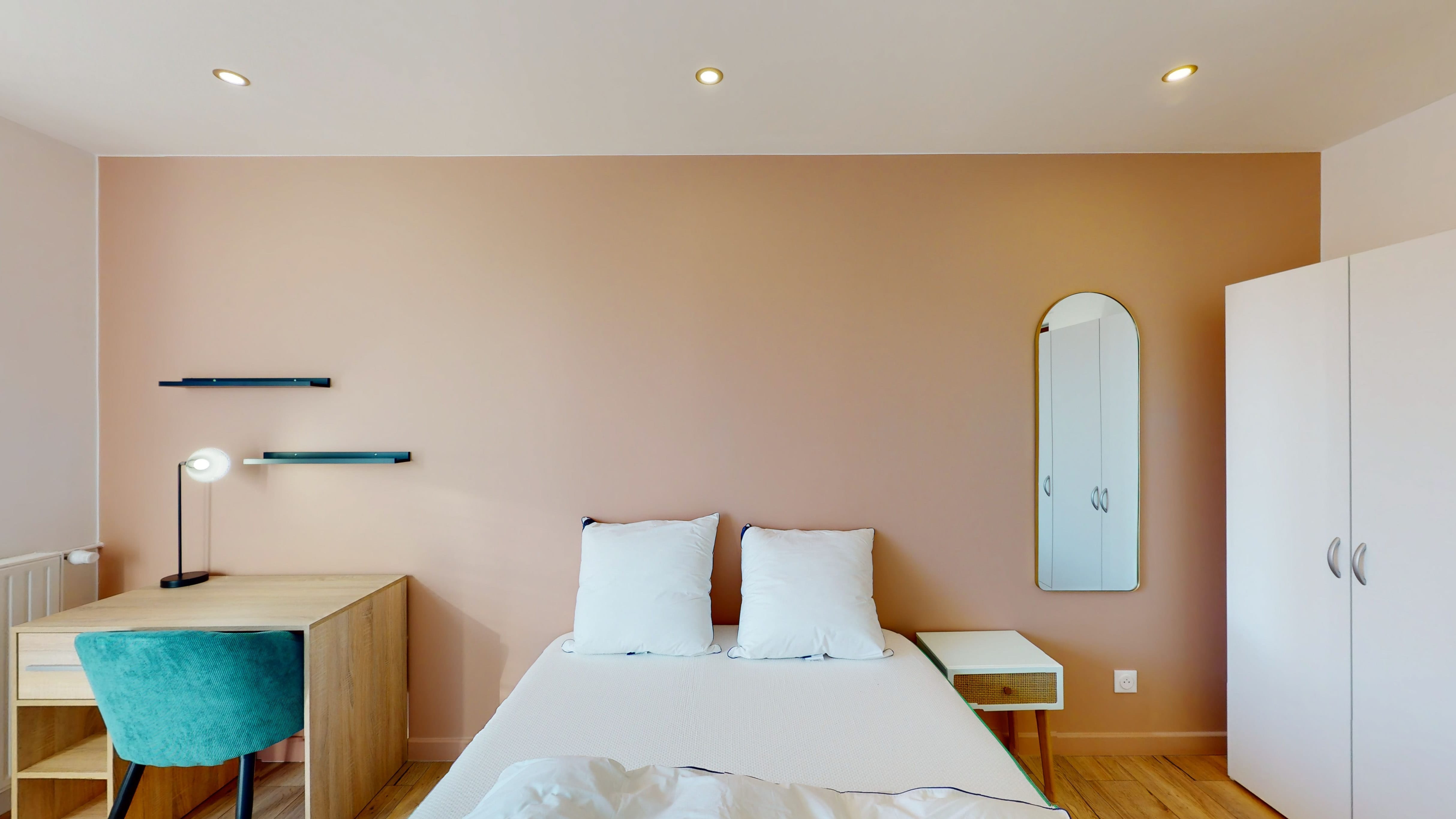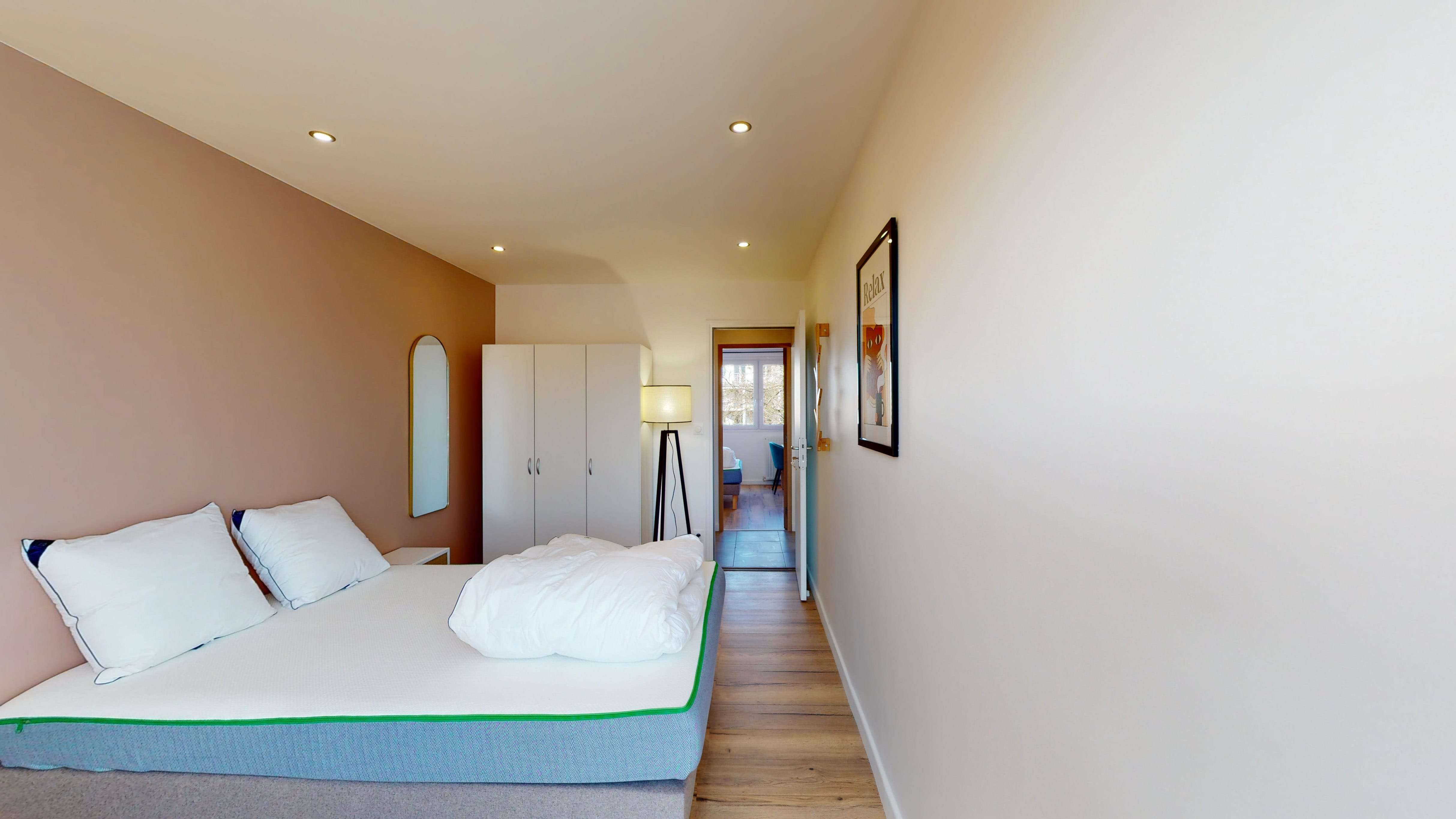 Room 4 est spécialement aménagée pour vous avec tout le nécessaire : un lit double confortable pour bien se reposer, une armoire pour ranger vos affaires, une chaise et un bureau pour travailler ou étudier. La superficie de 13m² vous offre un espace personnel agréable et la salle de bain est à partager avec d'autres locataires, garantissant propreté et commodité.