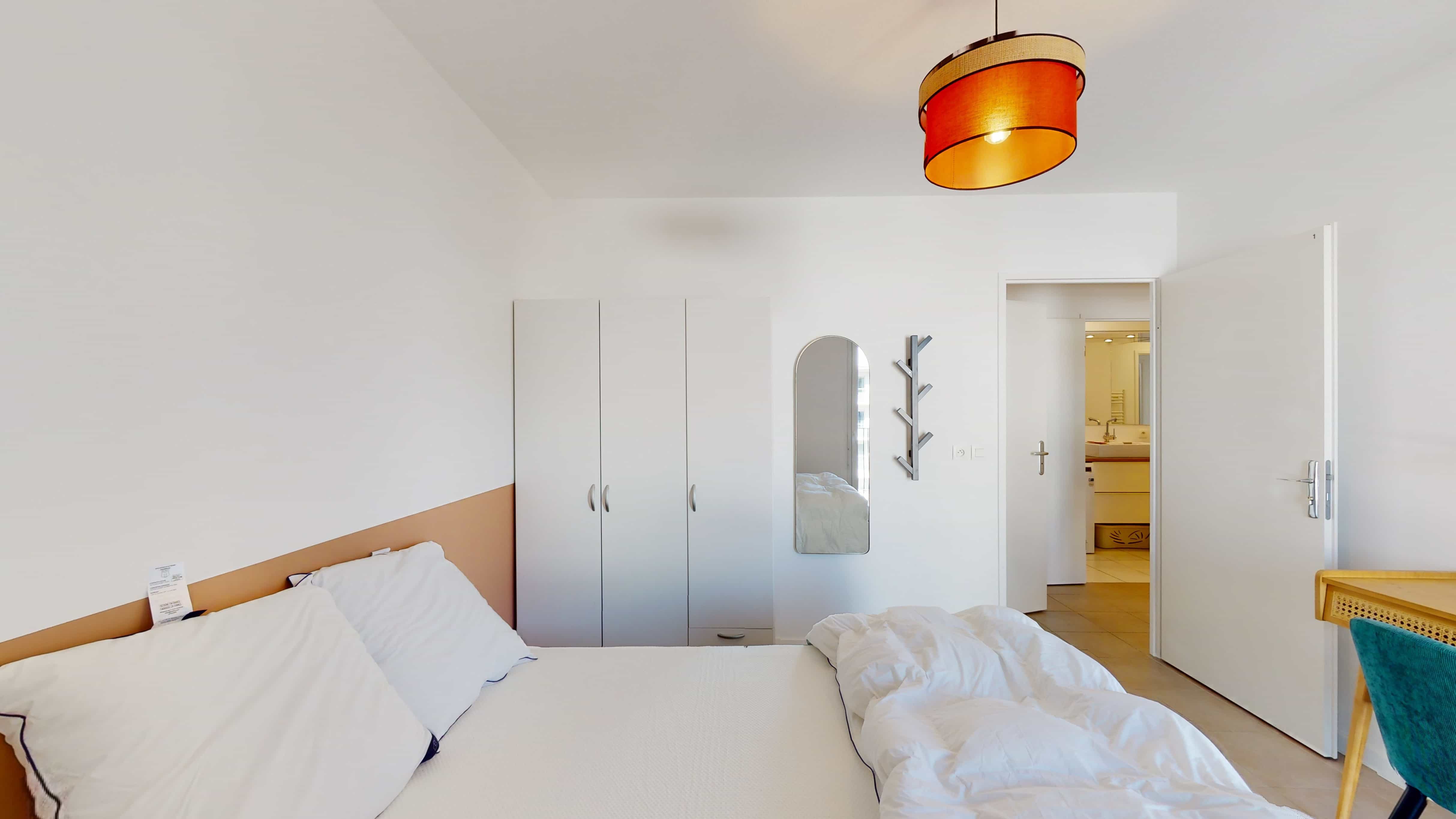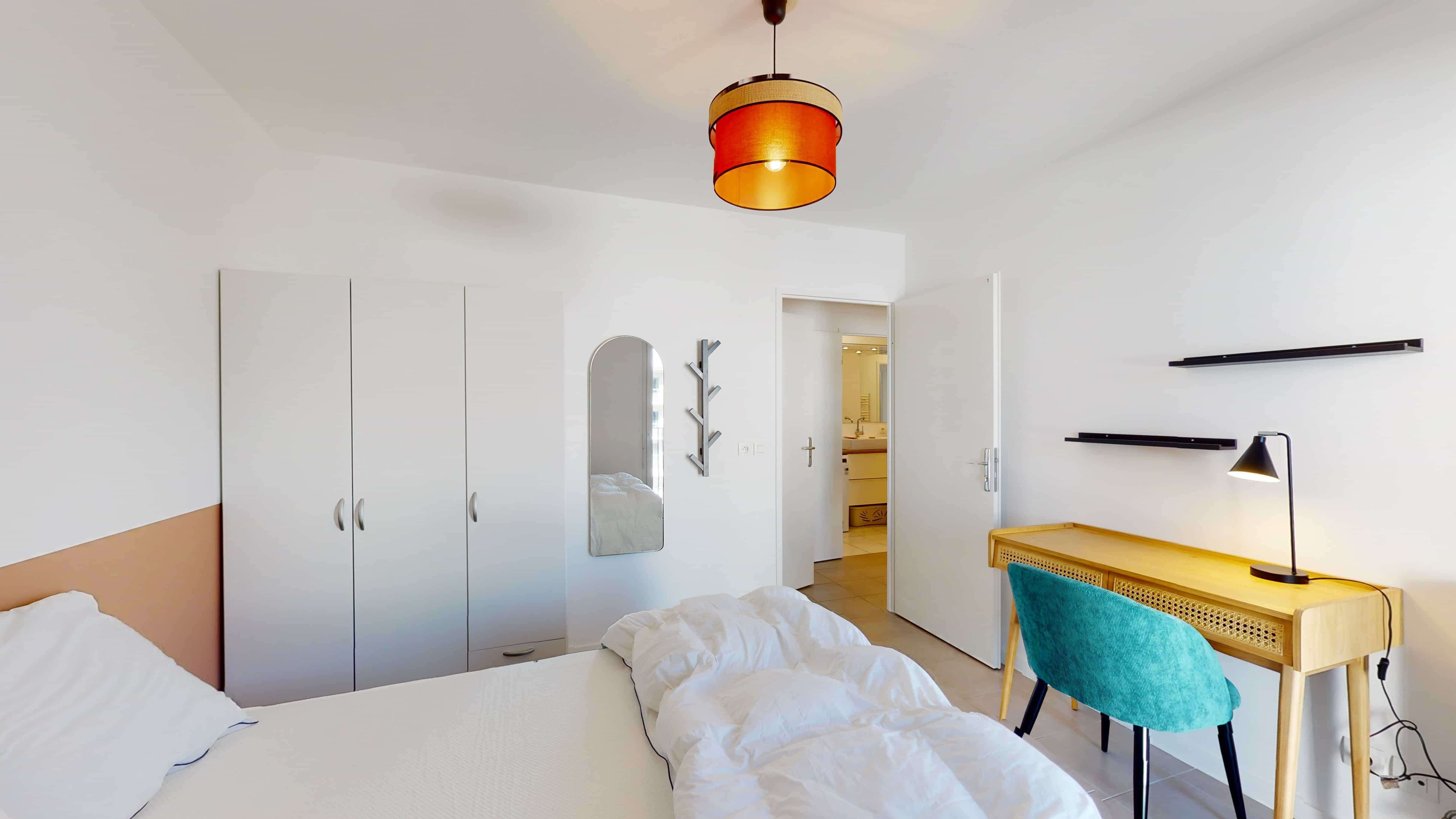 La chambre 1 est parfaite pour une personne. Elle a tout ce qu'il faut : un lit double douillet avec de belles draps, une armoire pour ranger toutes vos affaires, une chaise, un bureau pratique pour travailler ou étudier, et vous partagerez une salle de bain propre et moderne avec d'autres locataires.