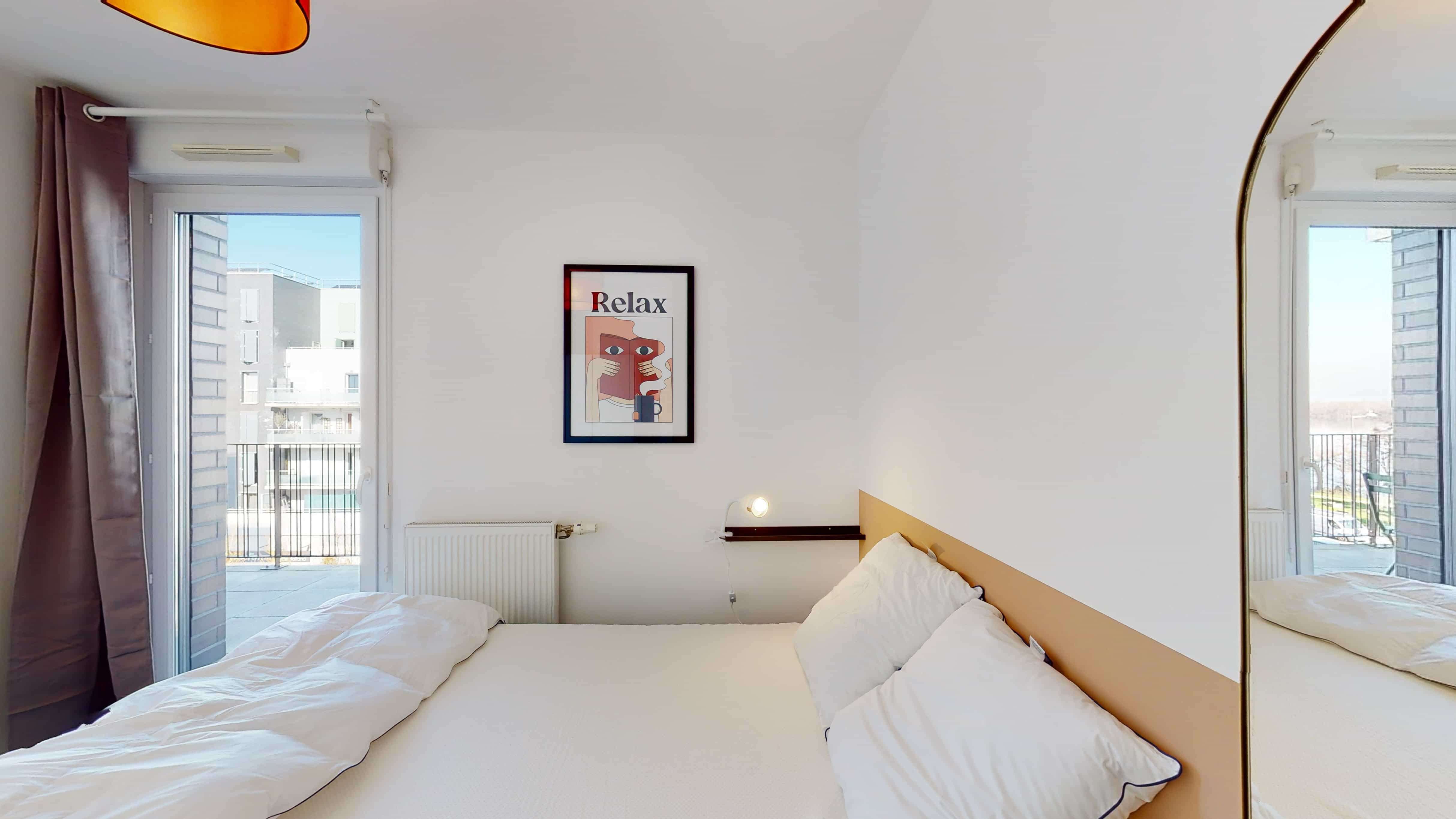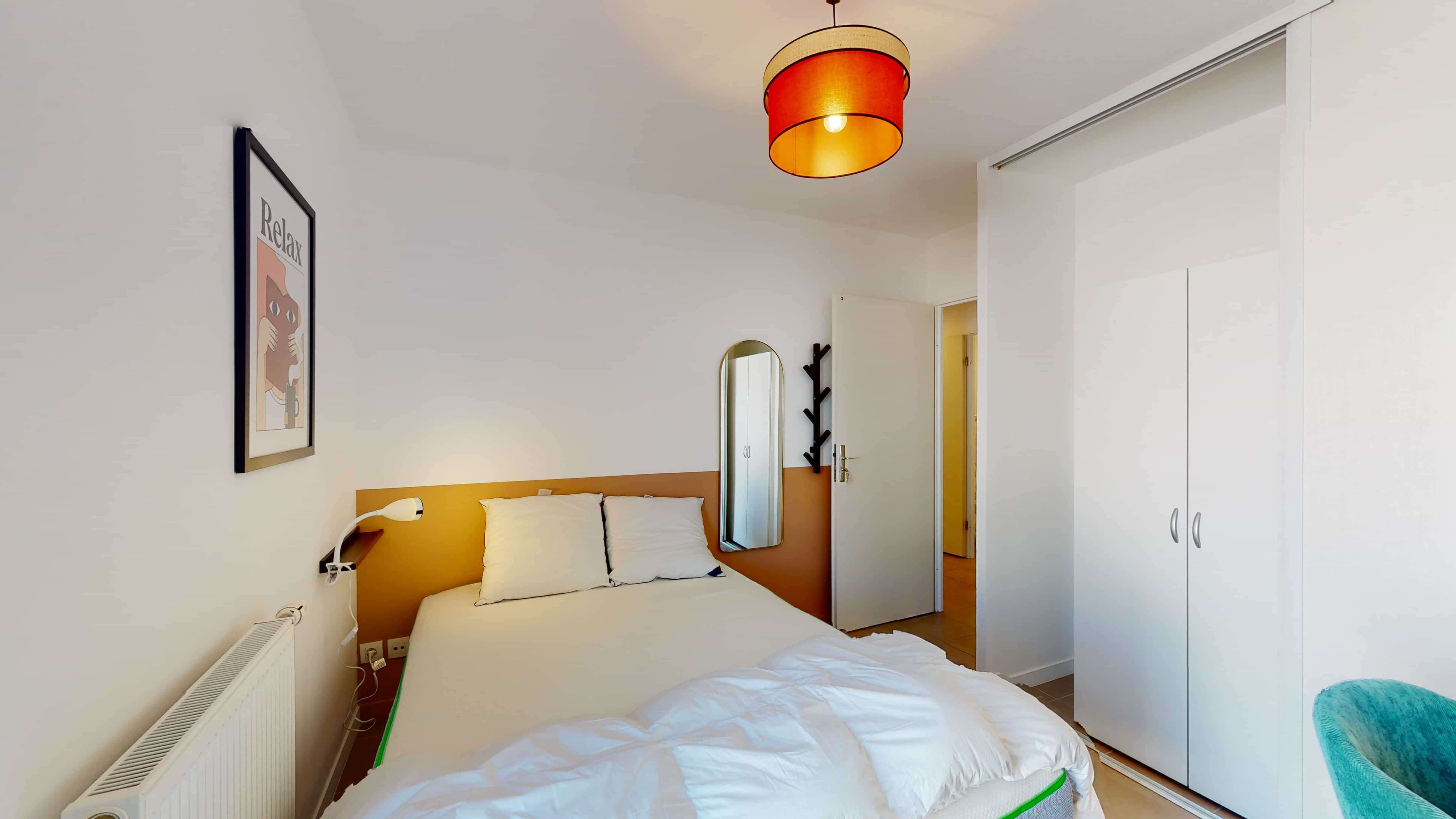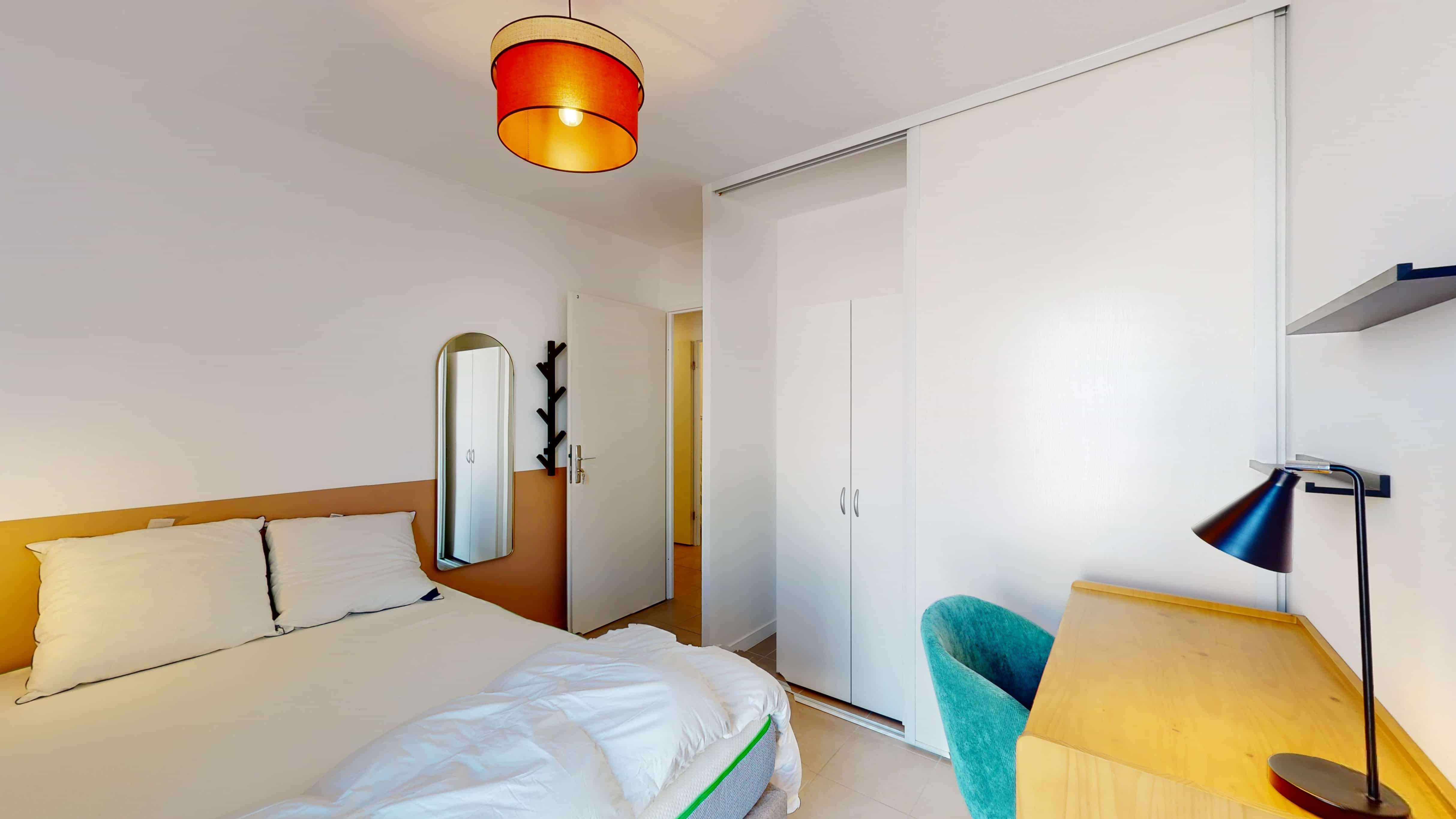 La chambre numéro 3, d'une superficie de 10 m², est idéale pour une personne. Elle dispose d'un lit double confortable, d'une grande armoire pour ranger toutes vos affaires, d'un bureau et d'une chaise pour travailler ou étudier tranquillement. Vous aurez aussi accès à votre propre balcon privé. La salle de bain partagée comprend une douche moderne pour vous rafraîchir à tout moment.