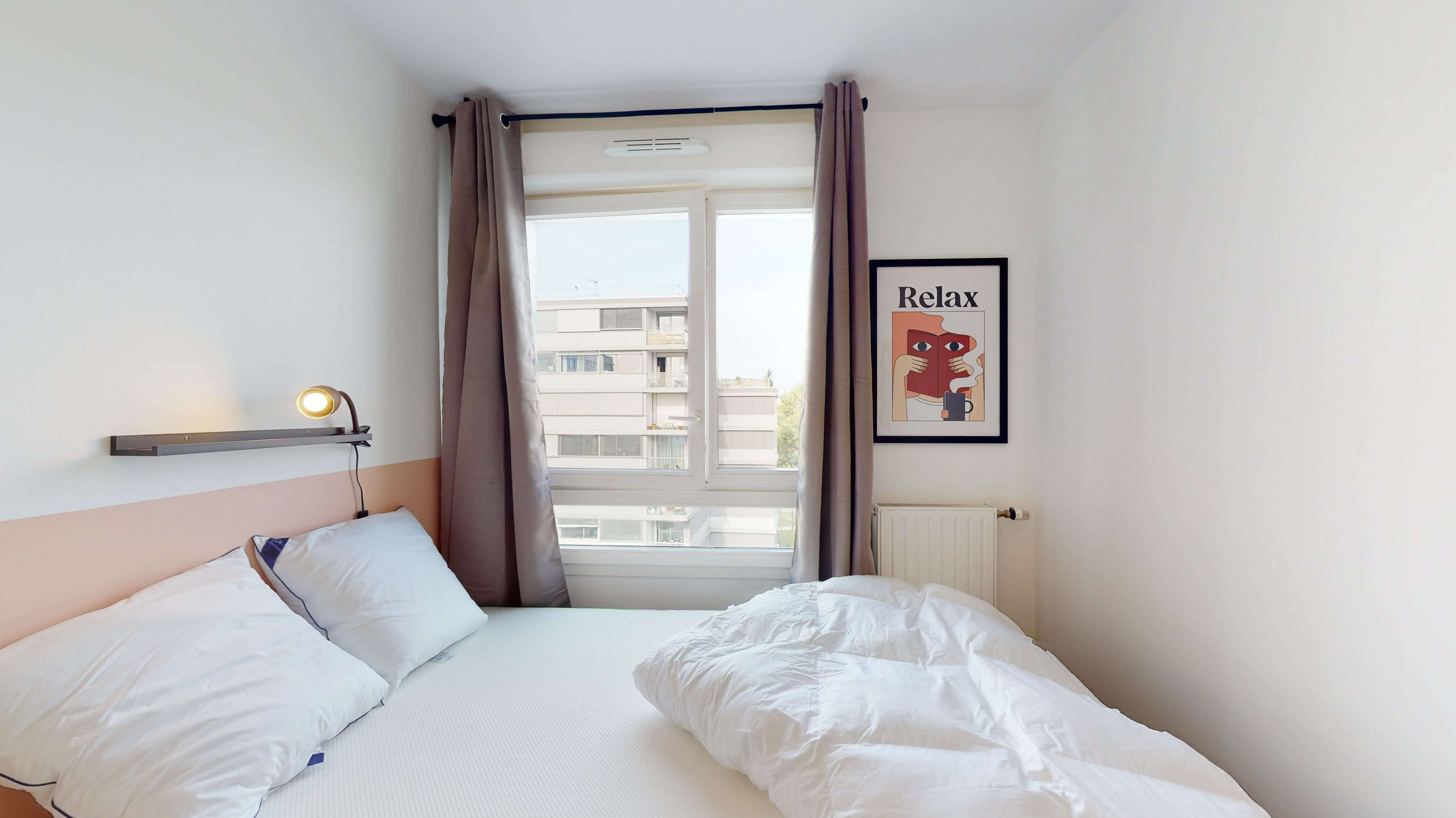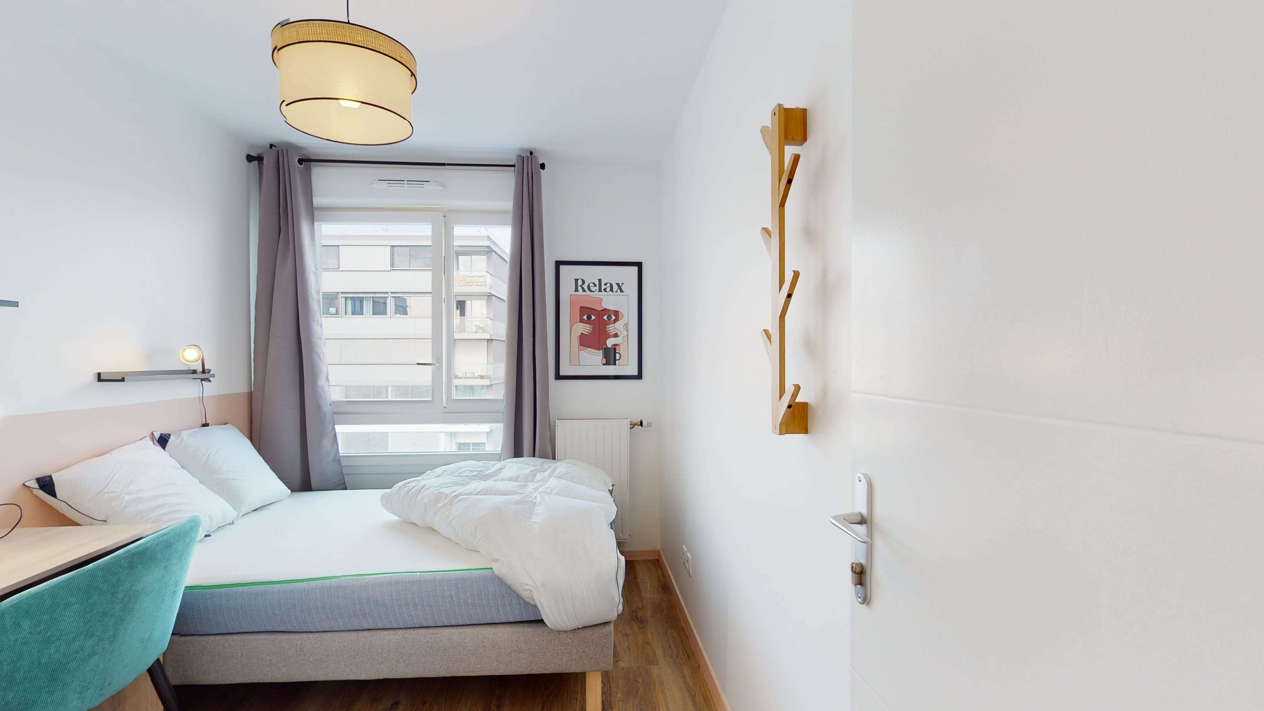 La chambre Room 2 est un petit cocon de 9 m² juste pour vous ! Avec un lit double douillet, une armoire pour ranger vos affaires, une chaise et un bureau pour étudier ou travailler, elle a tout ce qu'il faut. Et pas de soucis pour la file d'attente le matin, vous partagerez une salle de bain équipée d'une douche et de toilettes avec d'autres locataires.