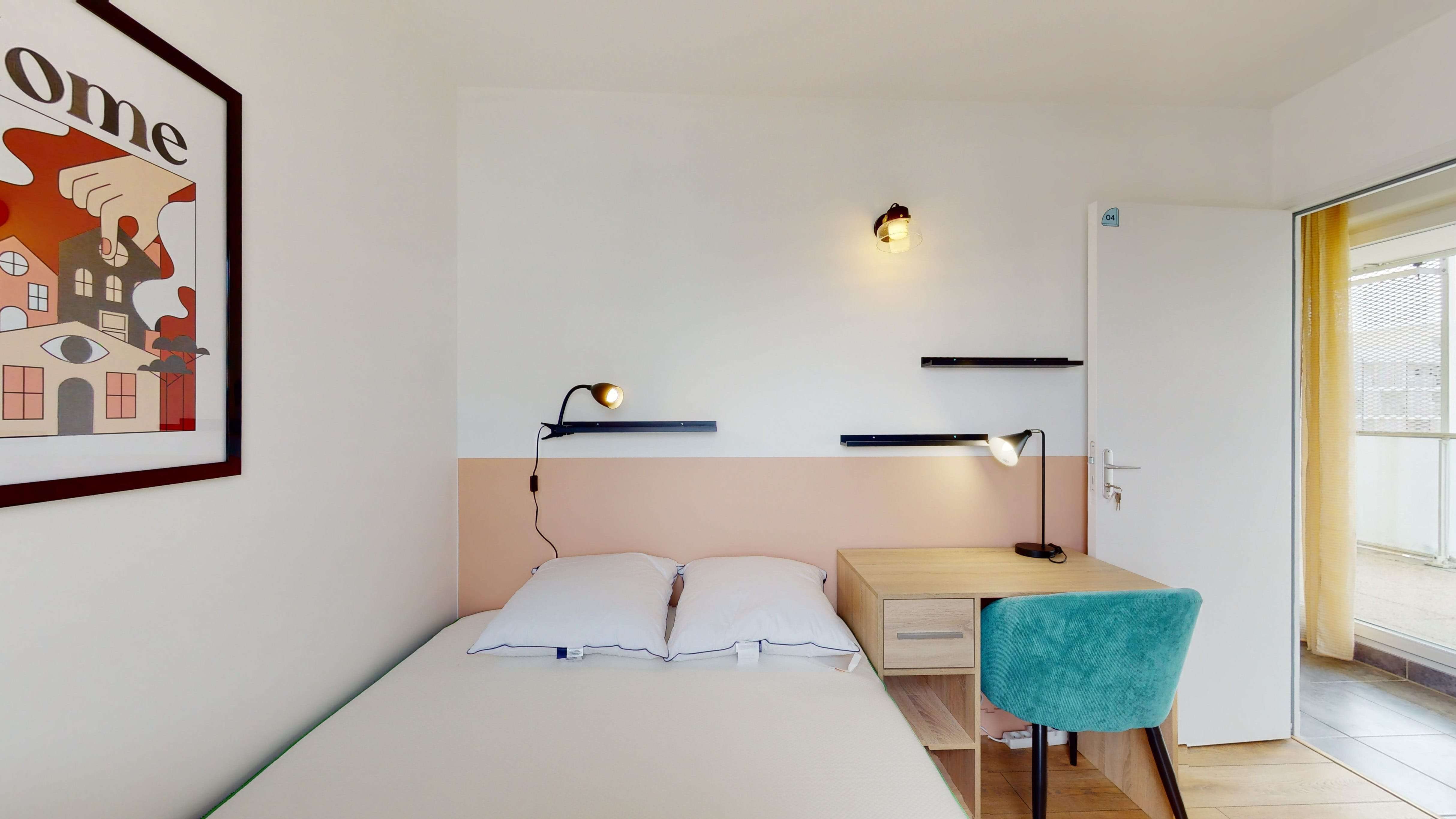 La chambre 4 est spécialement conçue pour une personne. Elle fait 9 m² et est meublée avec un confortable lit double, une armoire pour vos affaires, une chaise et un bureau pour travailler ou étudier. Elle bénéficie d'une salle de bain partagée avec douche et WC qui est à partager avec les autres locataires.