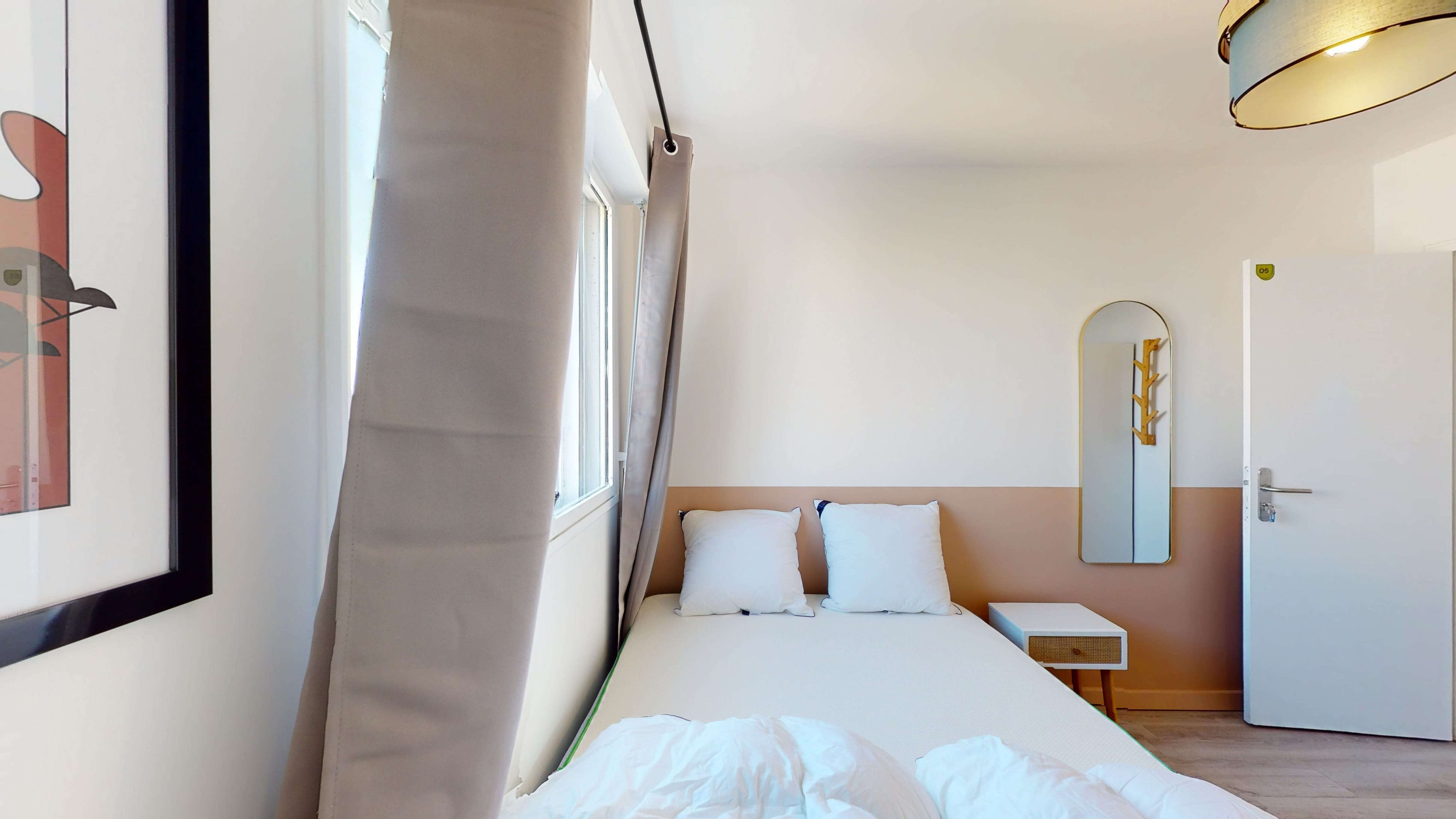 La chambre 5 est un petit cocon juste pour vous. Elle a tout ce qu'il faut : un lit douillet pour deux personnes, une armoire où ranger vos habits, ainsi qu'une chaise et un bureau pour travailler ou étudier dans le calme. La salle de bain partagée est équipée d'une douche moderne, d'un lavabo et des toilettes.