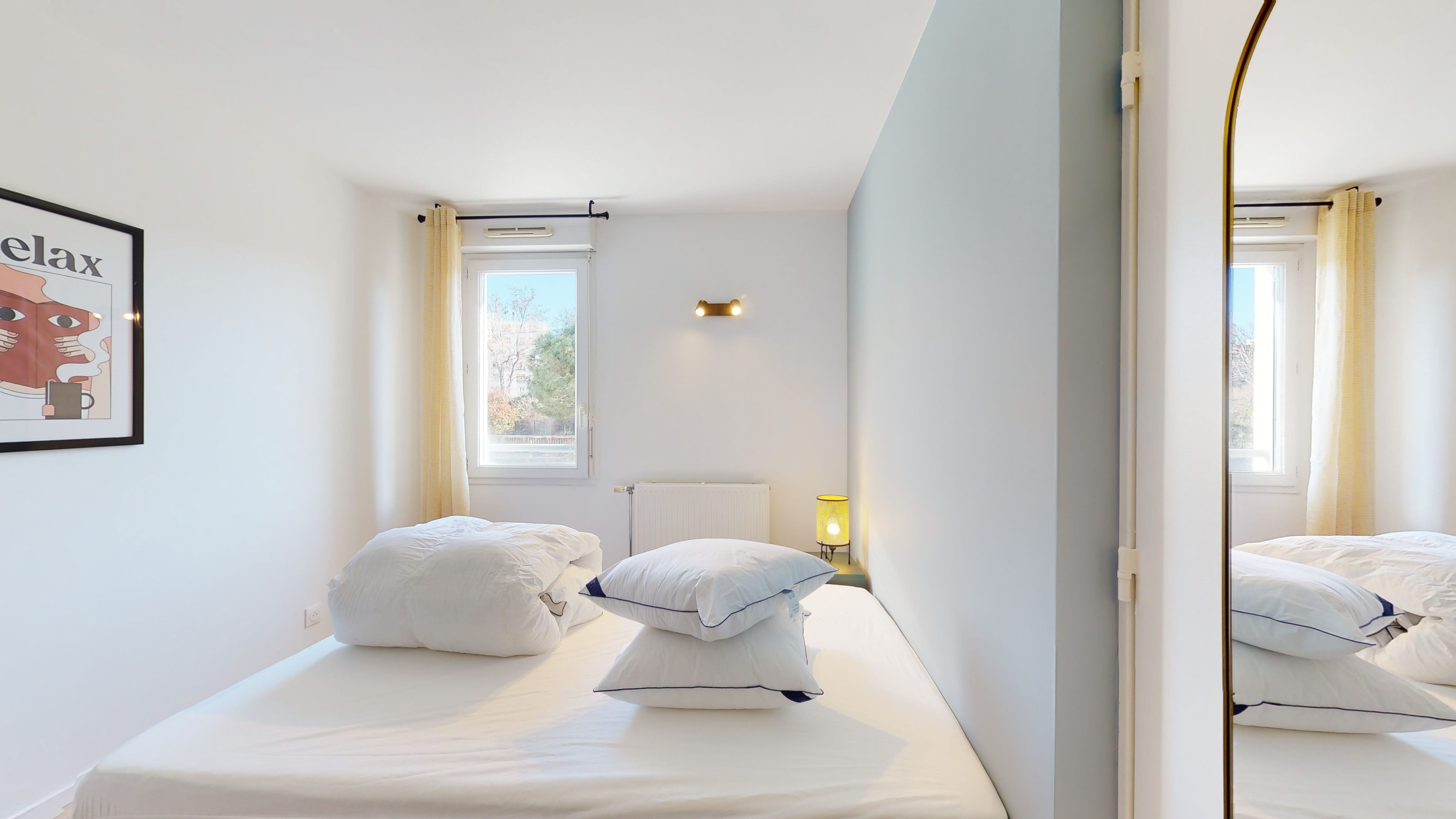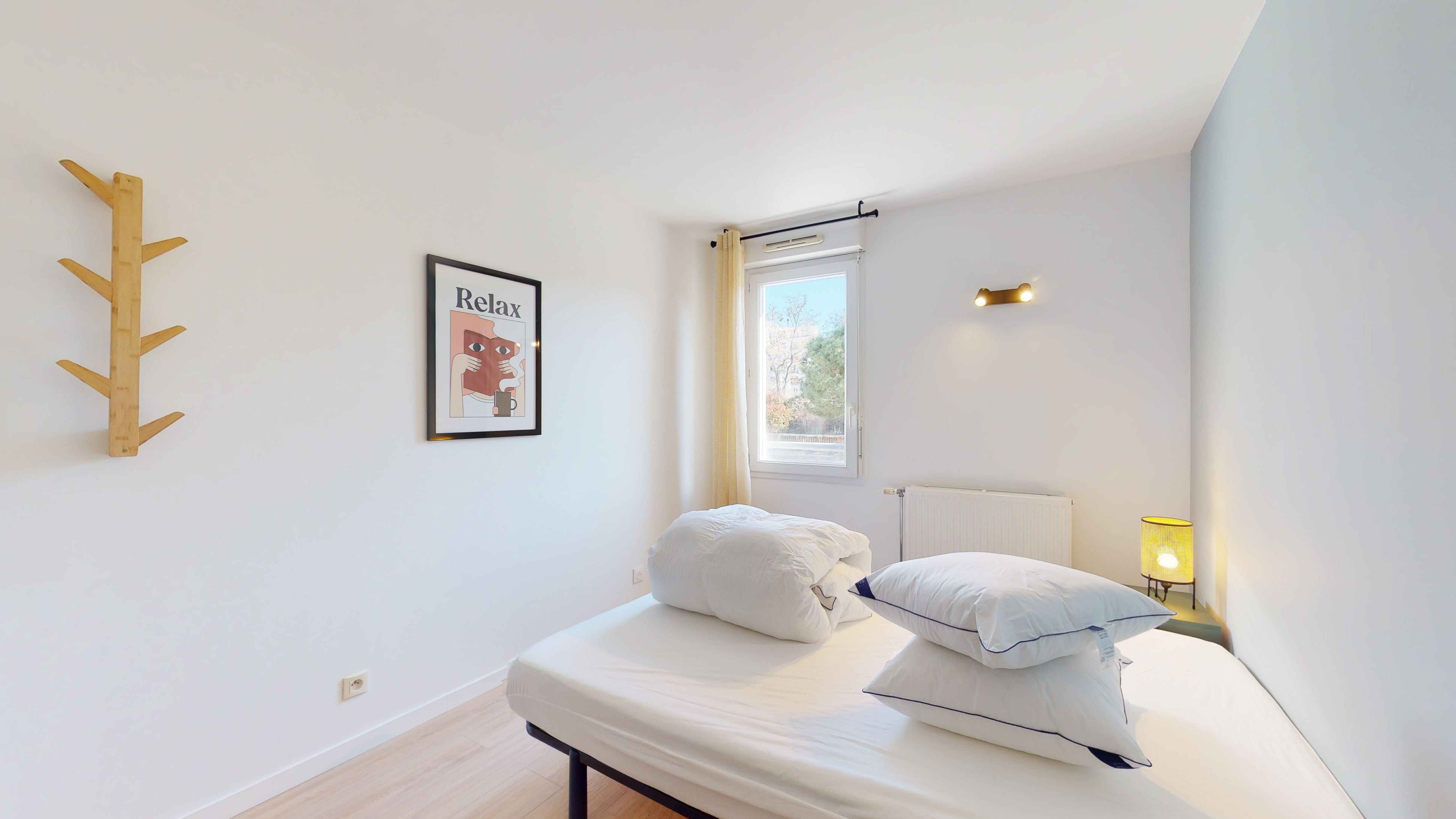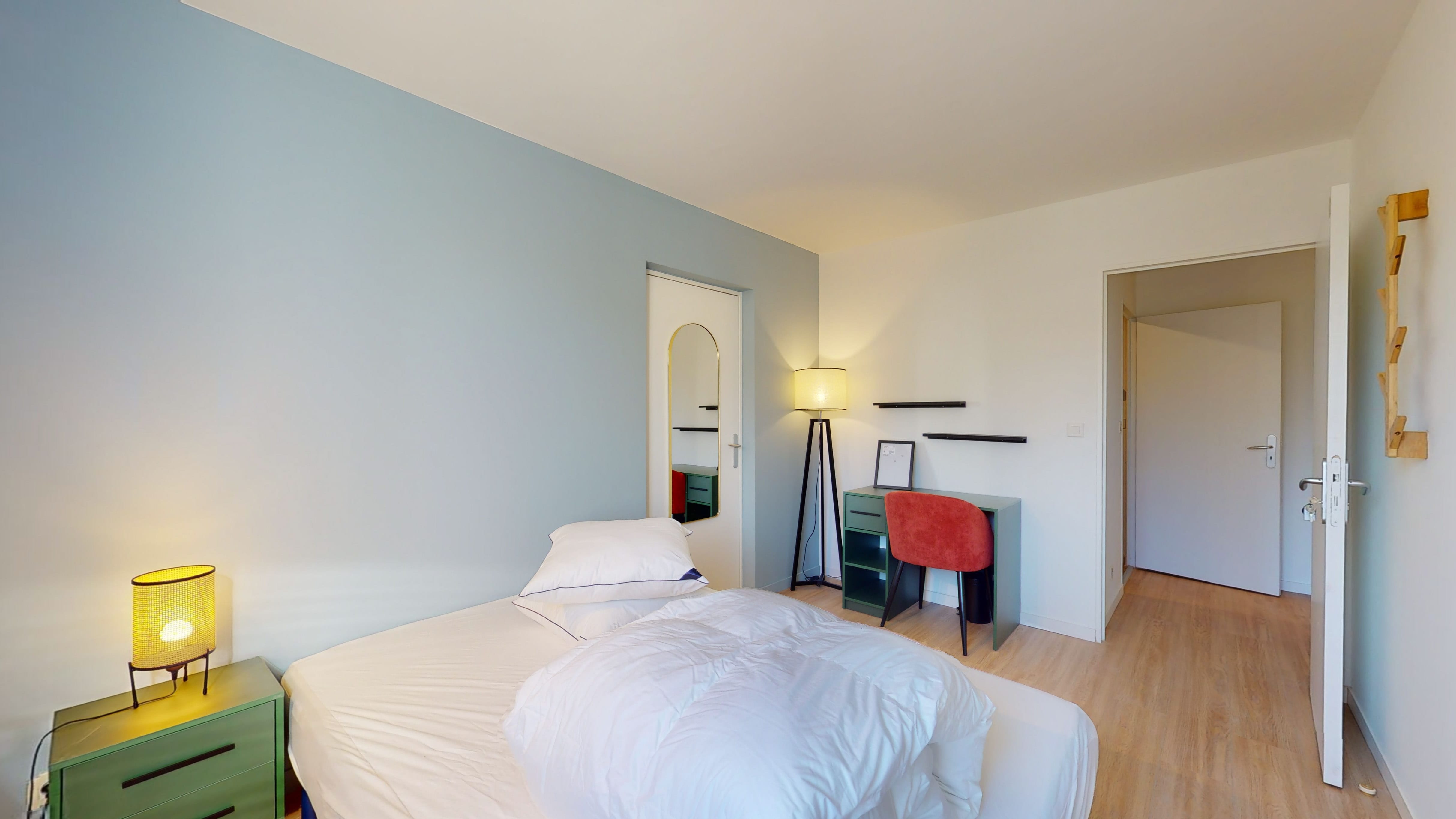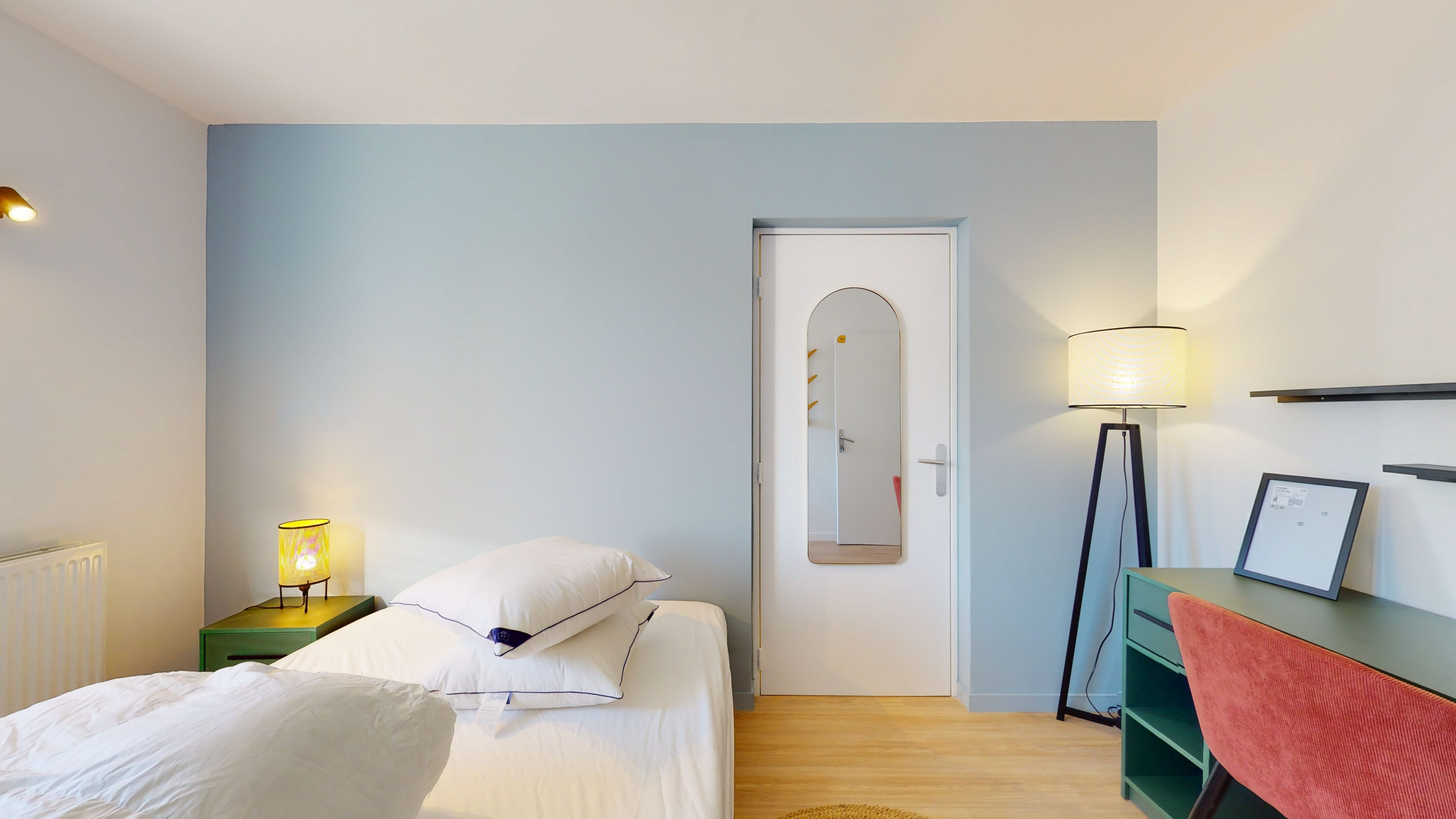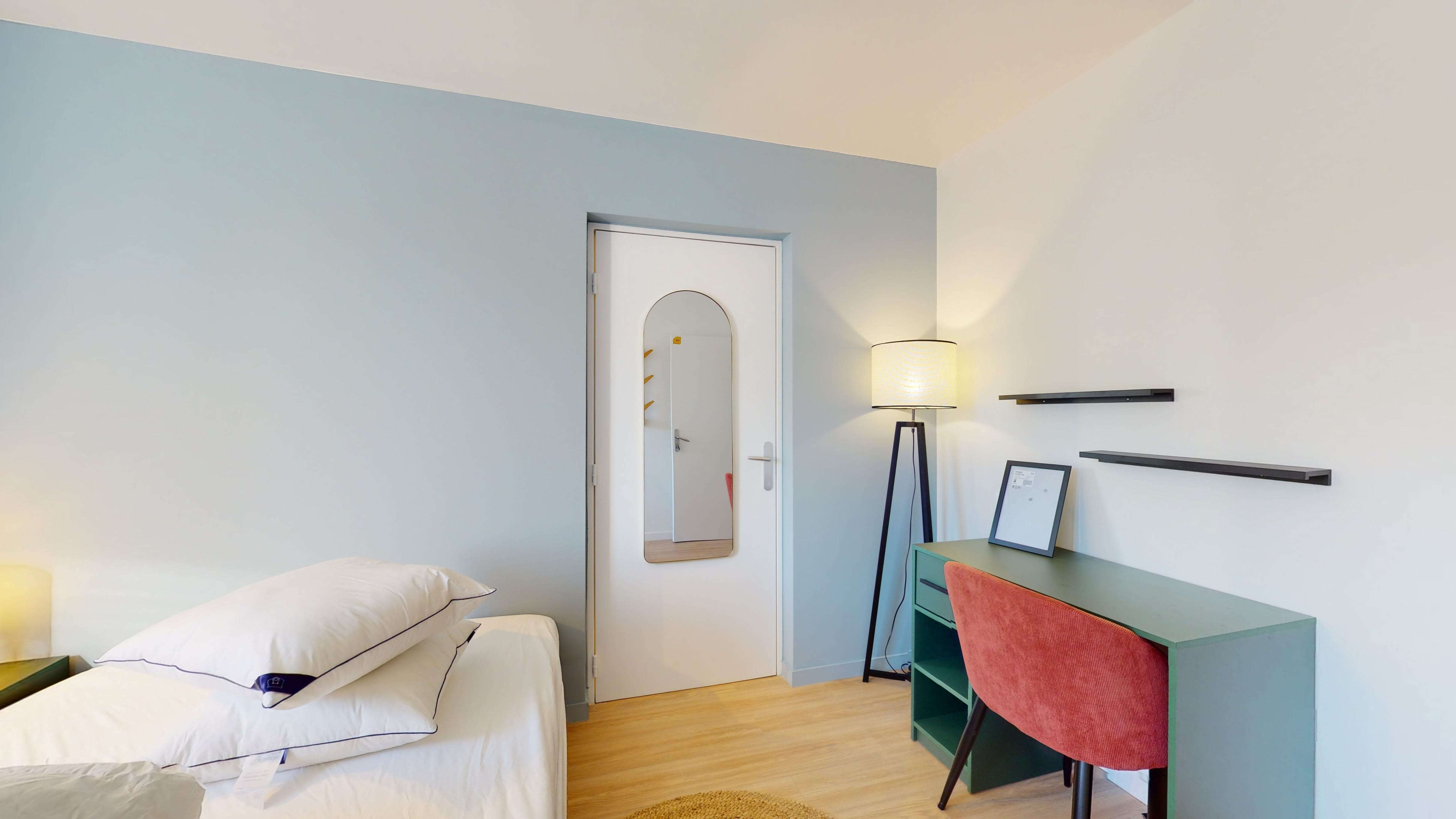 La chambre "Room 2" est conçue spécialement pour une personne. Elle est meublée d'un lit double confortable, d'une armoire pour vos affaires, d'une chaise et d'un bureau pour travailler ou étudier. La chambre partage une salle de bain bien équipée avec les autres locataires. Vous aurez aussi à votre disposition un internet haut débit pour rester connecté.