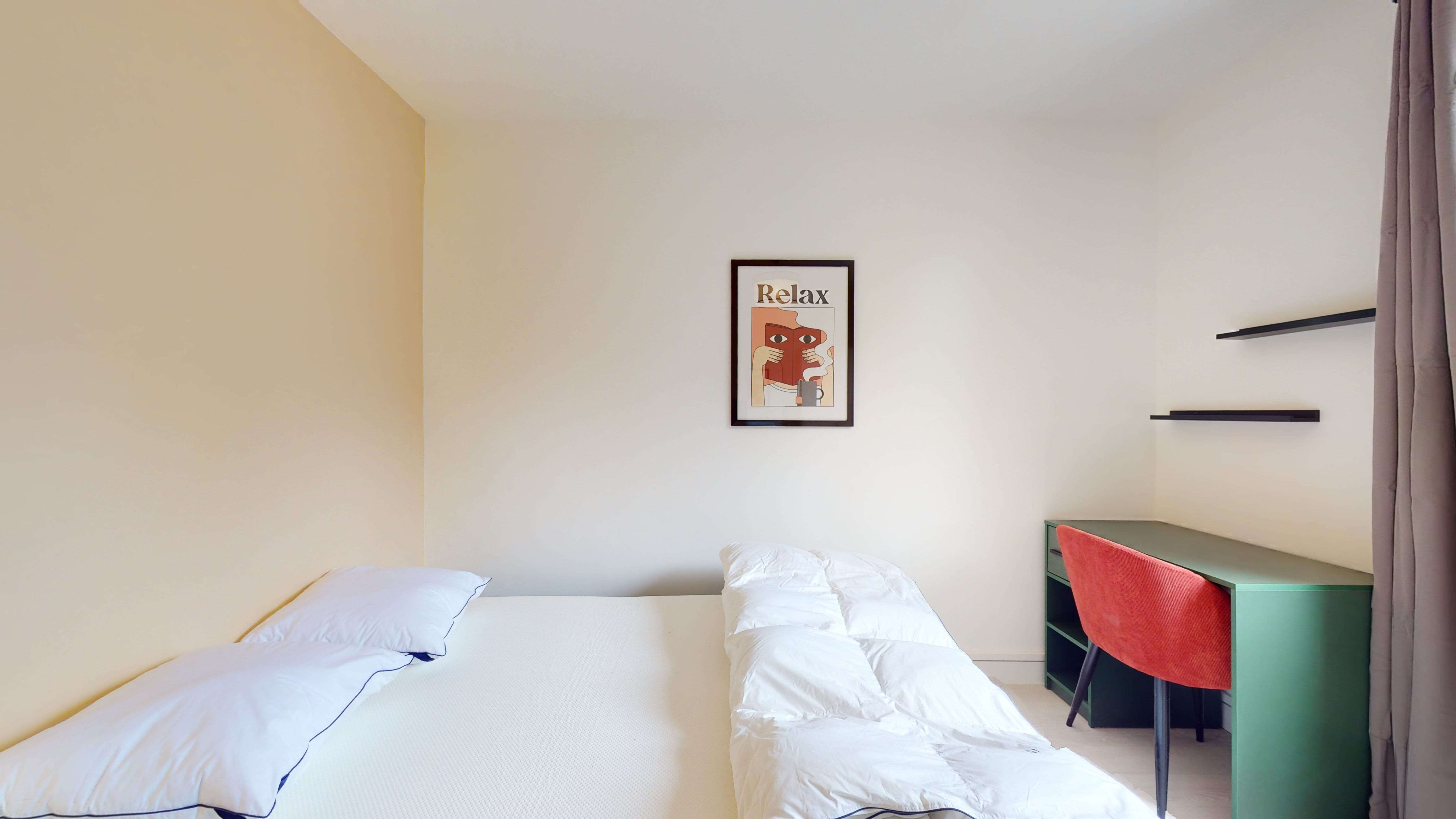 La chambre que nous proposons, Room 3, est parfaite pour une personne. Elle a tout ce dont vous avez besoin : un lit douillet pour bien dormir, une armoire pour ranger vos vêtements, un bureau pour étudier ou travailler et une chaise confortable. La chambre partage une salle de bain propre et moderne avec les autres locataires.